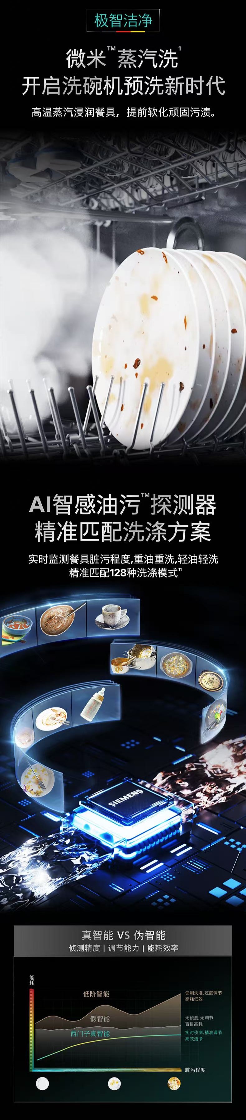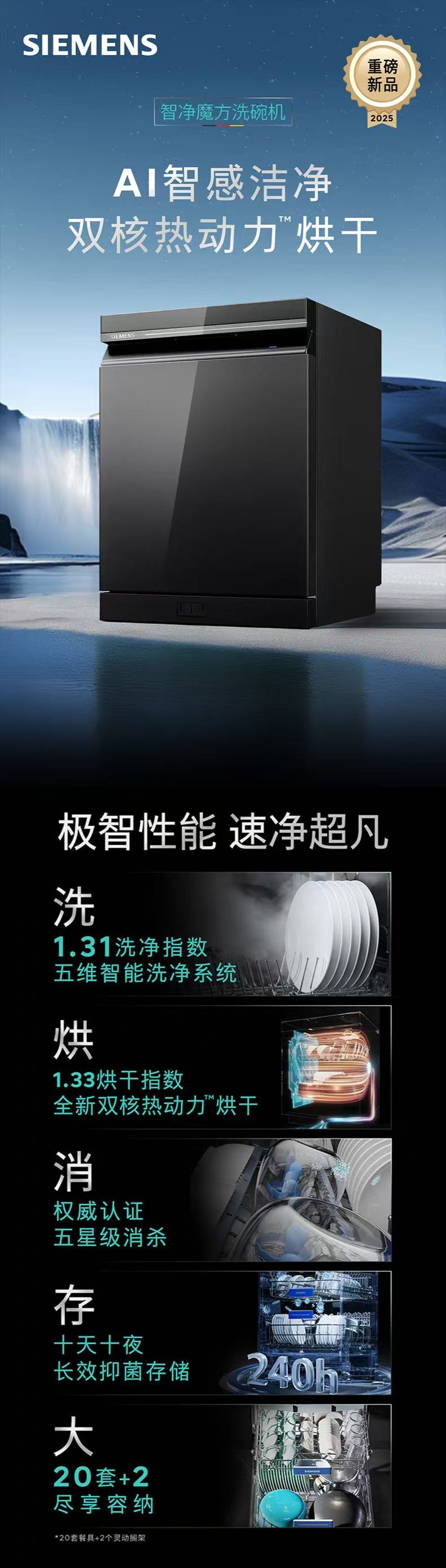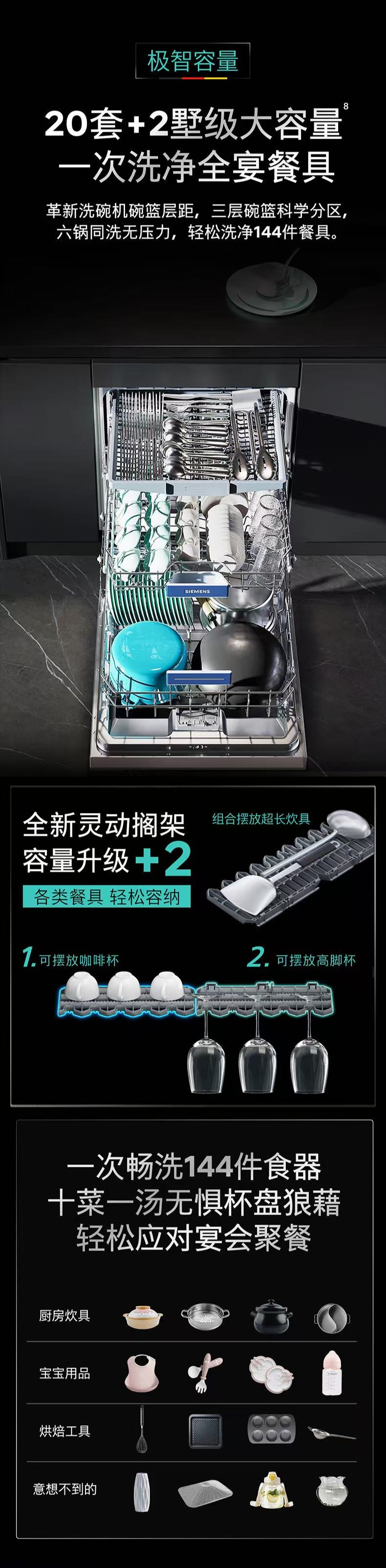 西门子(SIEMENS)【重磅新品】20+2套墅级大容量洗碗机 双核热动力 智感油污240小时长效抑菌存智能互联 SJ43HB66MC