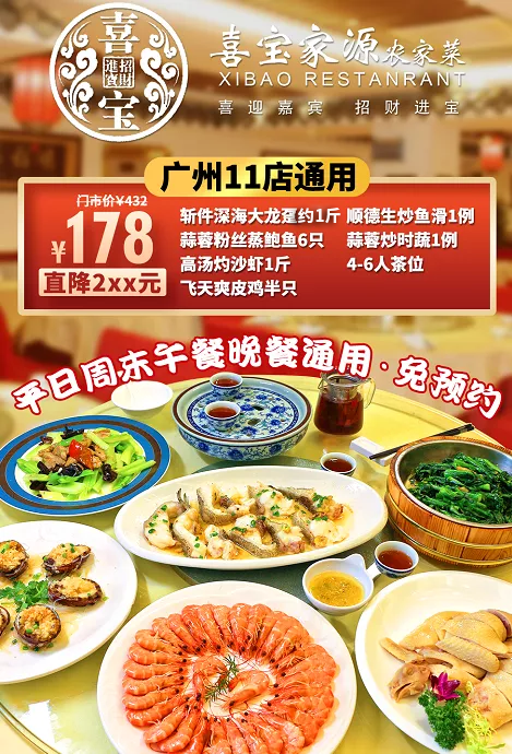 抢购截止日期 6月3日 【喜宝家源·广州11店.免预约】178元抢4-6人海鲜盛宴来袭狂撩你味蕾!清蒸龙趸+鲍鱼+白灼虾+爽皮鸡+小炒+时蔬+茶位