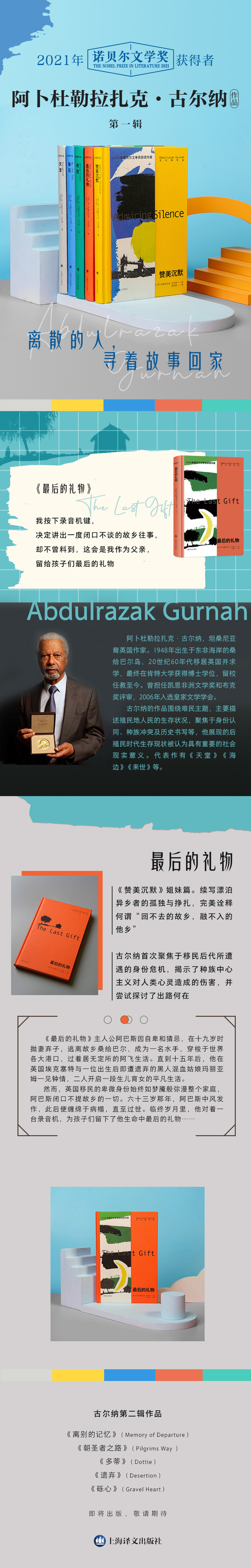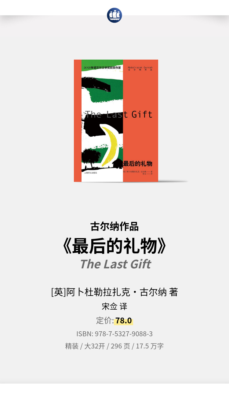 《最后的礼物》是2021年诺贝尔文学奖得主阿卜杜勒拉扎克·古尔纳出版于2011年的作品,也是他的另一部小说《赞美沉默》的姐妹篇。故事讲述了主人公阿巴斯因自卑和猜忌,在十九岁时抛妻弃子,逃离故乡桑给巴尔,成为一名水手,穿梭于世界各大港口,过着居无定所的阿飞生活。直到十五年后,他在英国埃克塞特与一位出生后即遭遗弃的黑人混血姑娘玛丽亚姆一见钟情,二人决定在诺里奇定居,开启一段生儿育女的平凡生活。