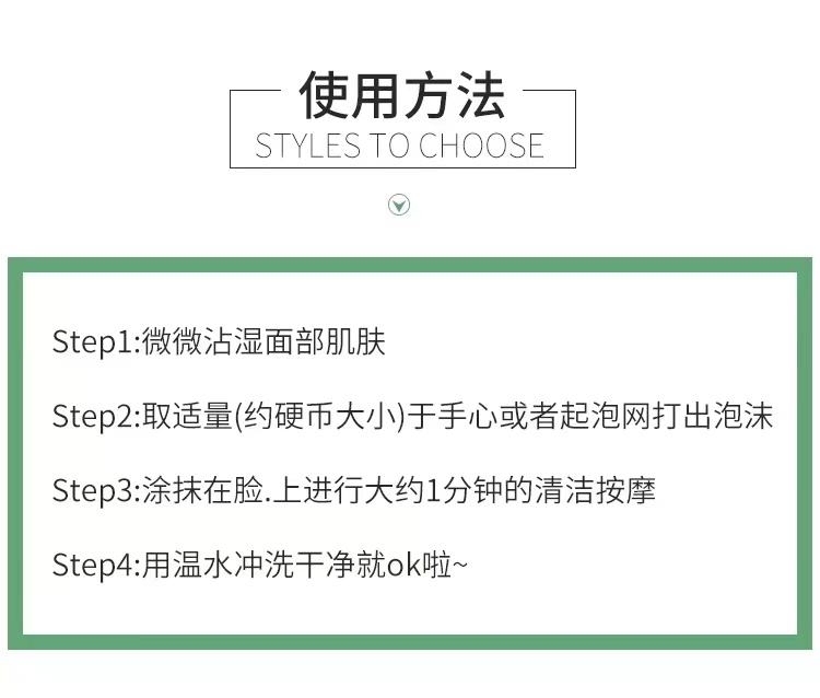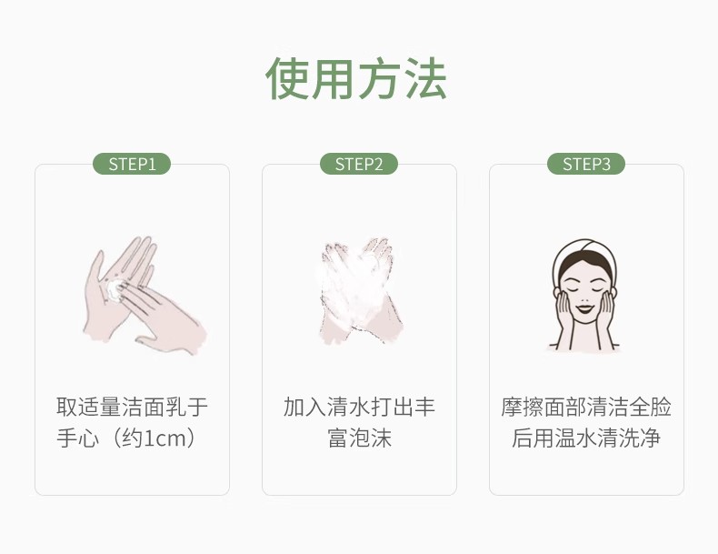 取1-2泵于掌心,将泡沫轻柔画圈按摩于湿润肌肤上,清水洗净即可。