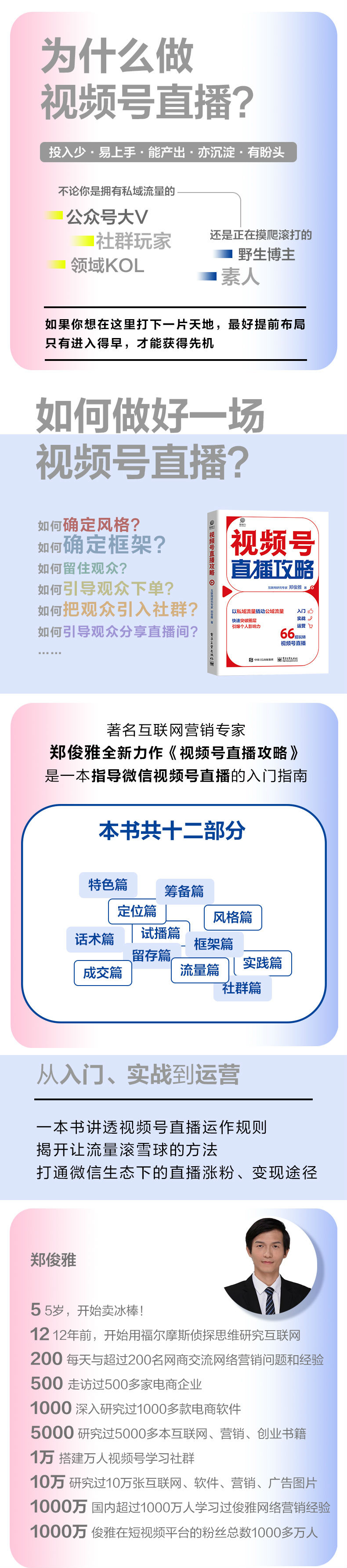 《视频号直播:生于社交链的流量池》是著名互联网营销专家郑俊雅继畅销书《68招玩转视频号》《网络营销168招》《128招玩转抖音》《108招玩转快手》后全新打造的一本旨在指导微信视频号直播的入门指南。本书共十二部分,分别为特色篇、定位篇、筹备篇、试播篇、风格篇、框架篇,实践篇、话术篇、留存篇、成交篇、流量篇、社群篇。