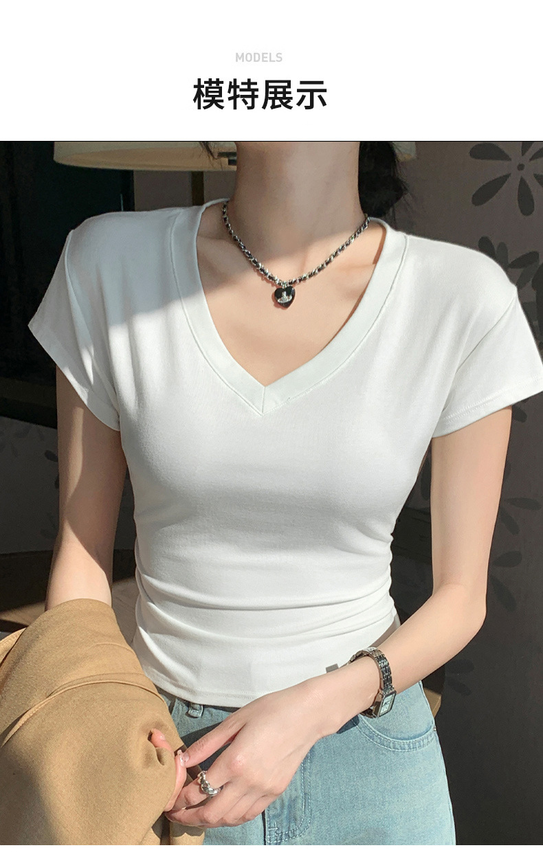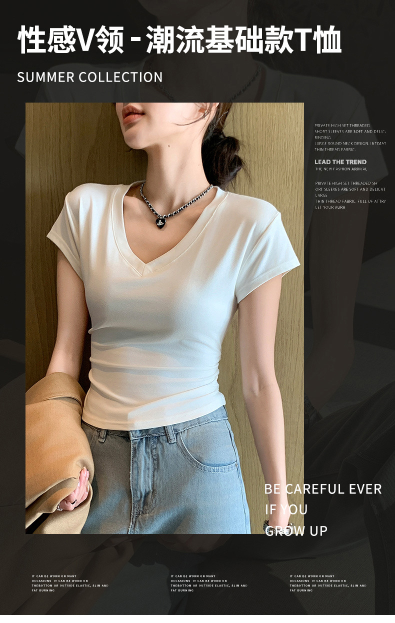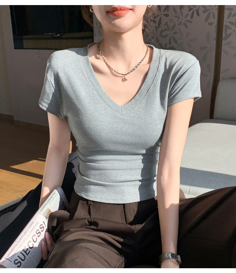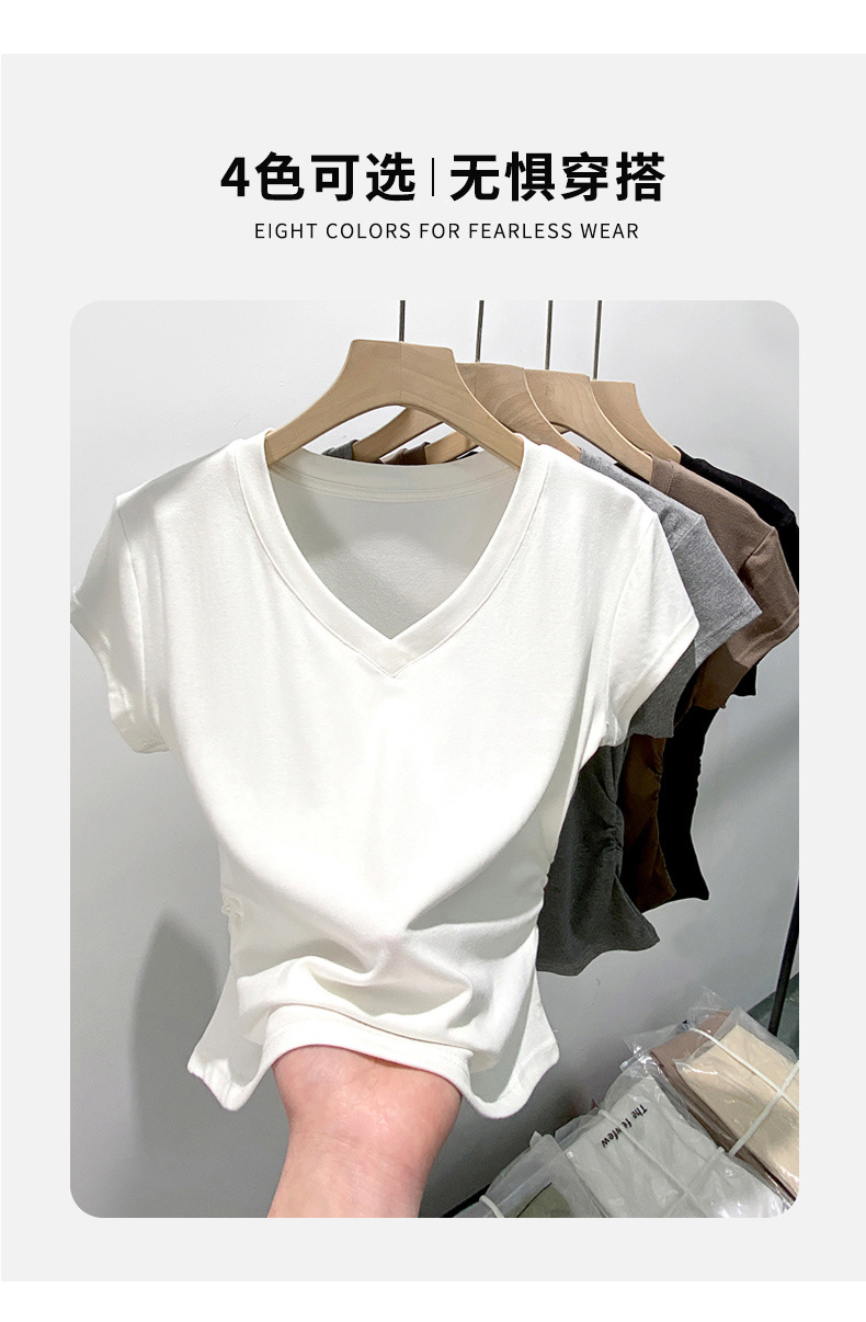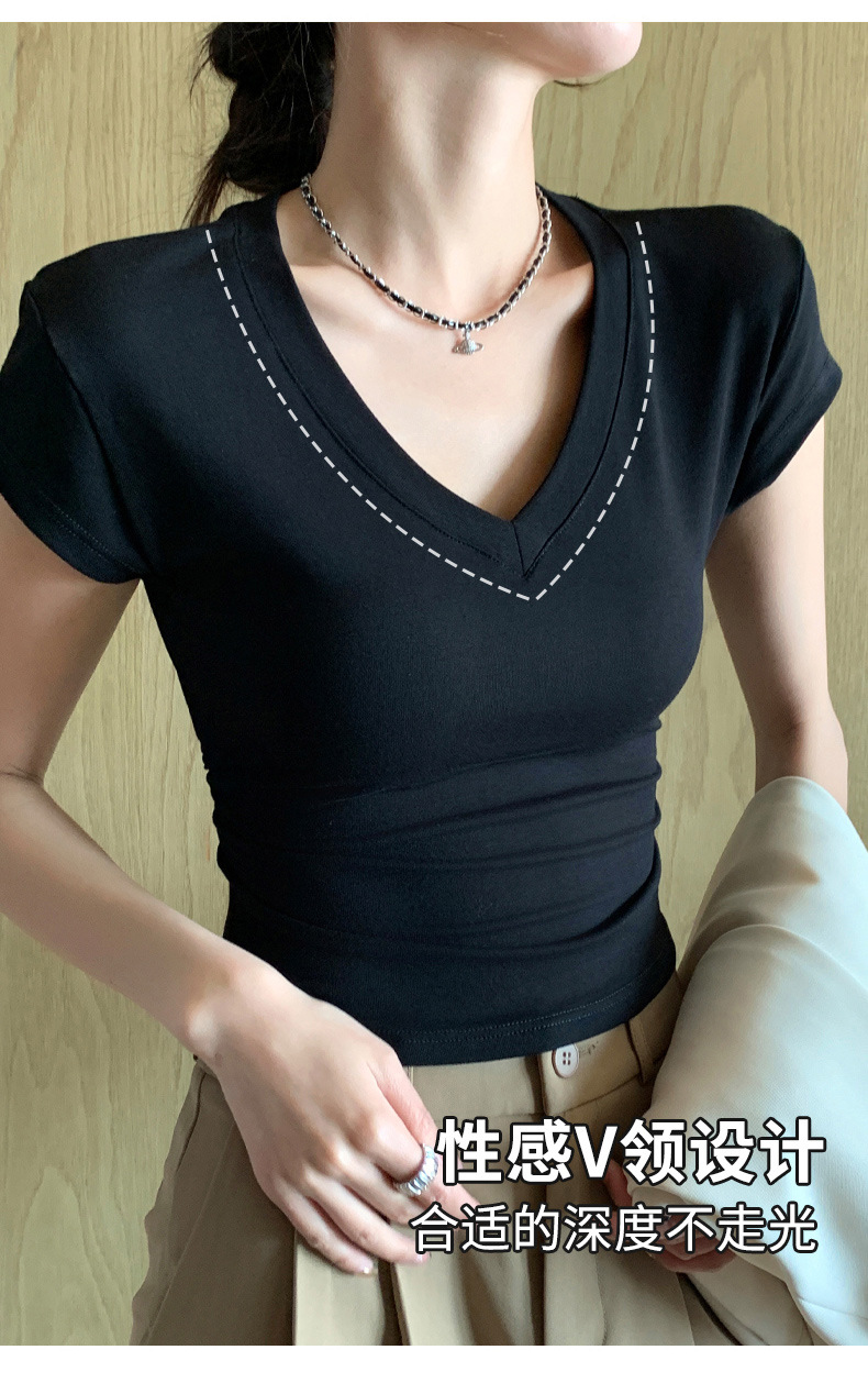 8302夏装新款修身正肩V领短袖T恤女百搭收腰显瘦高级感上衣小众款