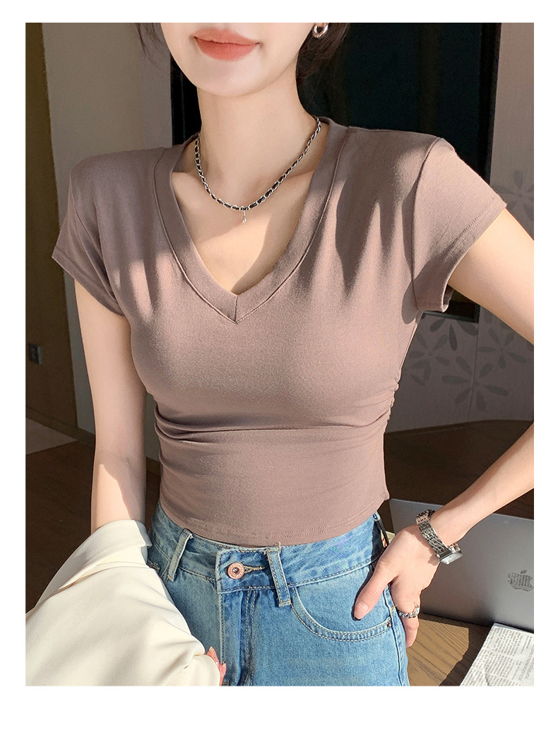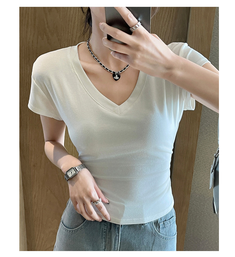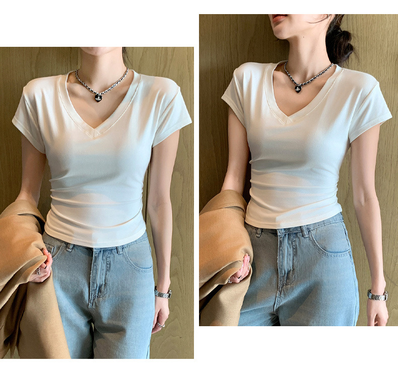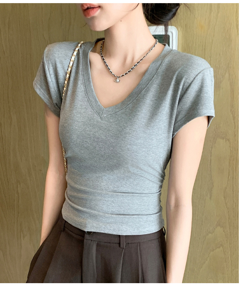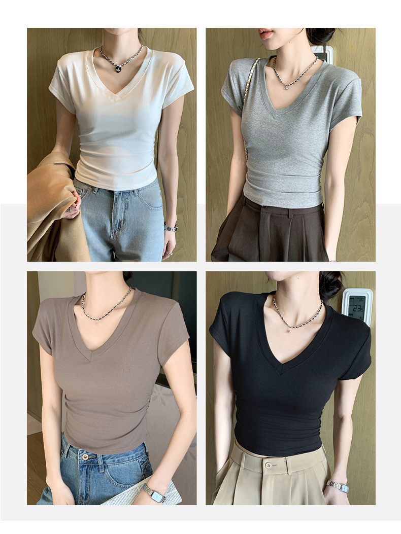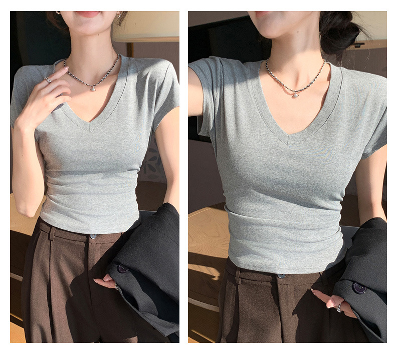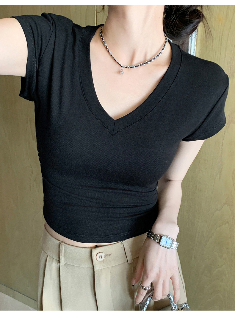 8302夏装新款修身正肩V领短袖T恤女百搭收腰显瘦高级感上衣小众款