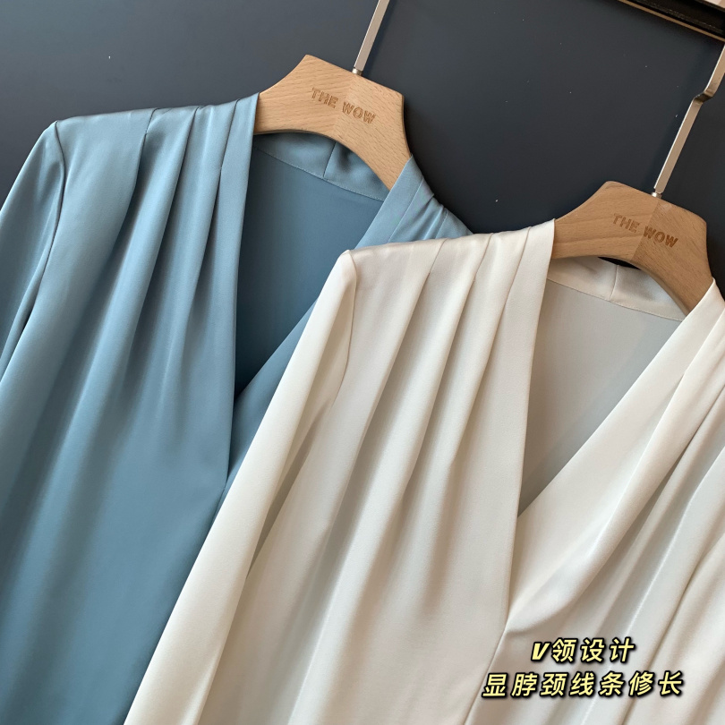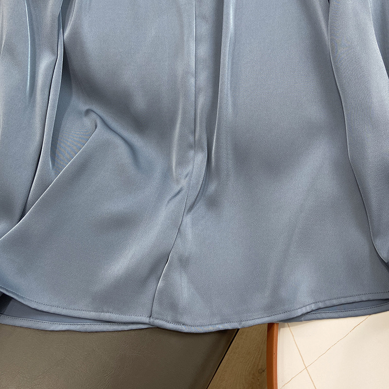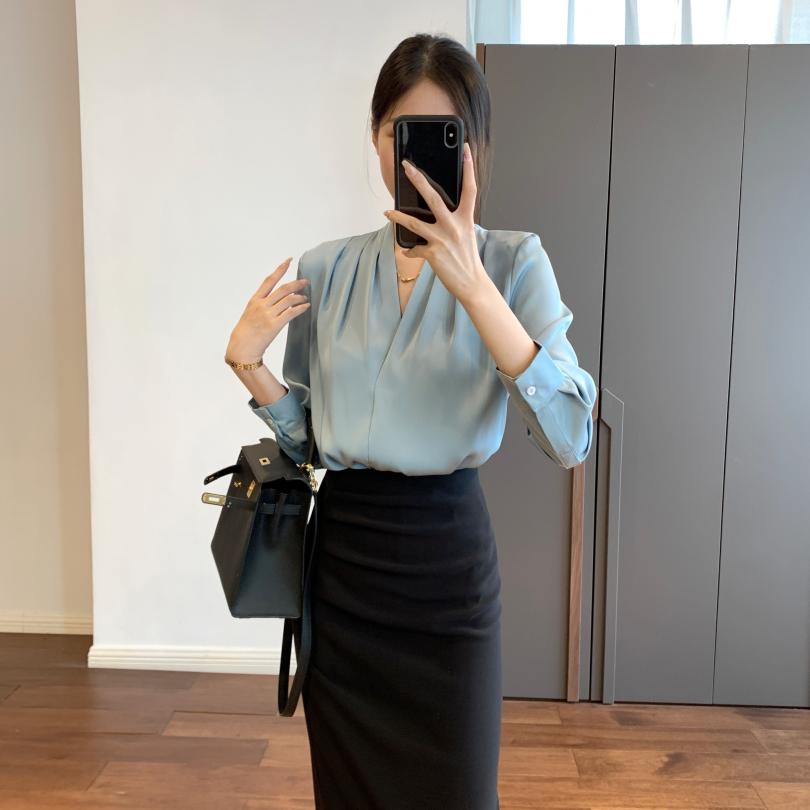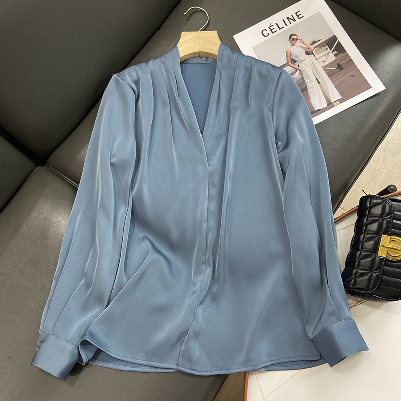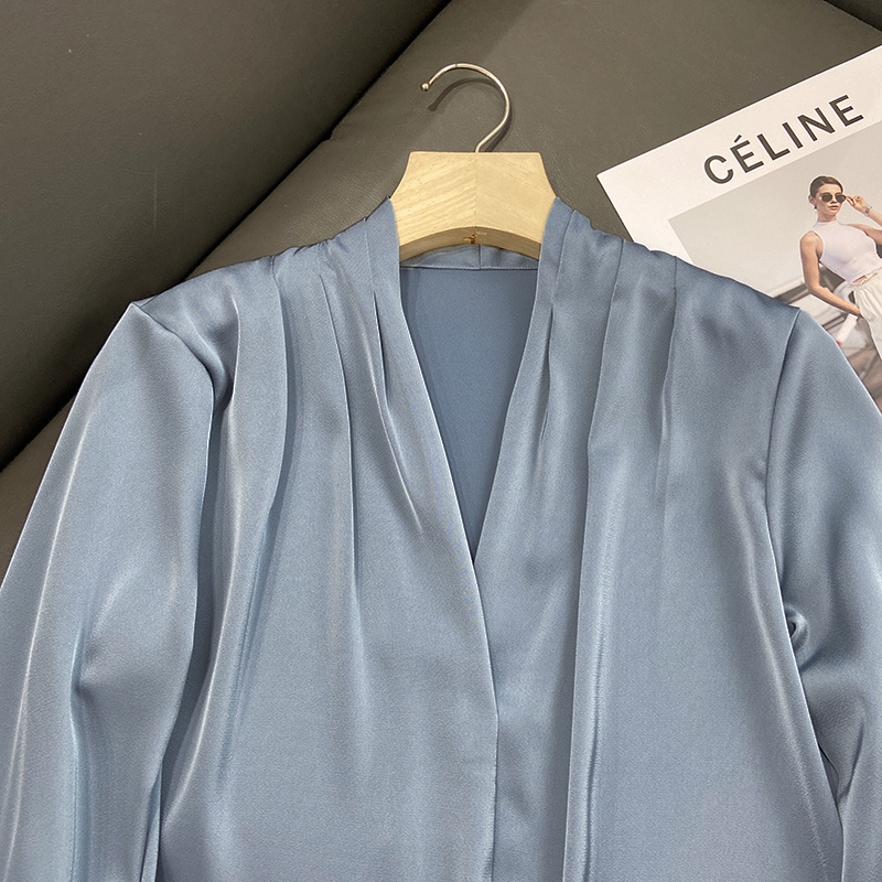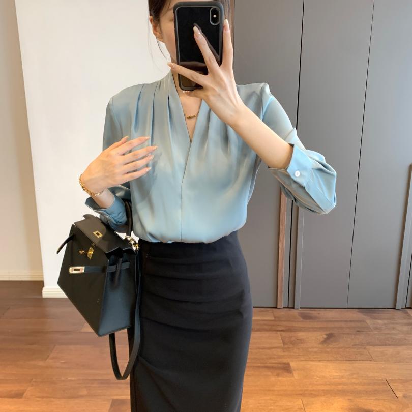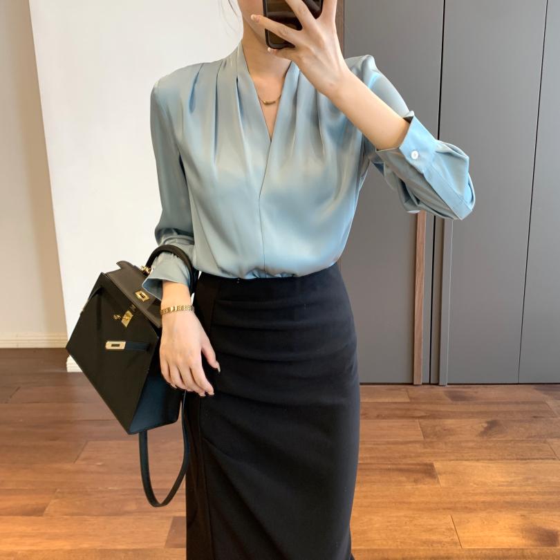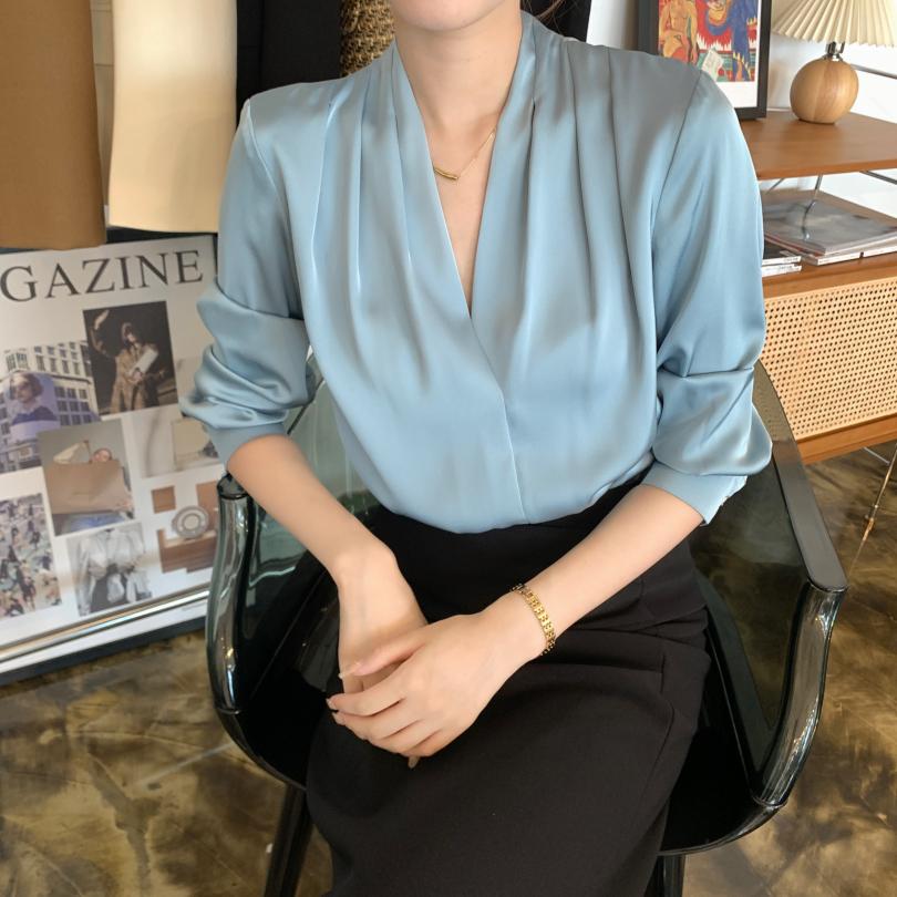 【商品名称】法式温婉柔软亲肤光泽感V领两侧褶皱衬衫