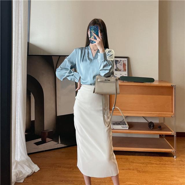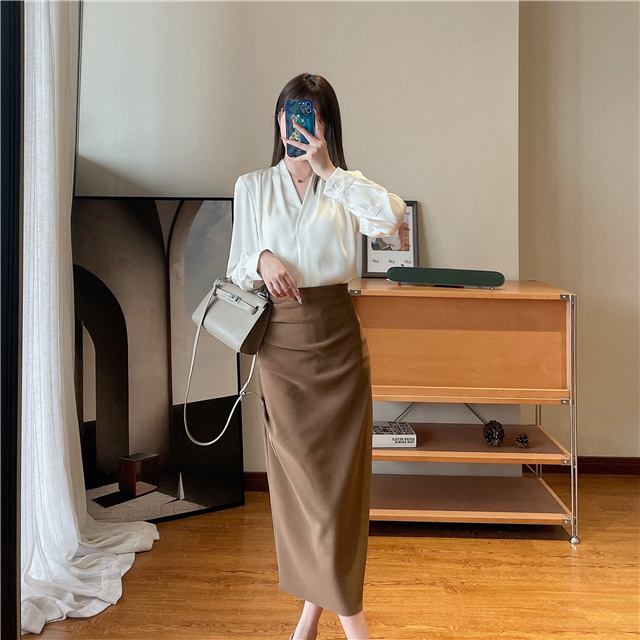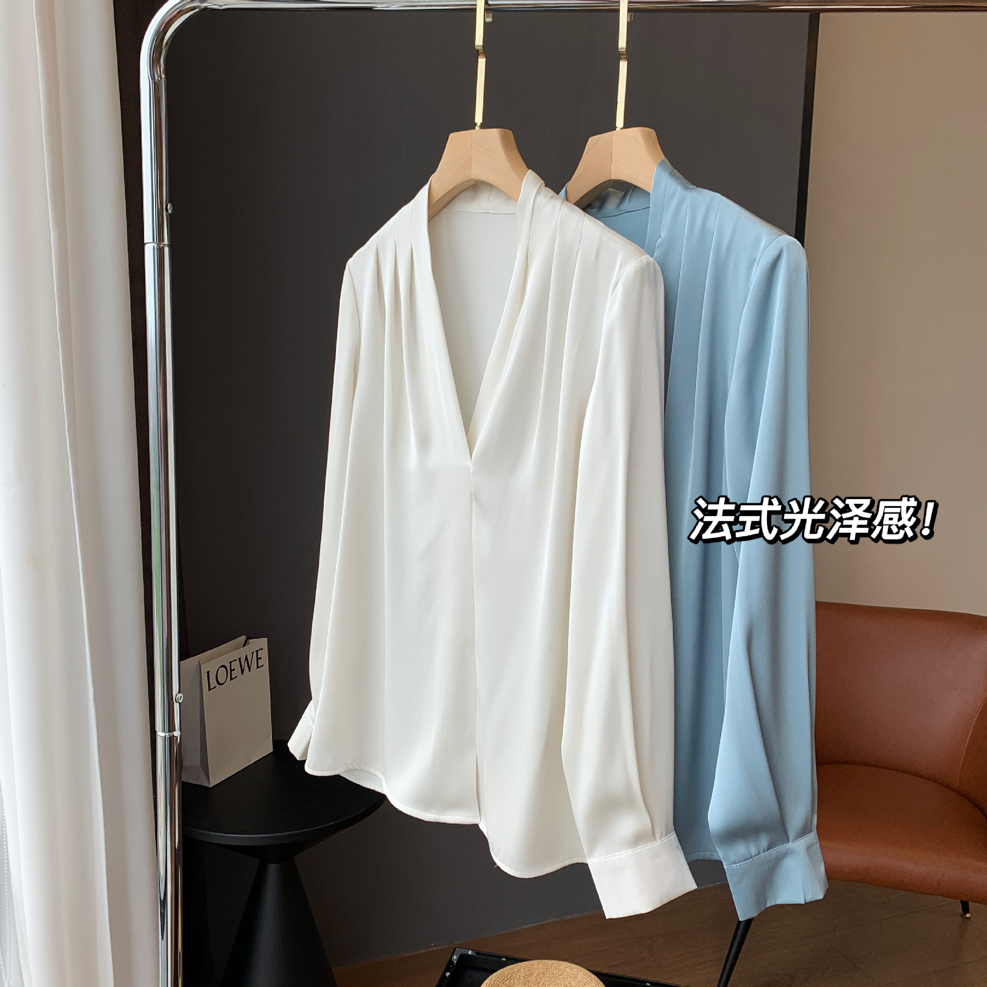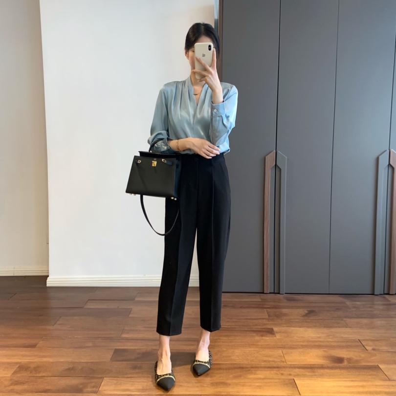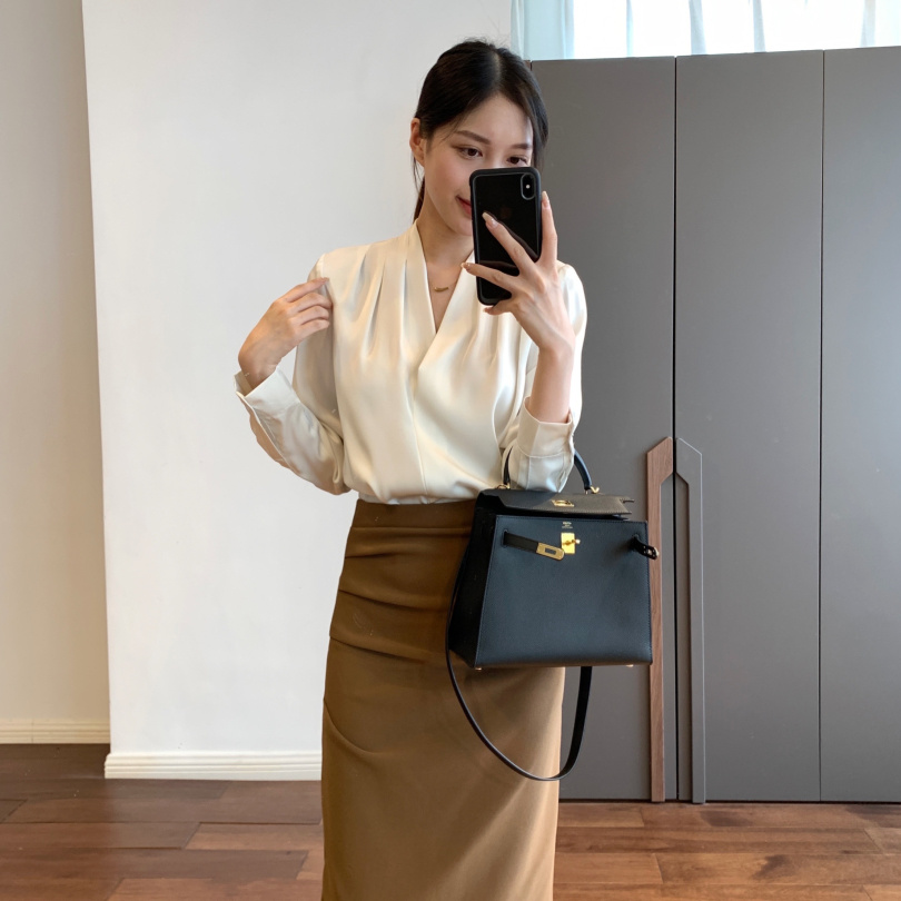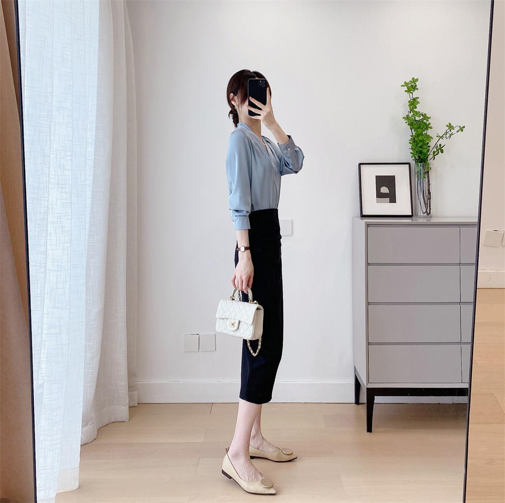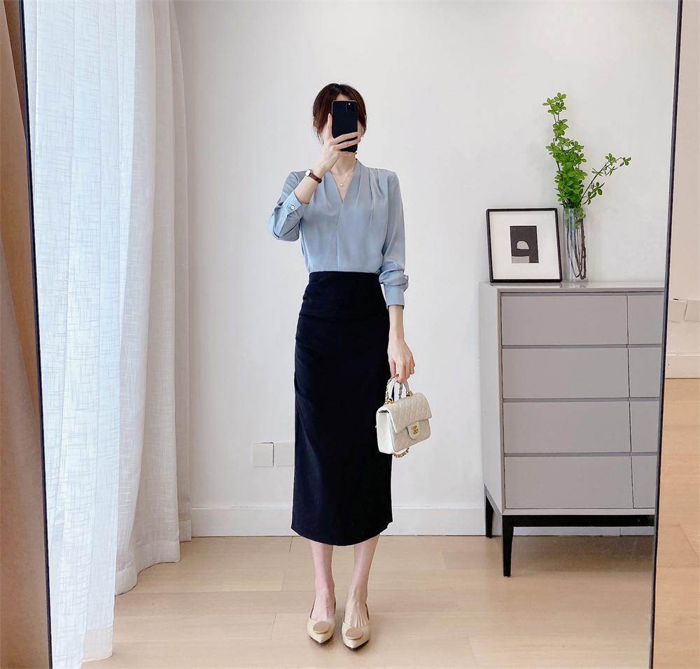 【商品名称】法式温婉柔软亲肤光泽感V领两侧褶皱衬衫