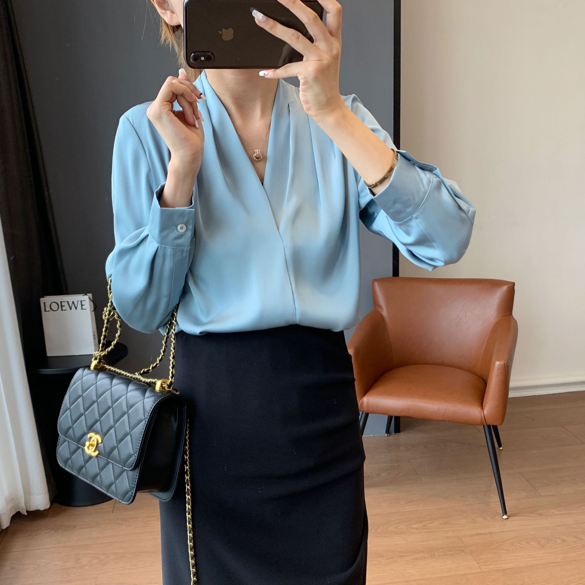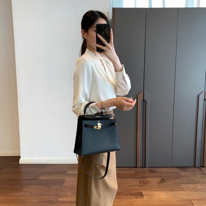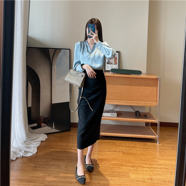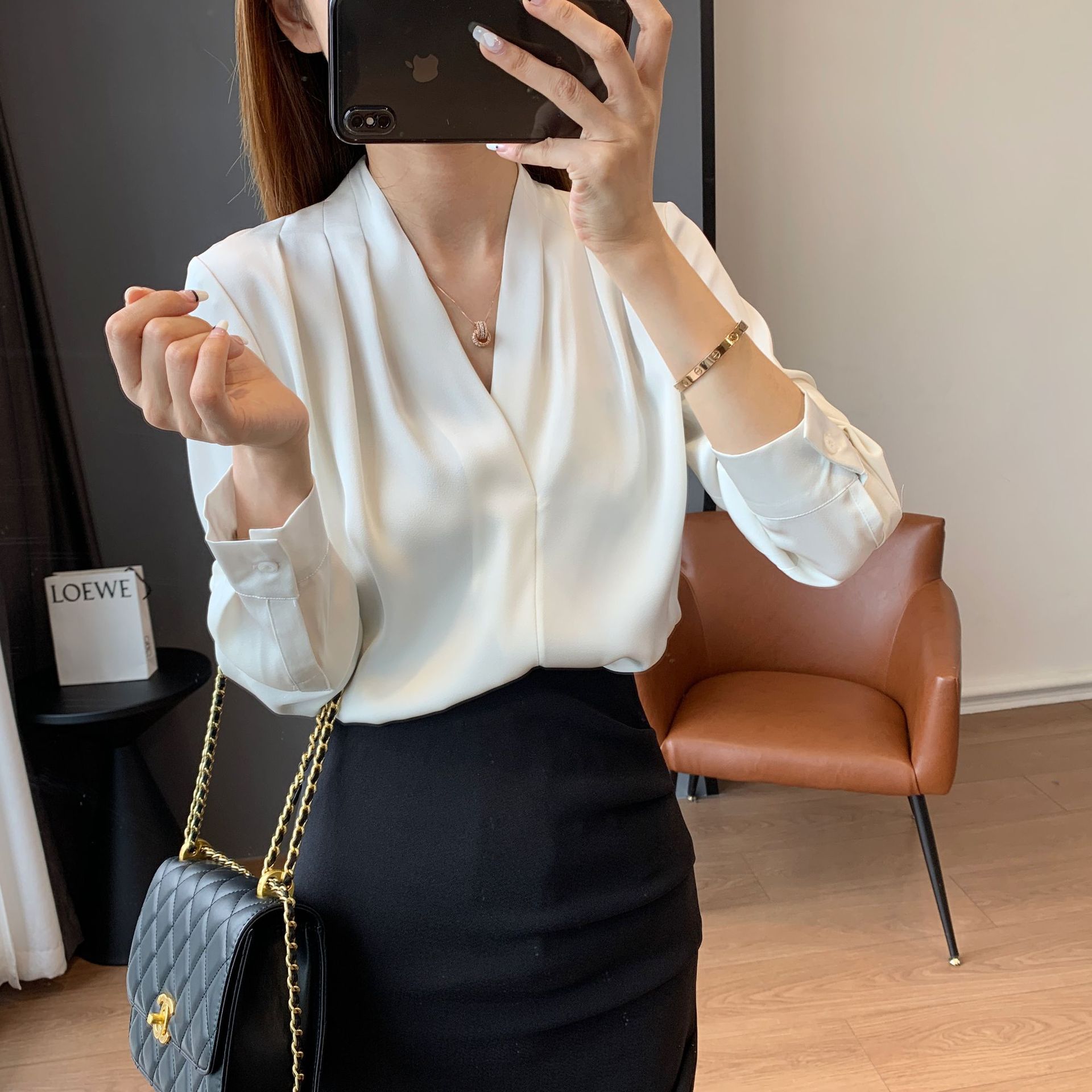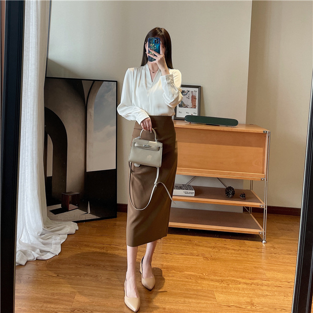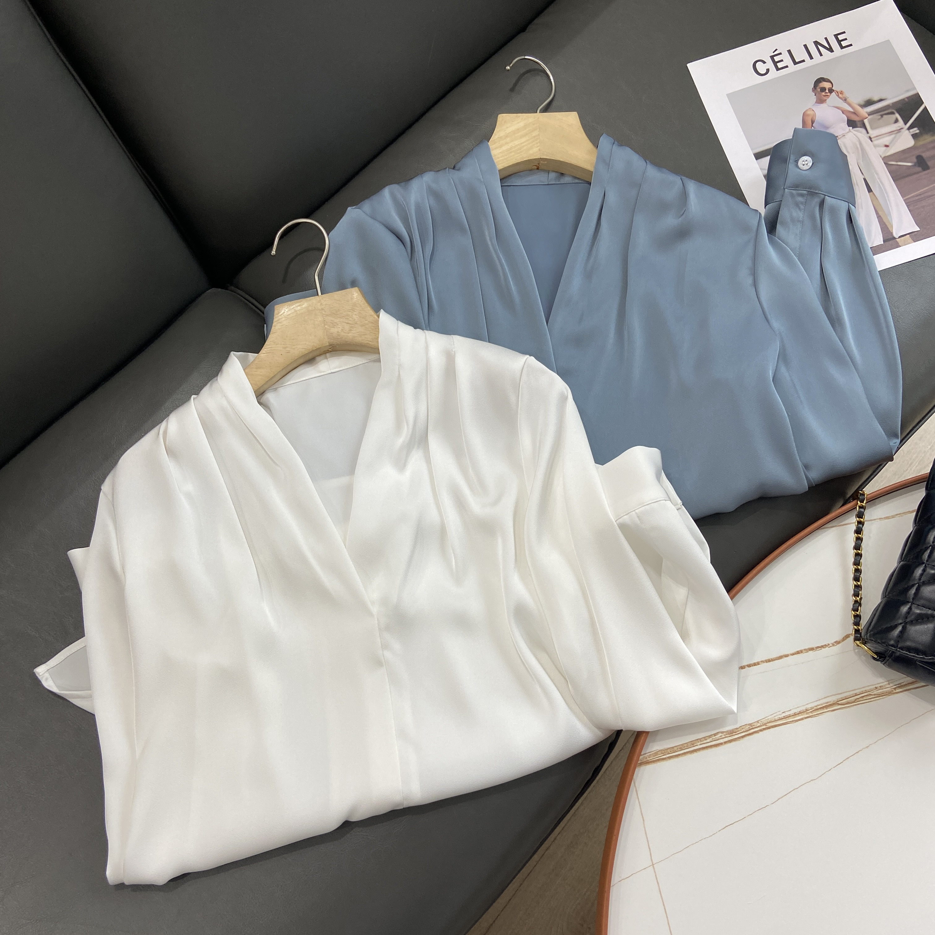 【商品名称】法式温婉柔软亲肤光泽感V领两侧褶皱衬衫