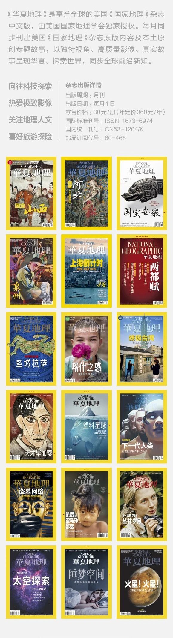- 美国《国家地理》中文版(《华夏地理》杂志)由美国国家地理学会独家授权。每月同步刊出美国《国家地理》杂志原版内容及本土原创专题故事,以独特视角、高质量影像、真实故事呈现华夏、探索世界,同步全球前沿新知。