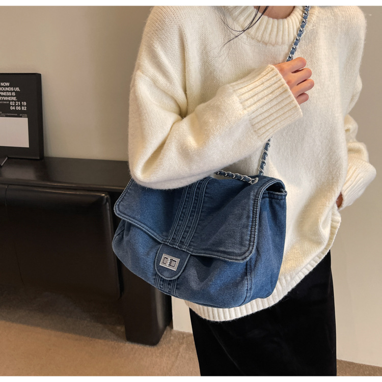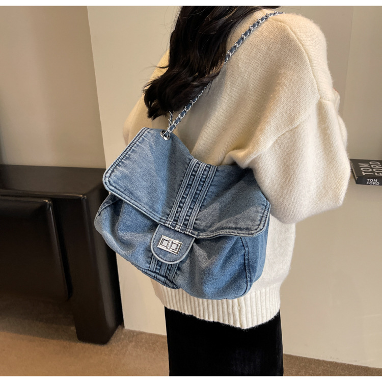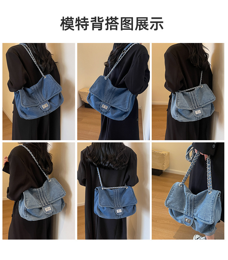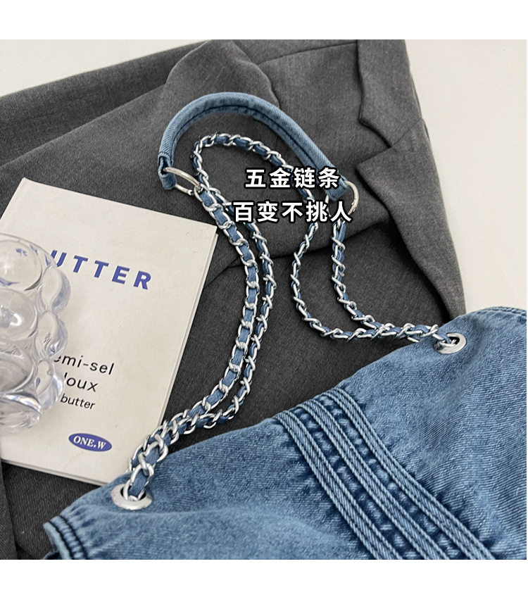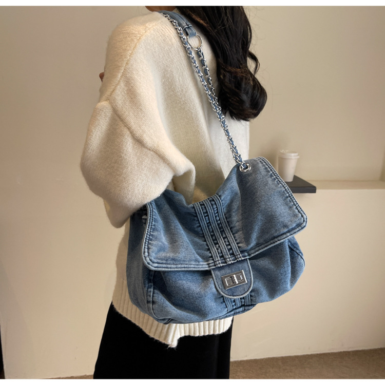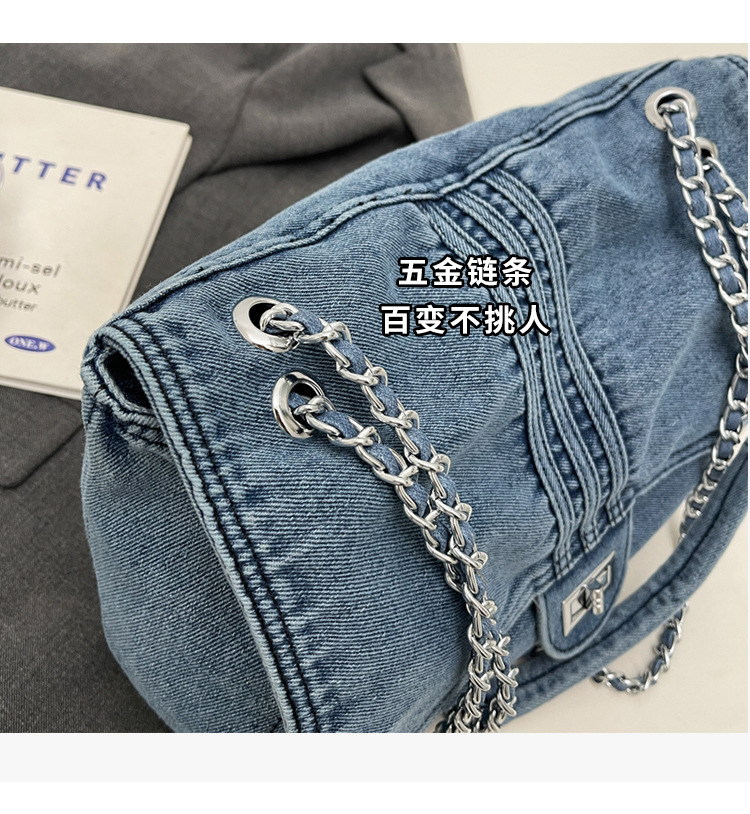 复古休闲牛仔布托特包包女 2024秋新款大容量链条高级感单肩斜挎包