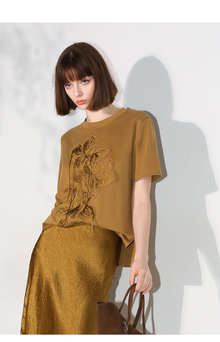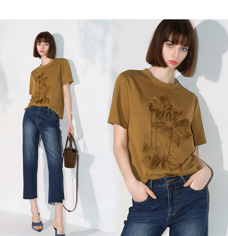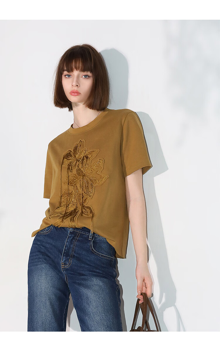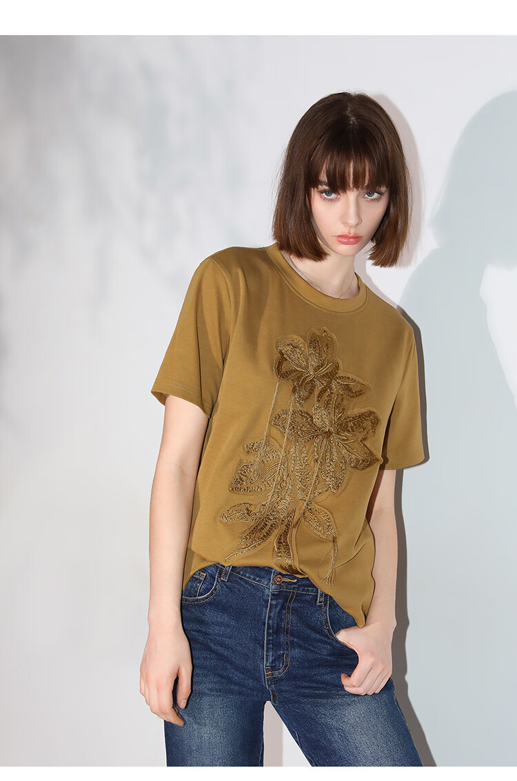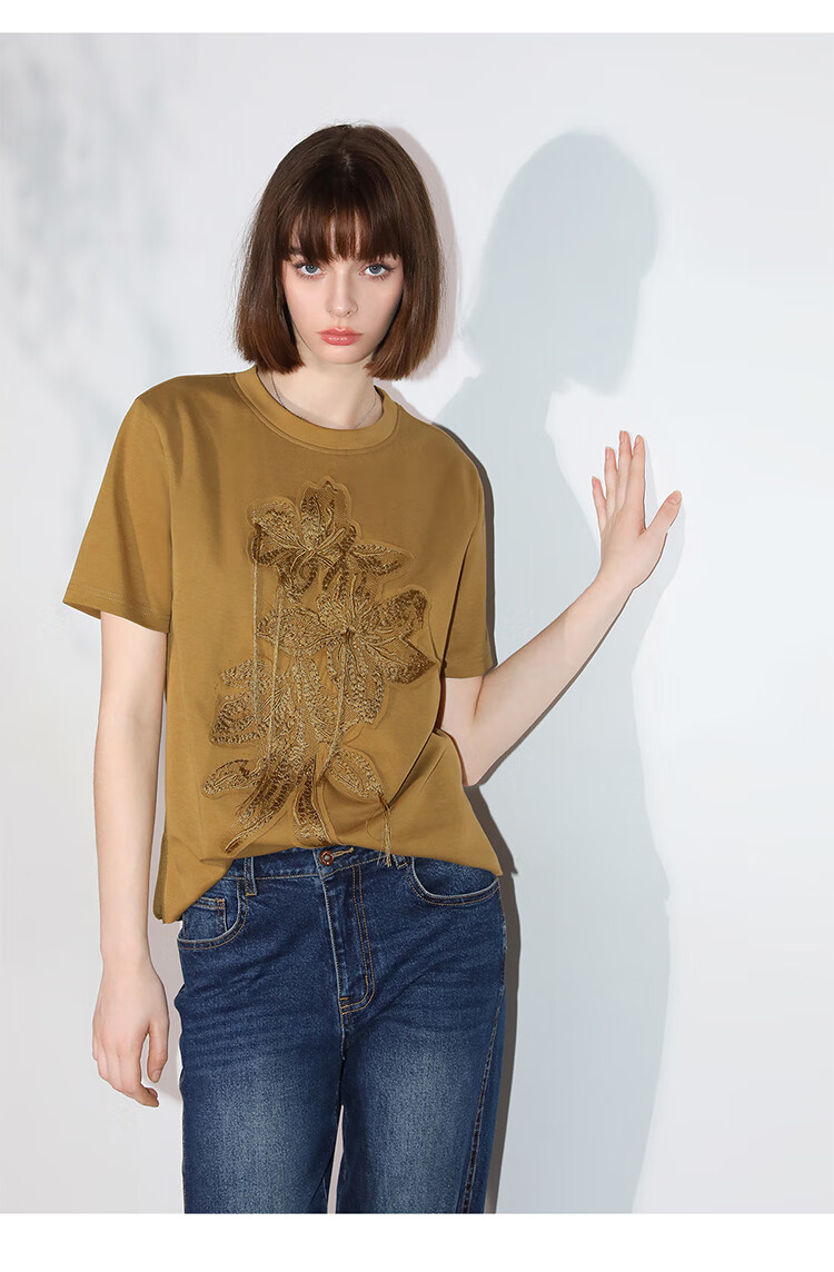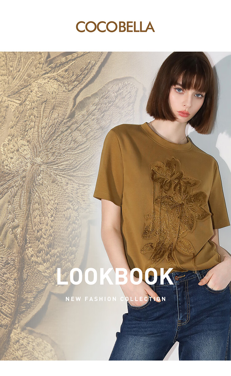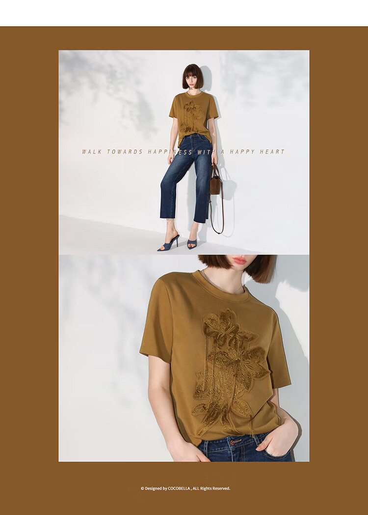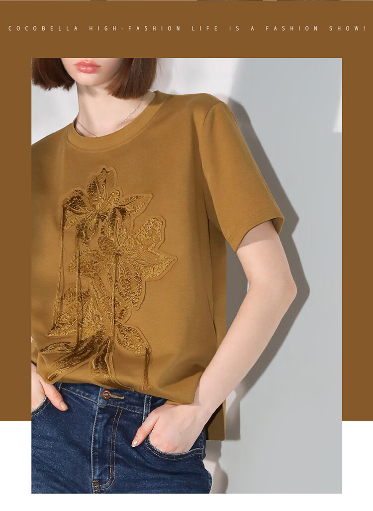 COCOBELLA立体回针流苏刺绣短袖T恤女质感通勤圆领上衣TS3012