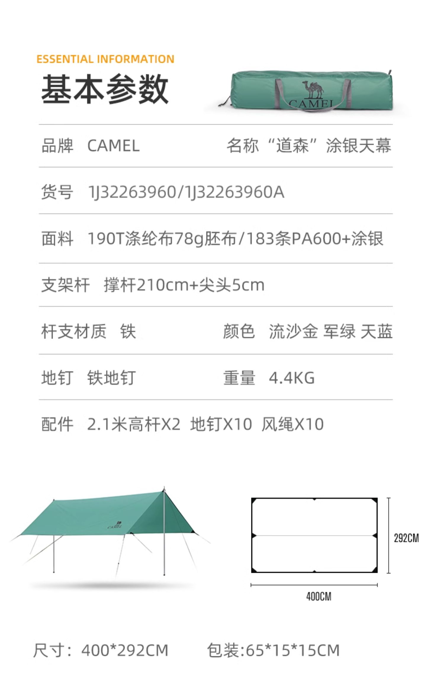 骆驼天幕户外露营帐篷野营遮阳防风懒人简易搭建 1J32263960A
