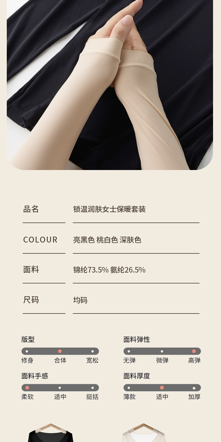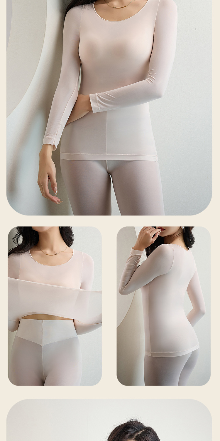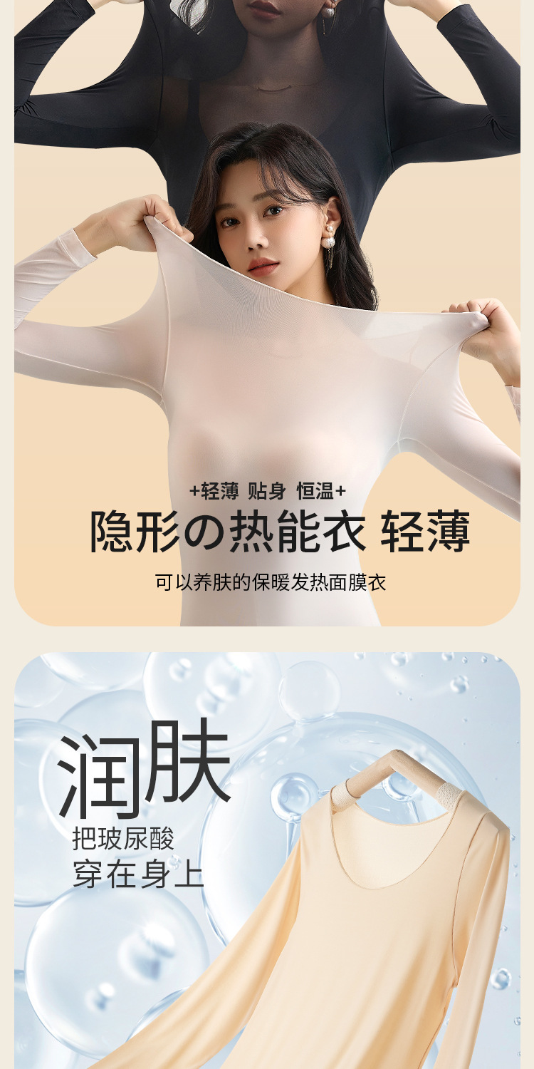 【秋冬必备,保暖恒温!】质地轻盈透薄,宛如第二层肌肤。圆领设计优雅迷人,不挑身材,wan美贴合身形。玻尿酸美肤衣内含珍贵成分,为您打造水嫩光滑肌肤。隐形套装设计,贴身舒适,毫无束缚感!