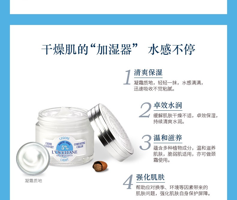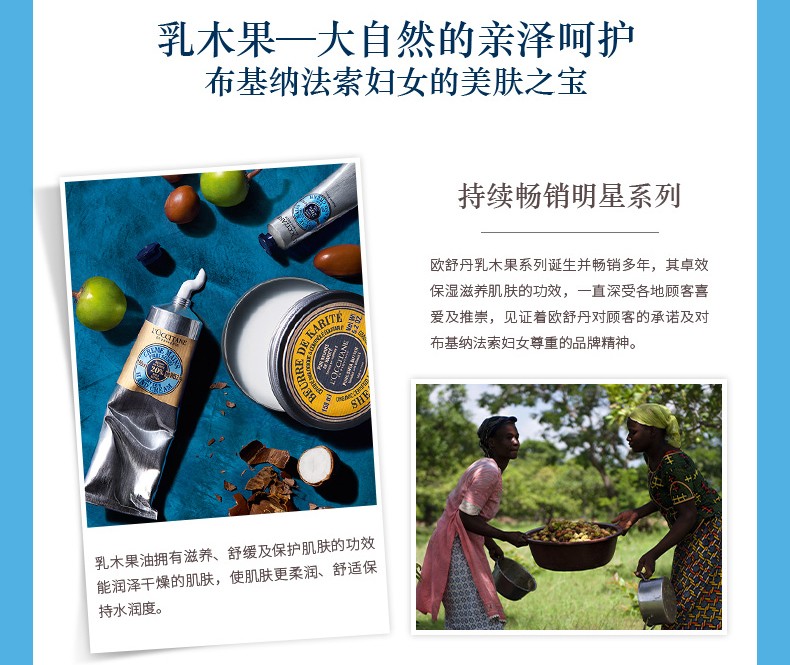 持续畅销明星系列;乳木果拥有滋养、舒缓及保护肌肤的功效能润泽干燥的肌肤,使肌肤更柔润、舒适,保持水润度.