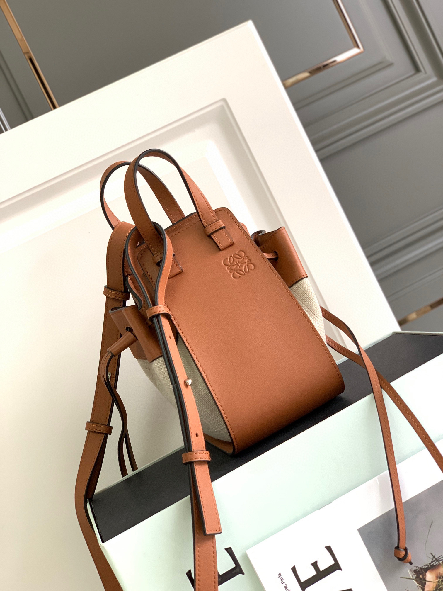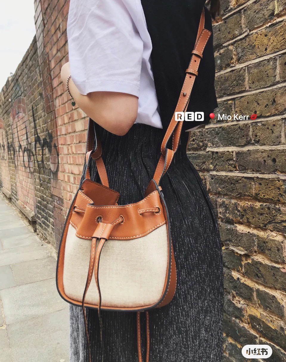 Loewe🔥Mini Hammock Dw Bag迷你牛皮革和亚麻抽绳袋,带有柔软侧面抽绳来改变形状。这款迷你单色版采用天然牛皮革和帆布制成,单肩、斜跨,手拎、多功能斜挎包 经典造型🌹带有柔软侧面抽绳包身的多功能手袋,可释放侧面抽绳来改变形状。两个内部插袋*带有Anagram人字纹棉帆里衬。