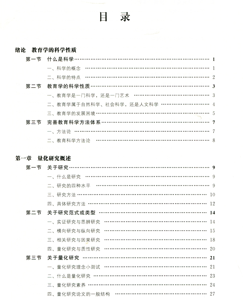 本书以研究生和本科生的学位论文写作的现实研究方法需求为基本撰写思路,以教育研究案例为突破口,讨论量化研究方法,提炼量化研究理念,提供丰富的量化数据,教育理论与实践紧密结合,强调对教育实际问题及数据的分析。本书具体内容简介如下: <br>引言和第1章,以"什么是科学"为引子,首先阐明教育学的科学性质,引出量化方法在教育研究领域的重要性和深远意义,对量化研究方法加以概述。重点对比质性研究,掌握量化研究的特点。 <br>第2-4章,探讨"量化研究设计"基本内容,即教育研究问题如何提出、如何根据研究问题确定相应的研究方法及取样方法、如何进行研究核心变量的概念界定以及如何进行研究假设等。重点掌握概念的可操作性和取样的随机性质。 <br>第5-6章,重点对量化研究经常使用的具体方法(问卷法和访谈法)加以深入探讨,重点探讨问卷的编制及其信度与效度如何保障、如何进行访谈法的数据编码与量化分析。 <br>第7-9章,对数据分析方法加以探讨,概述统计方法及数据初步整理方法,重点介绍描述统计(比如,集中趋势、离散趋势)和推论统计(比如,t检验、F检验、χ2检验等)在教育研究数据分析中的应用。 <br>第10章,以教育研究的综合实例,对如何运用量化方法加以分析与说明。整体评价量化研究方法的作用和价值,形成研究理念与方法的知识体系,运用相关系统知识解决实践问题。