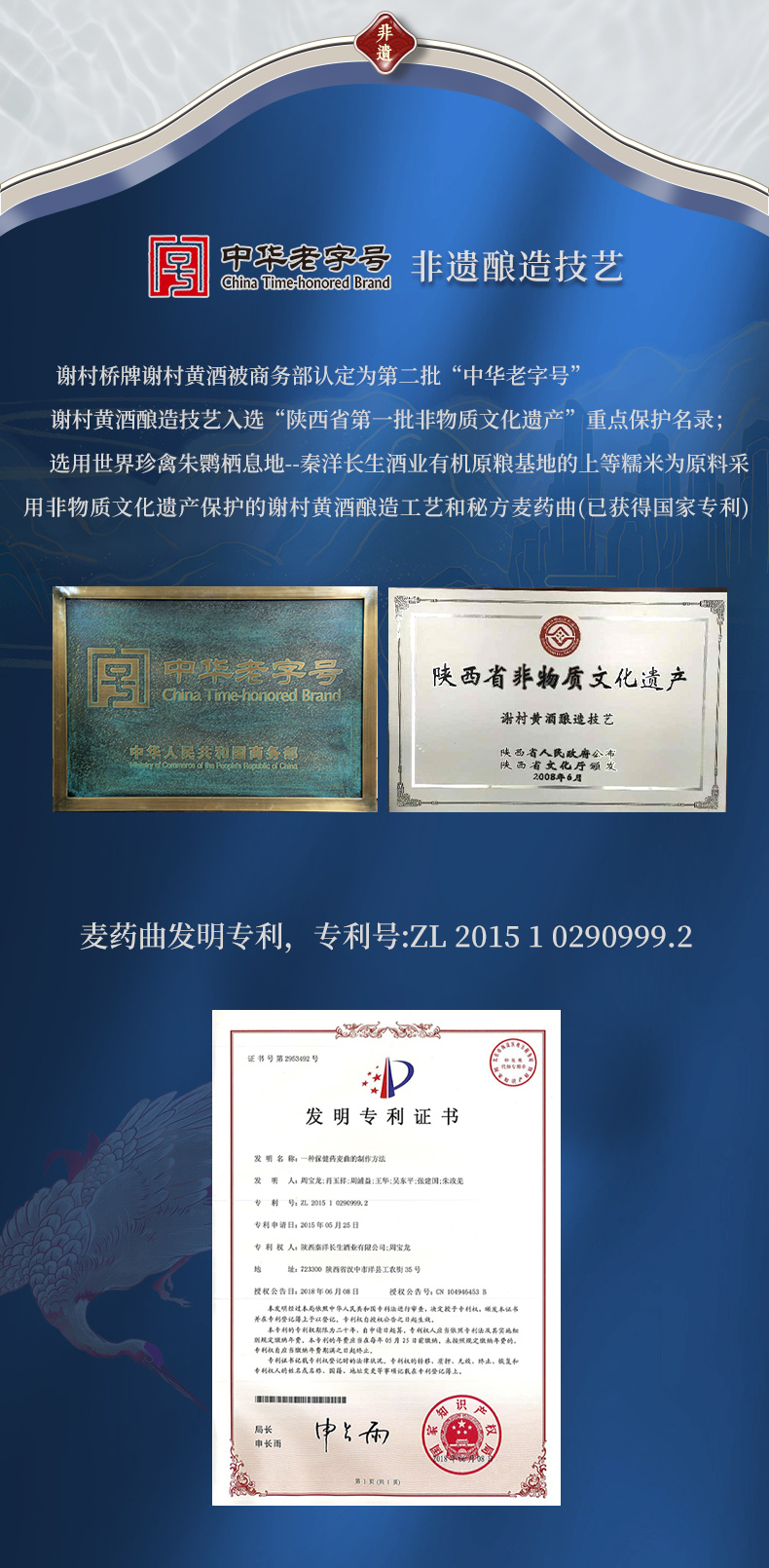 “谢村桥”牌谢村黄酒是陕西省名牌、中华老字号,其酿造技艺入选陕西省第一批非物质文化遗产重点保护名录。选用糯米、小麦、枸杞、栀子、菊花为原料,经制曲、浸米、蒸饭、糖化发酵、压榨、陈酿等工序酿制而成。