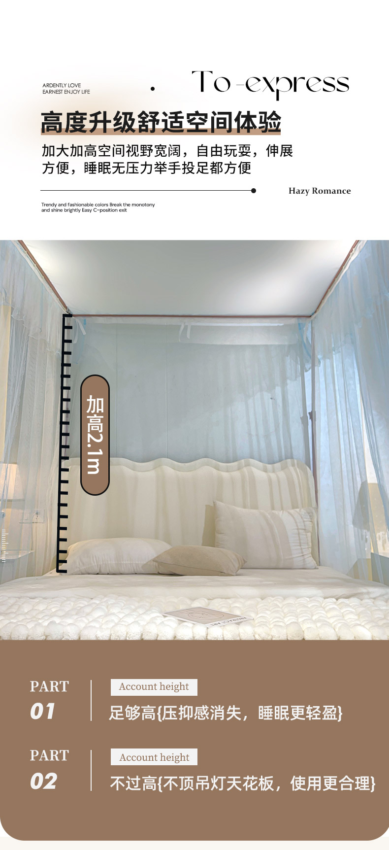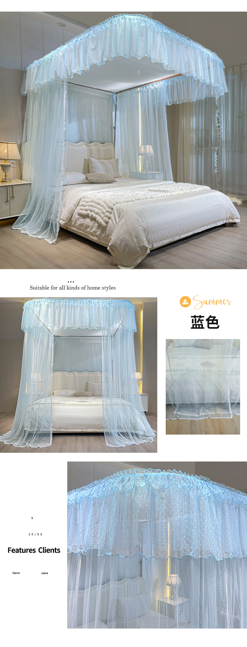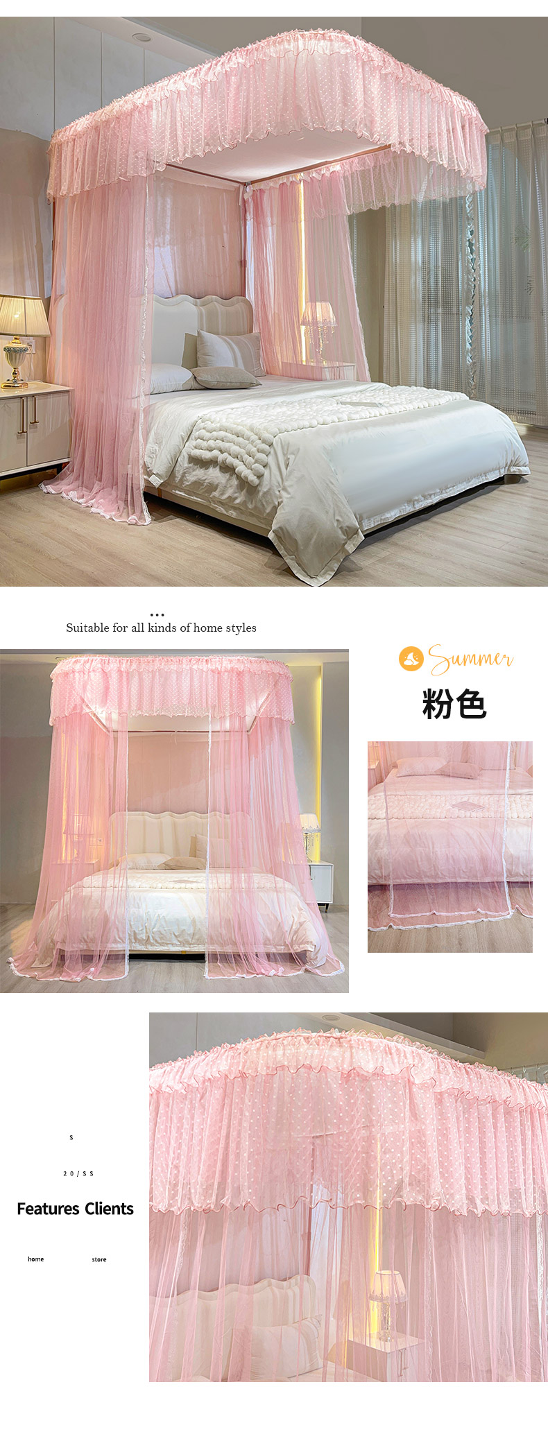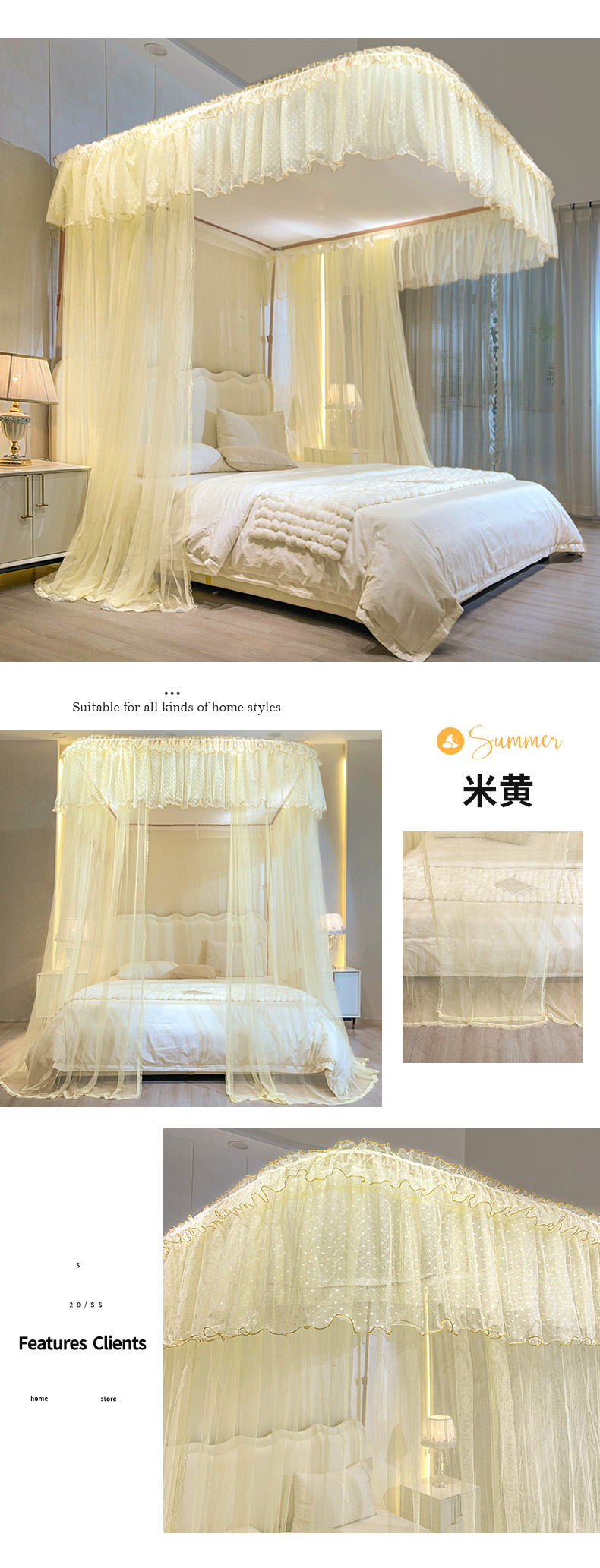 自然醒A类U型导轨蚊帐加密加厚滑轮轨道落地家用卧室防尘顶白色2406HH