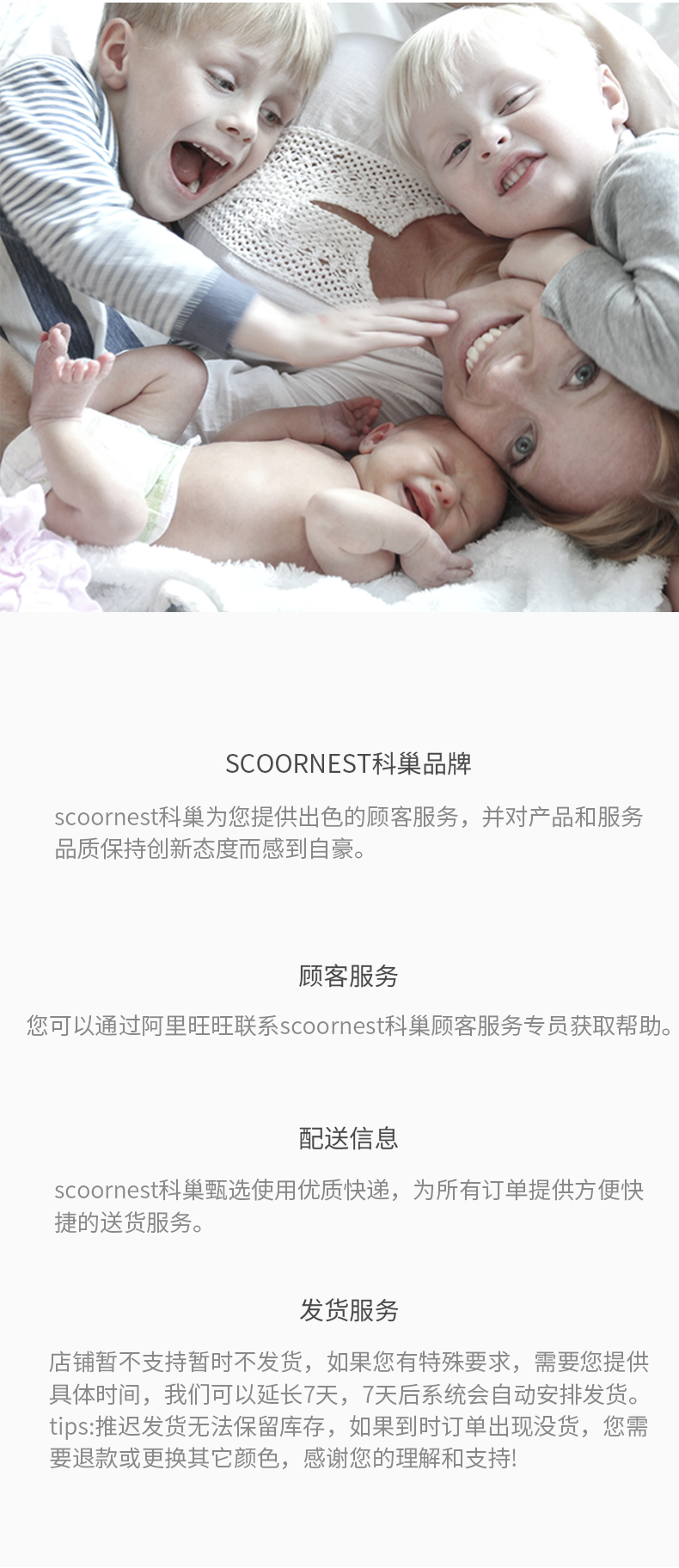 - Scoornest始终秉承给每一位宝宝送去科学的、关心的、创新的成长体验,通过提供商品和服务,使顾客形成守护、发展、巩固这种弥足珍贵的亲情的爱。