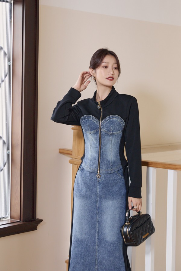 WHO KNOWS 牛仔拼接上衣半裙套装 19021