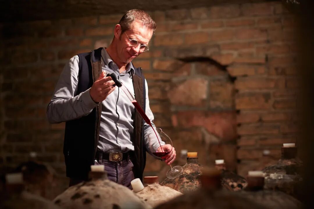 陶罐酿造最大的优点在于,密度远小于橡木桶,葡萄酒可以在陶罐中自由呼吸,并且不会添加任何容器带来的味道,葡萄酒口感更加纯净,还能将每片葡萄园独有的风土完整呈现出来,增加辨识度。2018年,他又引入一批320升到750升的双耳赤陶罐。