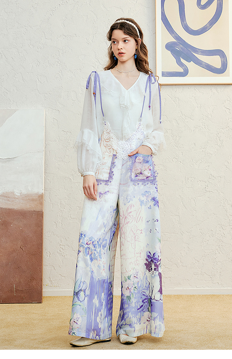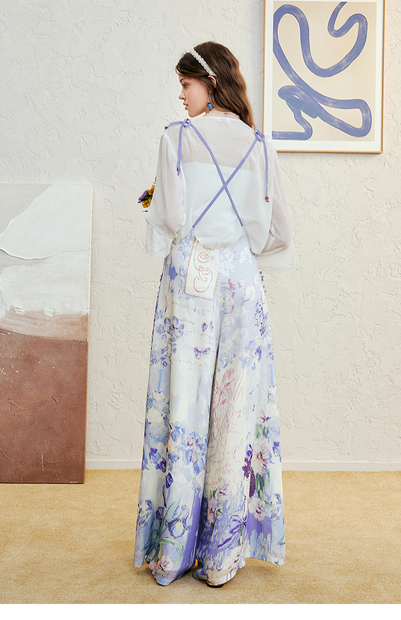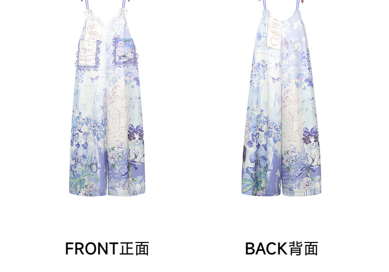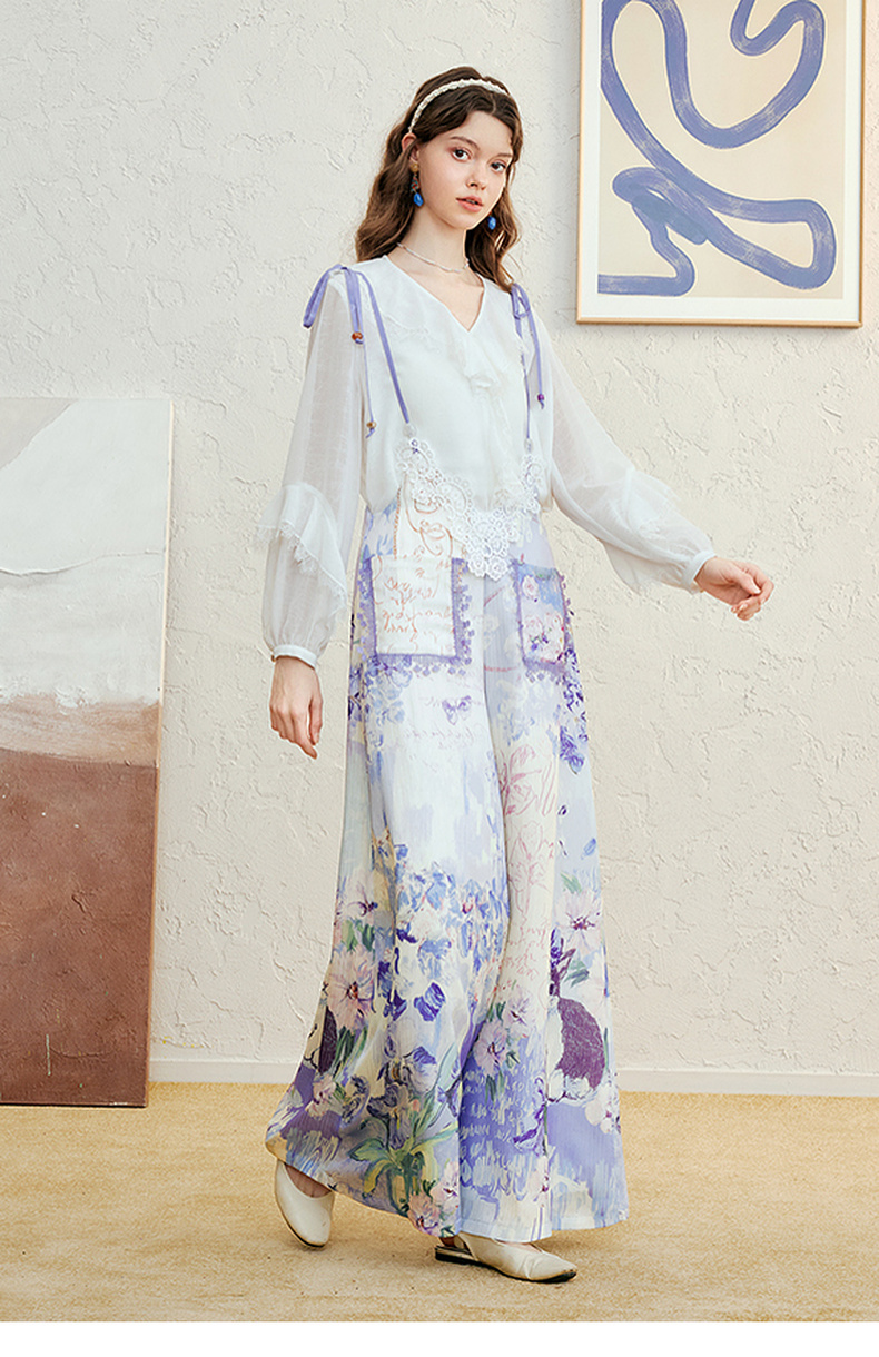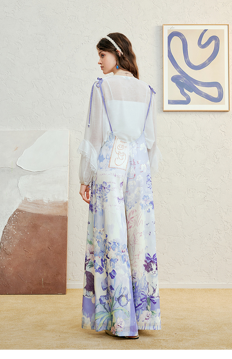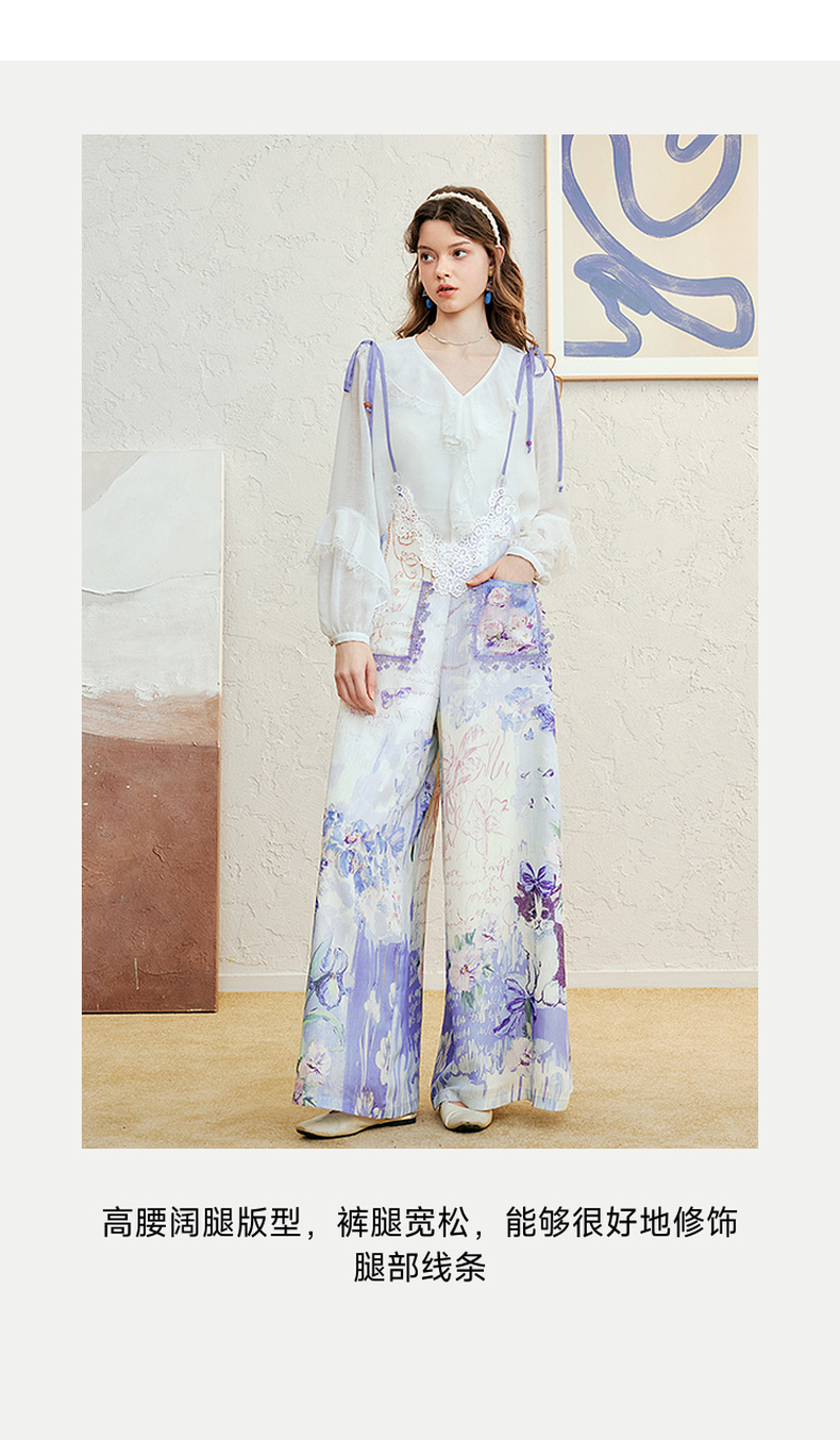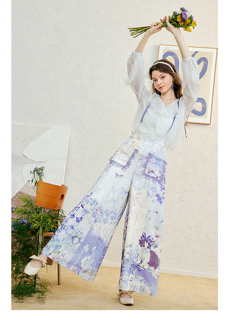 两三事 花路之途 2025春季新款甜美印花绑带背带裤女宽松休闲裤