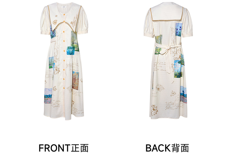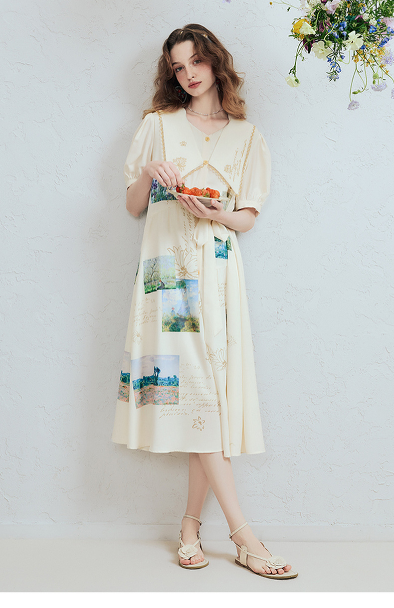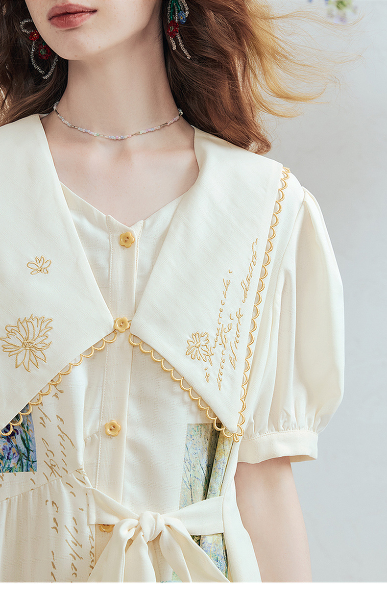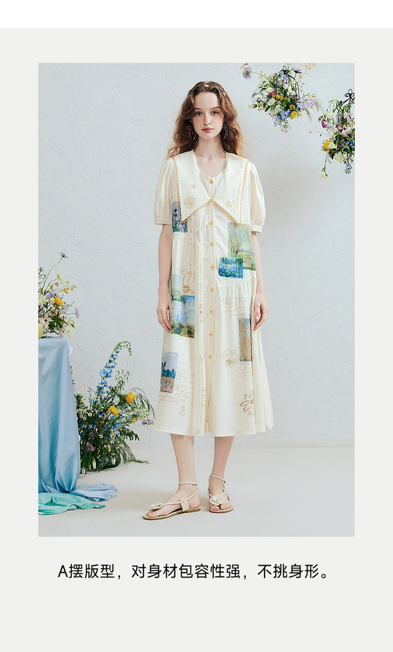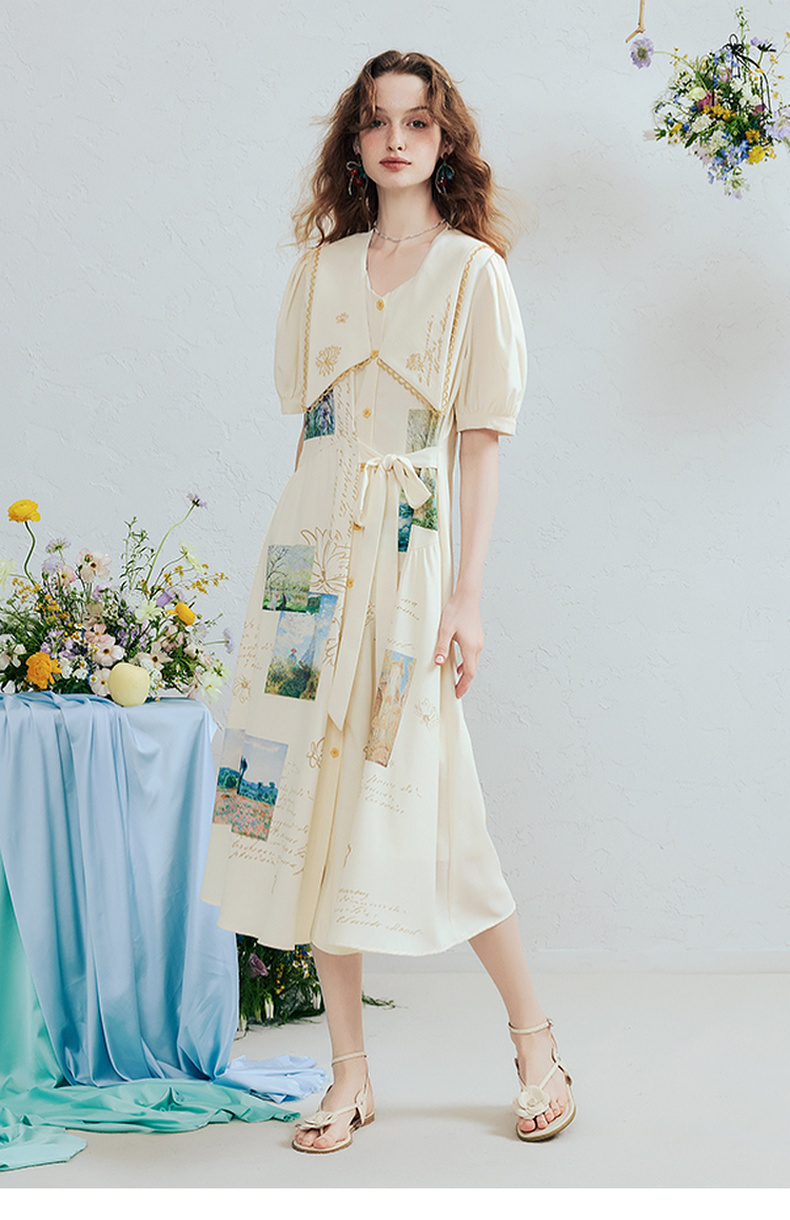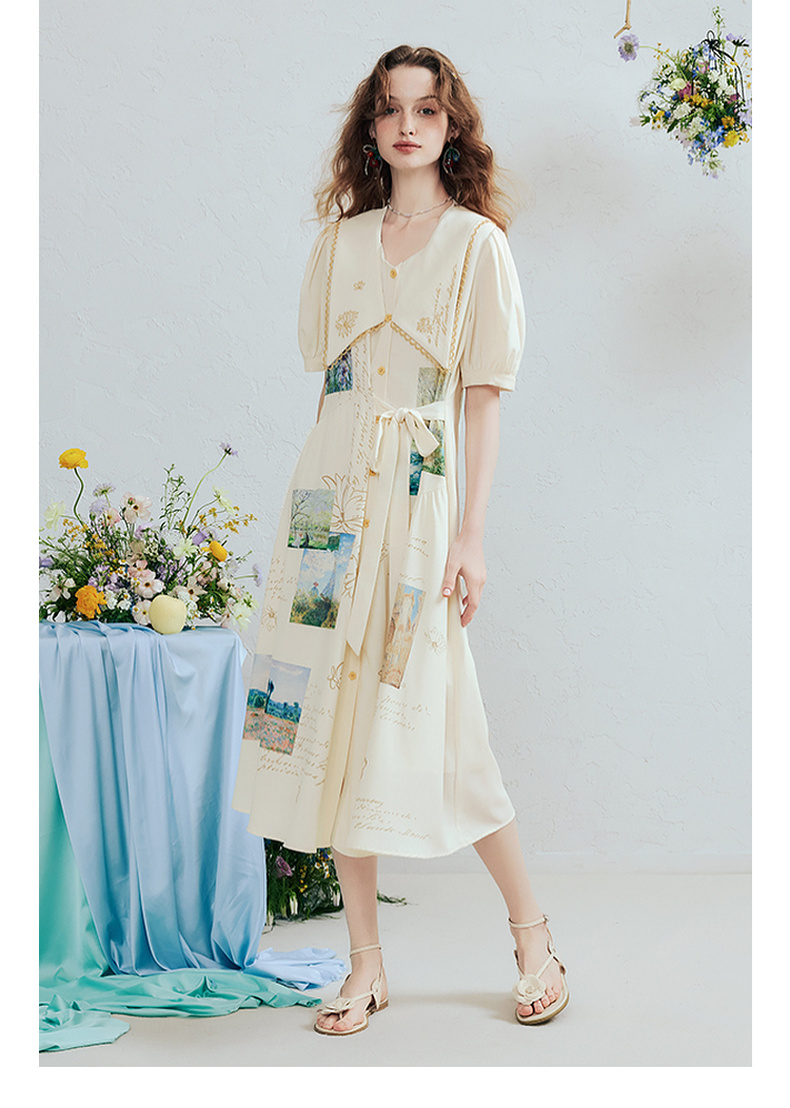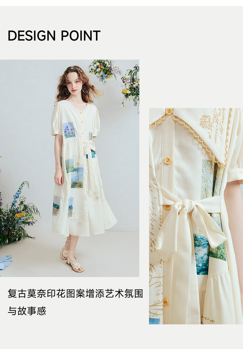 两三事 岚烟织梦 2025夏季新款复古可拆刺绣大翻领绑带印花连衣裙