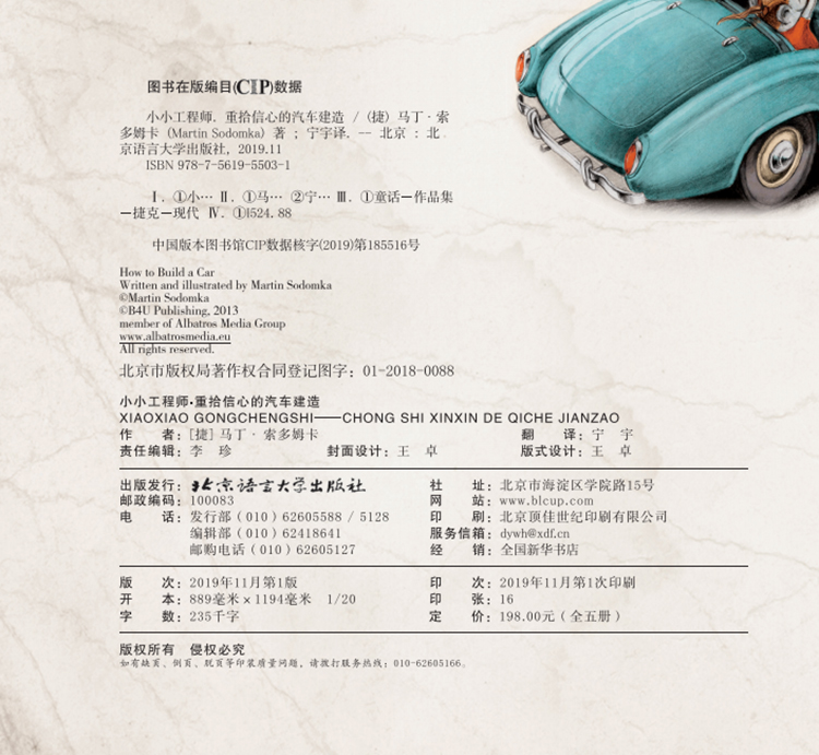 马丁· 索多姆卡(Martin Sodomka),男,是捷克共和国的一名平面设计师,还是一名儿童书籍插图画家。自1994年以来, 他与计算机出版社合作, 至今已出版了*2500本书籍。在2012年, 他出版了自己的第*本机械工程类童话故事书《如何建造一辆汽车》。之后同系列作品陆续出版,并得到大小朋友的喜爱。