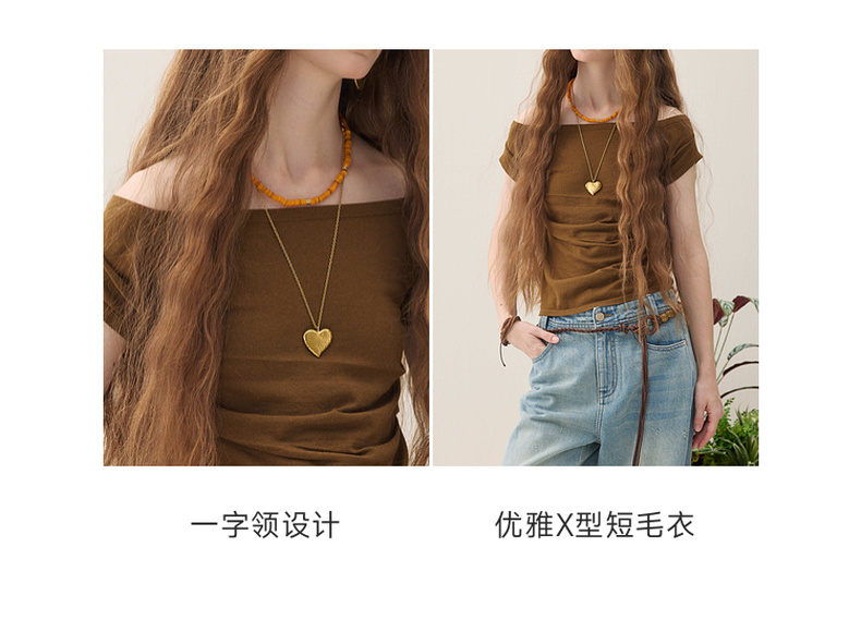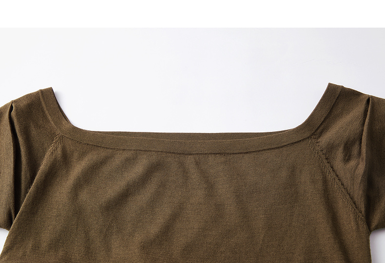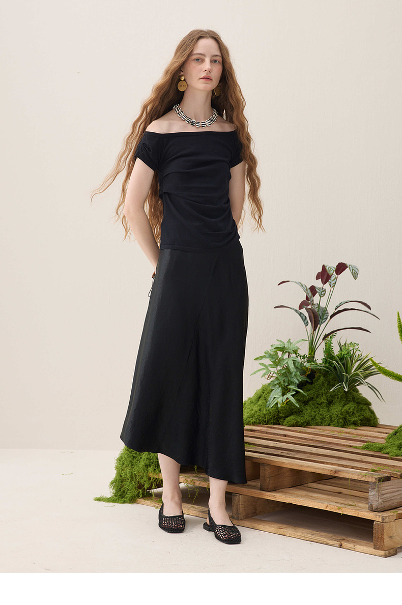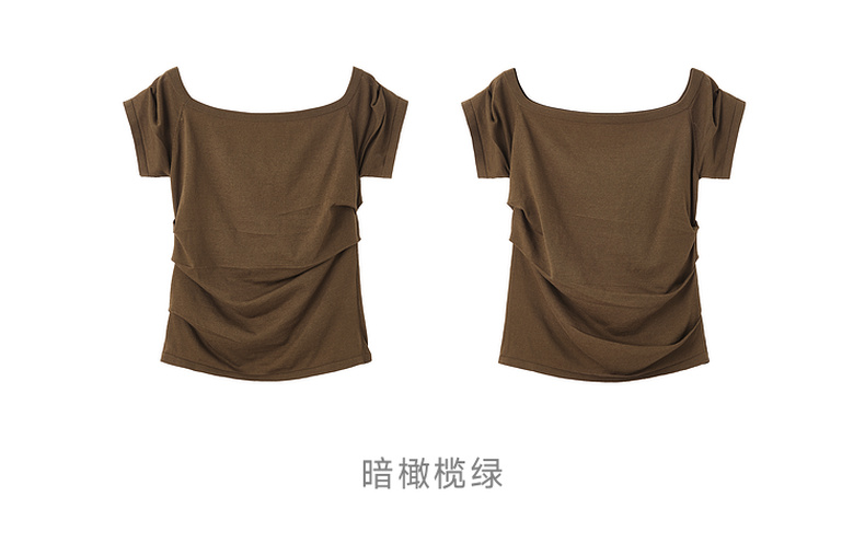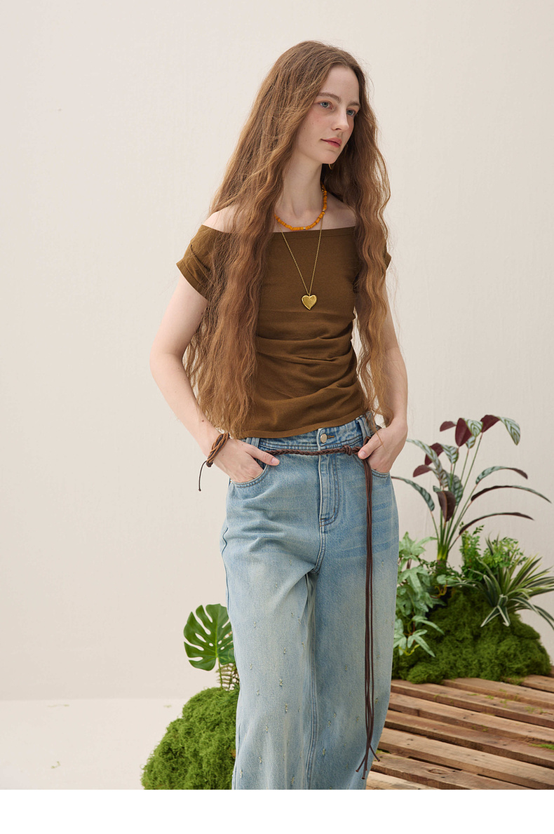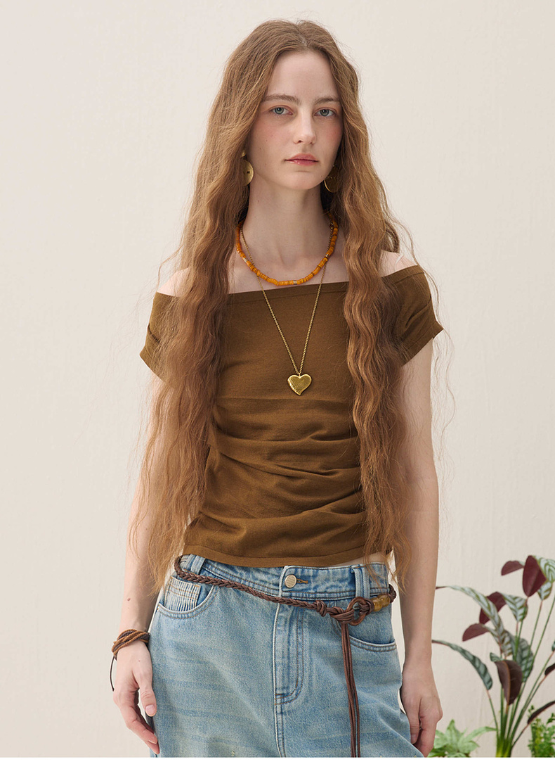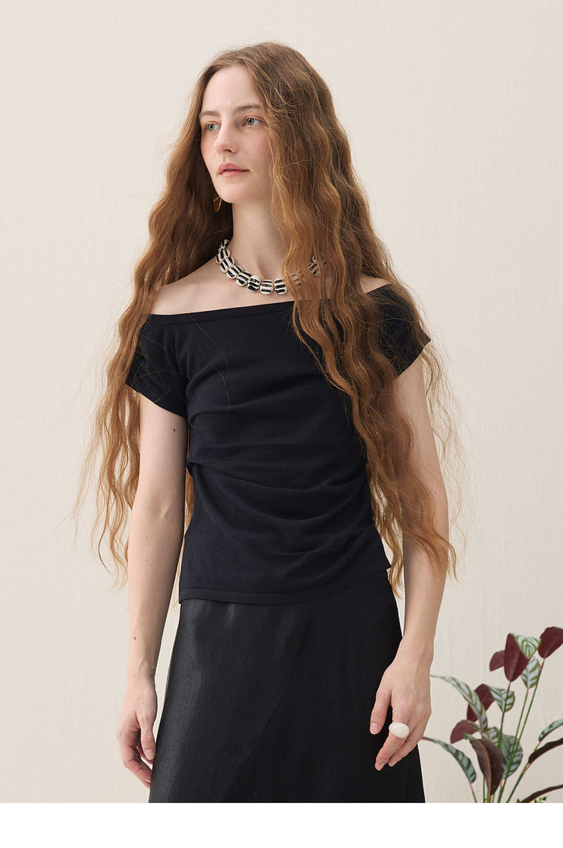 谜底针织衫短袖2026春季新品一字领腰部褶量百搭上衣女261MZ0344
