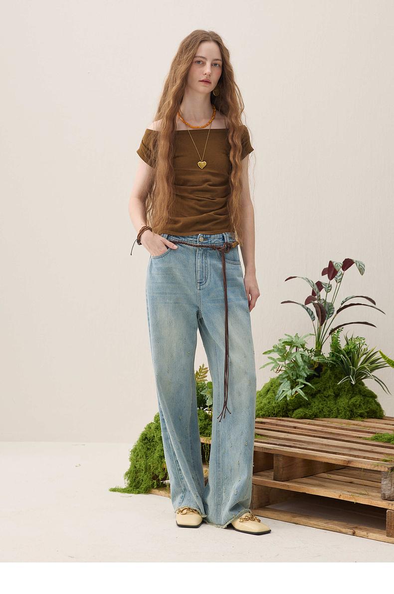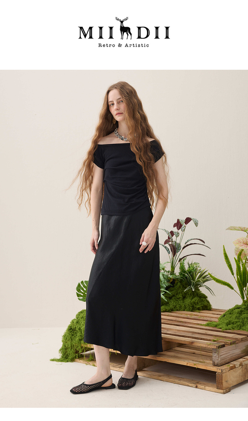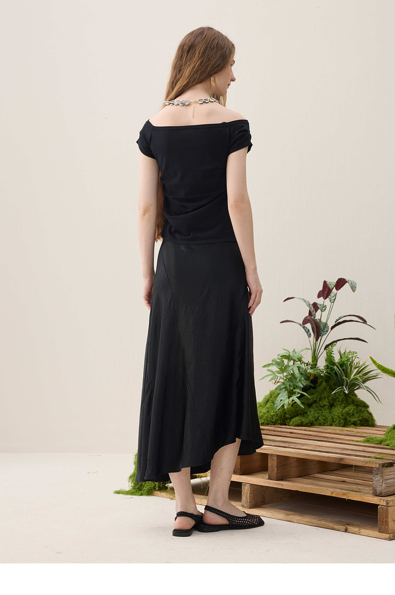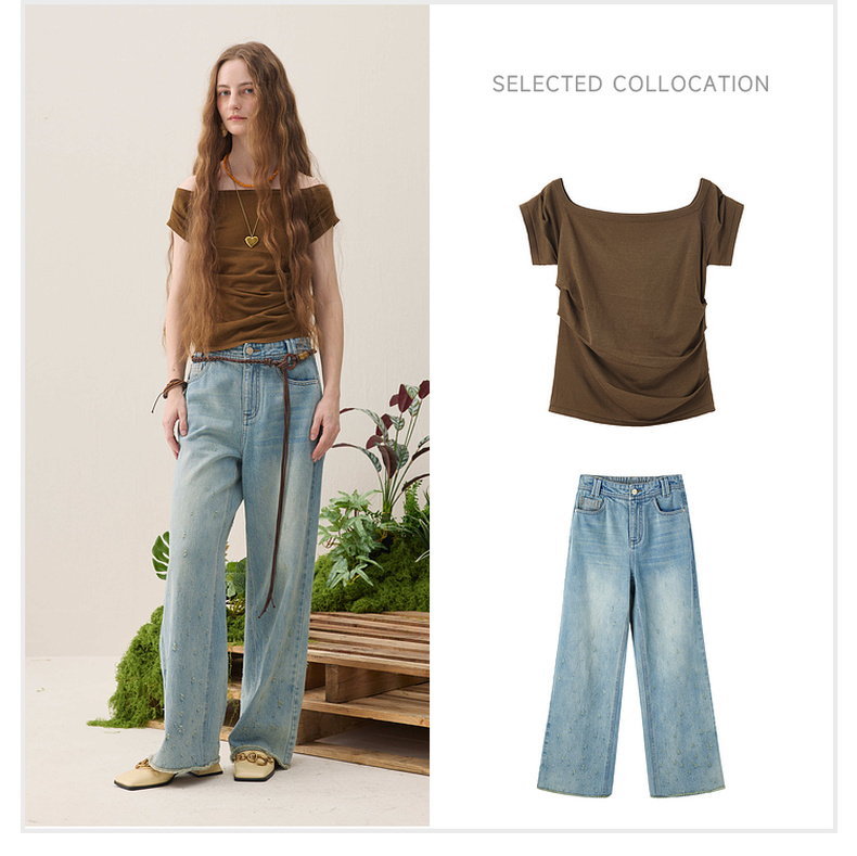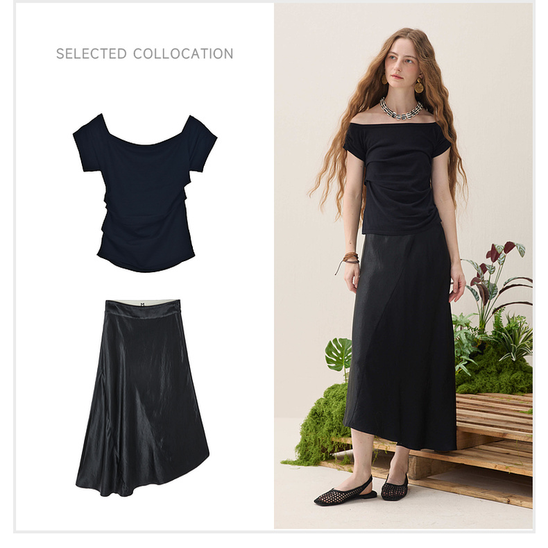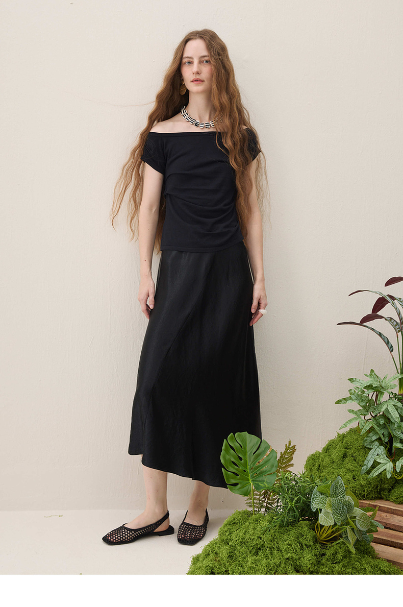 谜底针织衫短袖2026春季新品一字领腰部褶量百搭上衣女261MZ0344