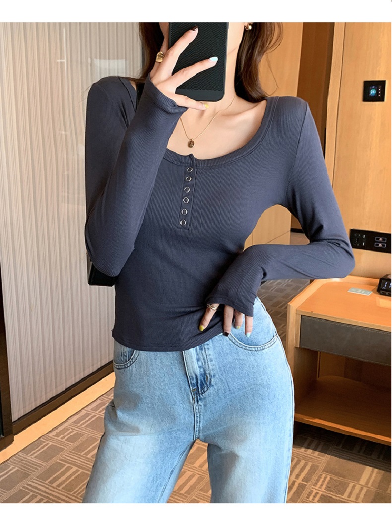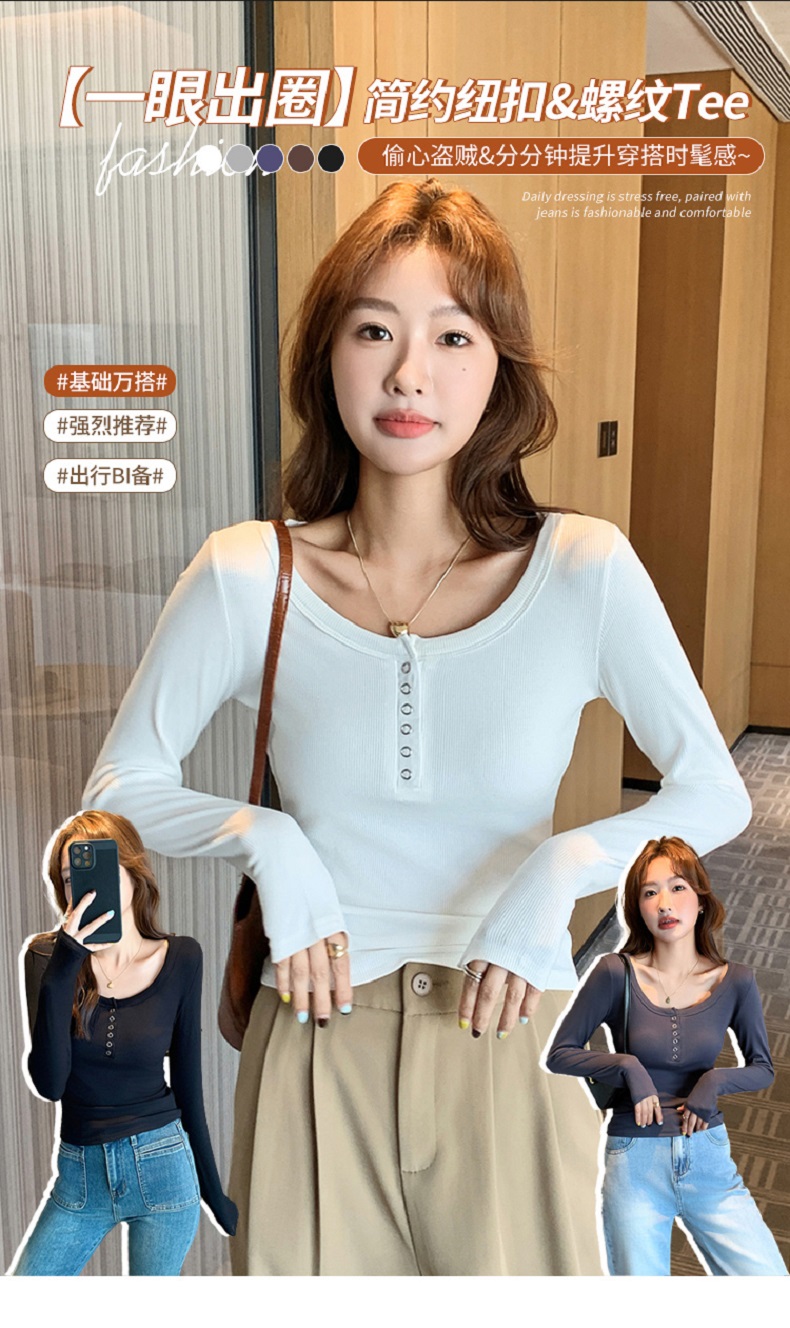 【时髦百搭,细腻软糯】【两件起拍,一件不发货】秋季新款女长袖纽扣打底衫都市风休闲别致圆领正肩t恤衫
