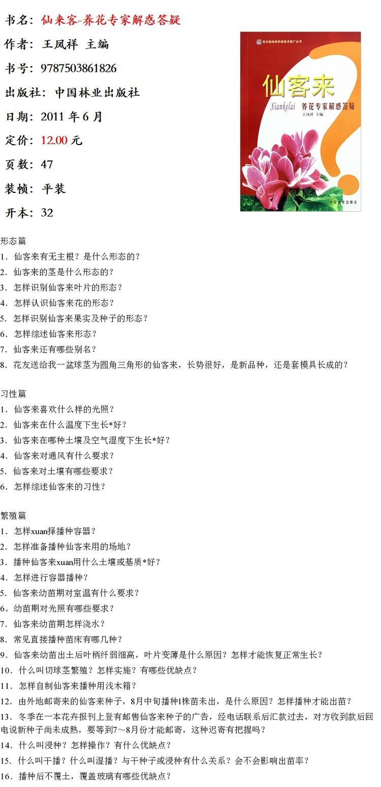 仙来客 养花专家解惑答疑 6182 王凤祥 主编 形态 习性 繁殖 病虫害防治 用途篇 花卉培育知识 中国林业出版社 畅销书