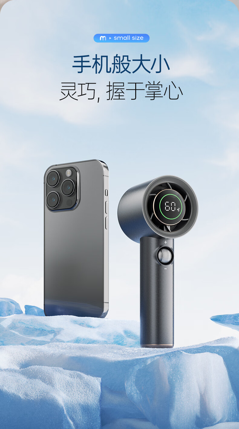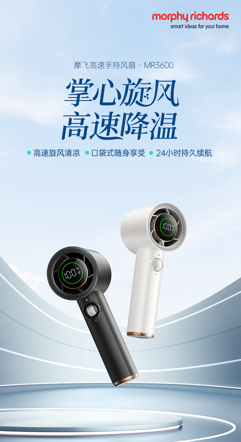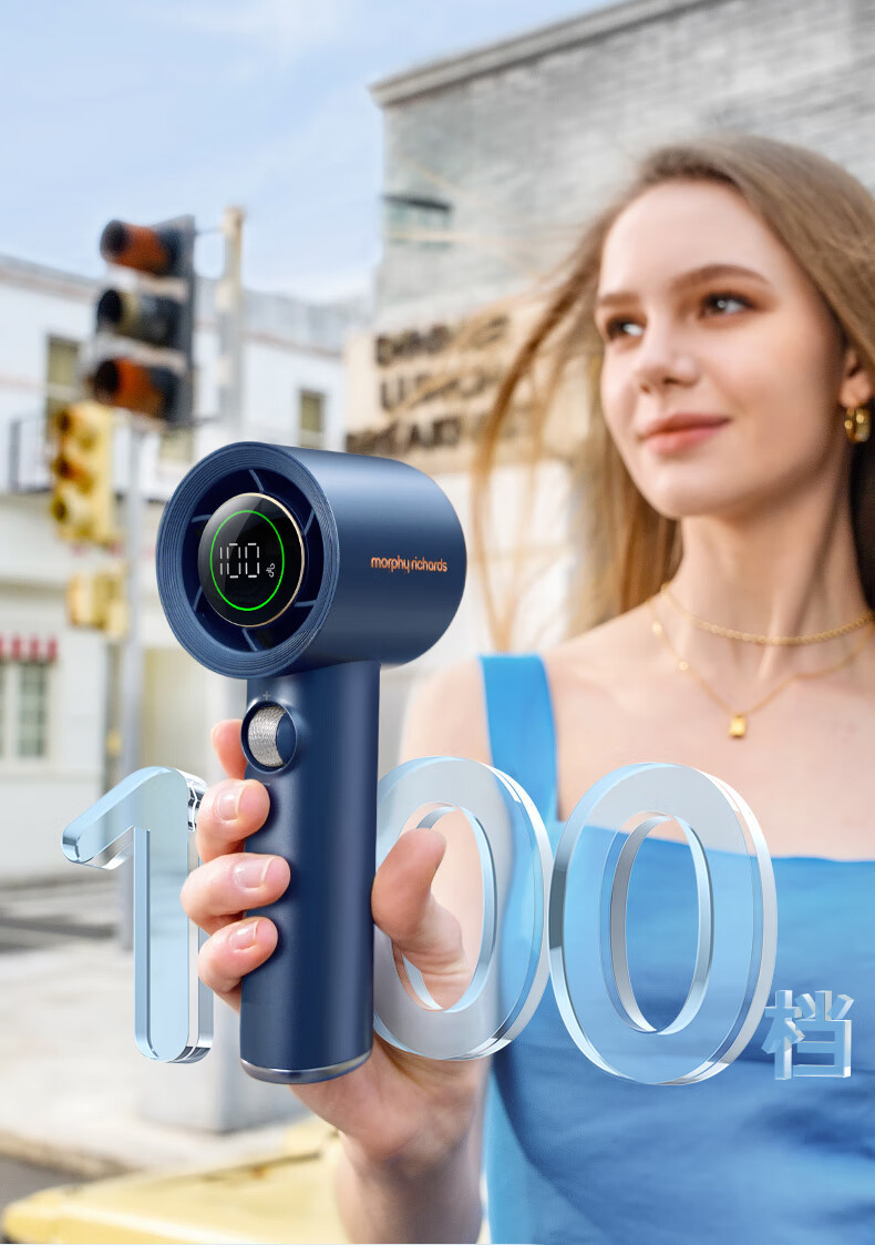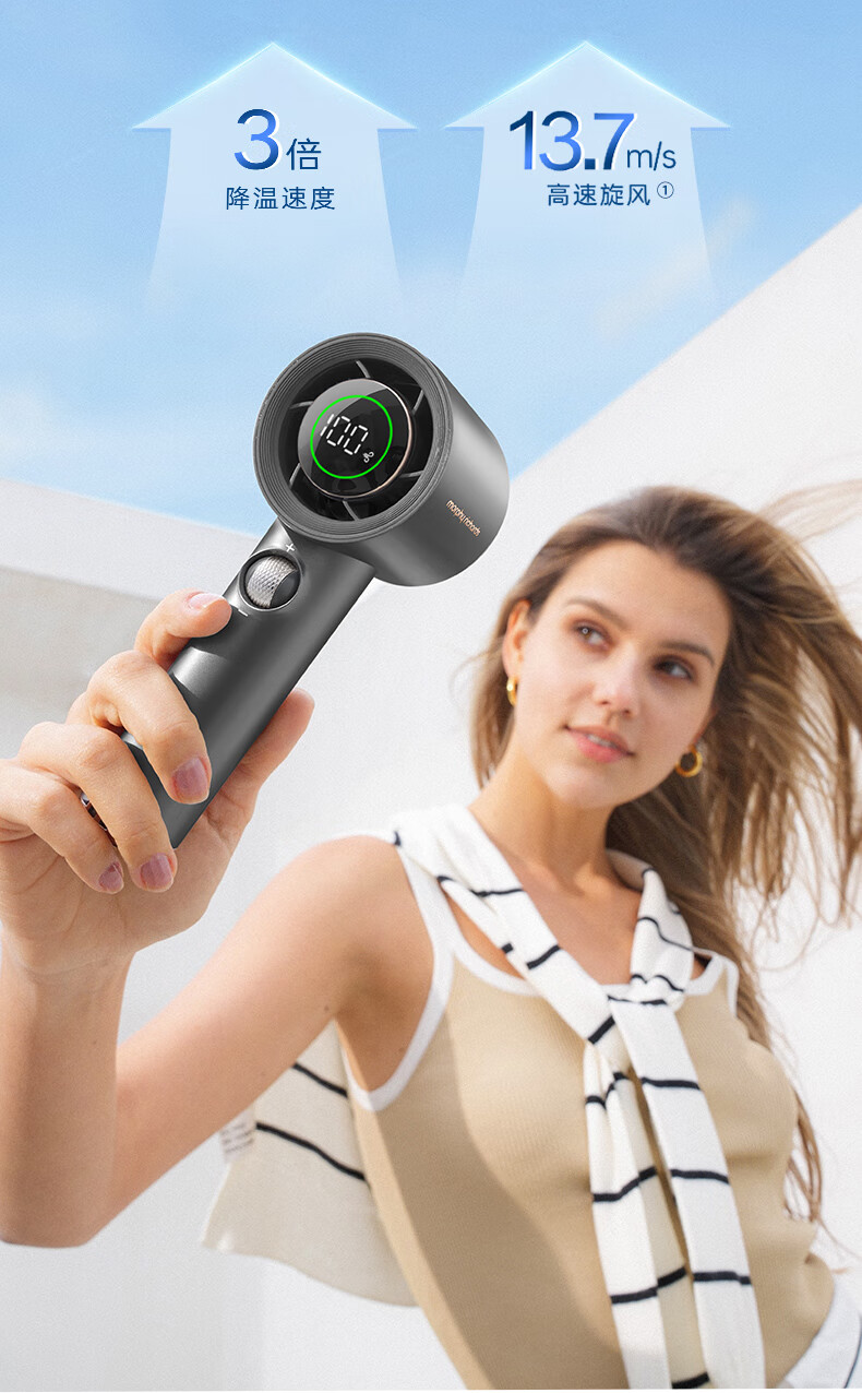 积分免费兑:摩飞电器(Morphyrichards)手持电风扇迷你便携式涡轮小风扇户外露营出行风宝100档风力智能变频长续航高速小风炮MR3600灰