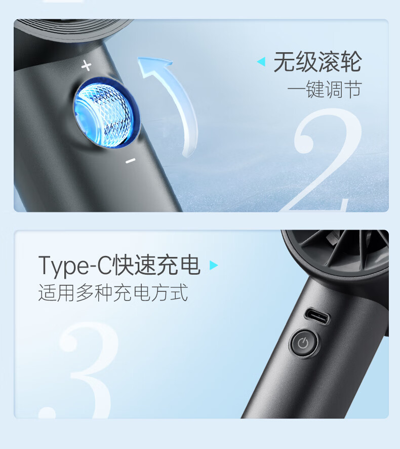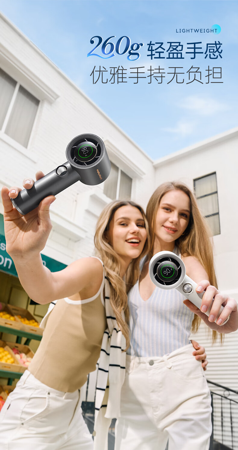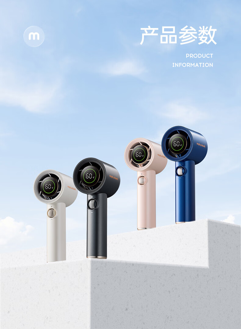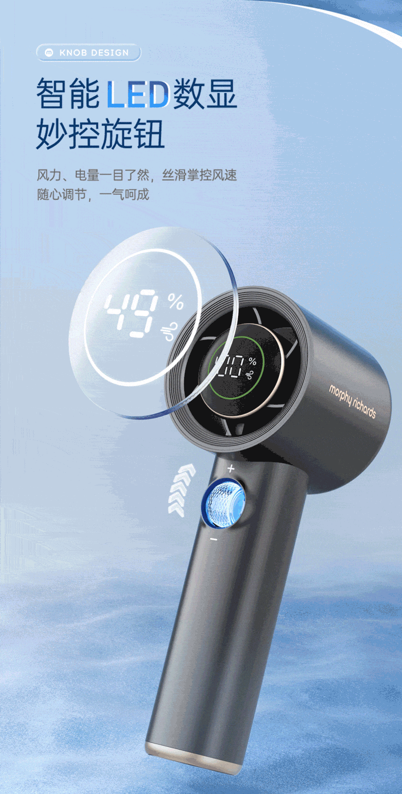 积分免费兑:摩飞电器(Morphyrichards)手持电风扇迷你便携式涡轮小风扇户外露营出行风宝100档风力智能变频长续航高速小风炮MR3600灰