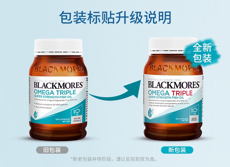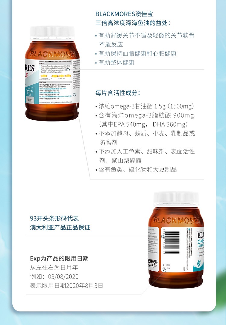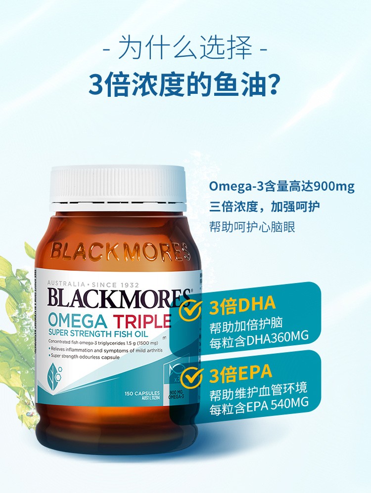 【保税仓】澳大利亚blackmores澳佳宝三倍高浓缩无腥味鱼油胶囊 150粒/瓶