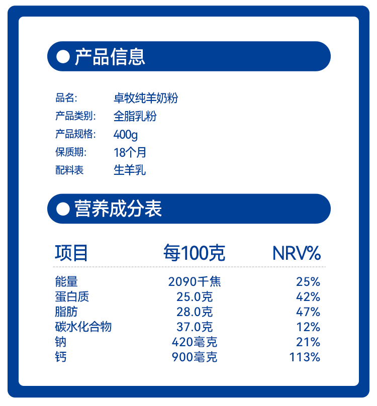 【100%生羊乳 纯羊奶粉】卓牧纯羊奶粉 400g/罐