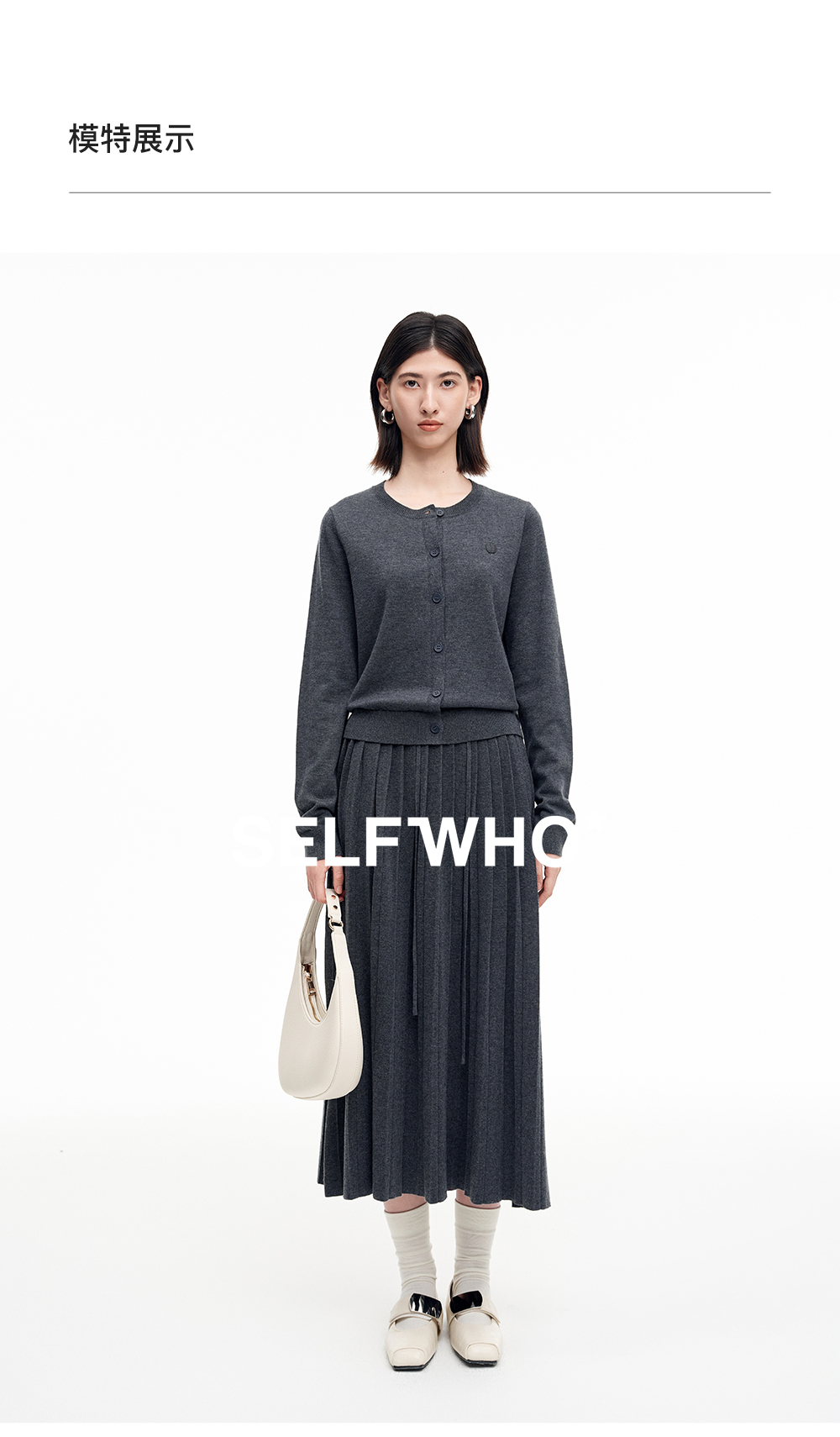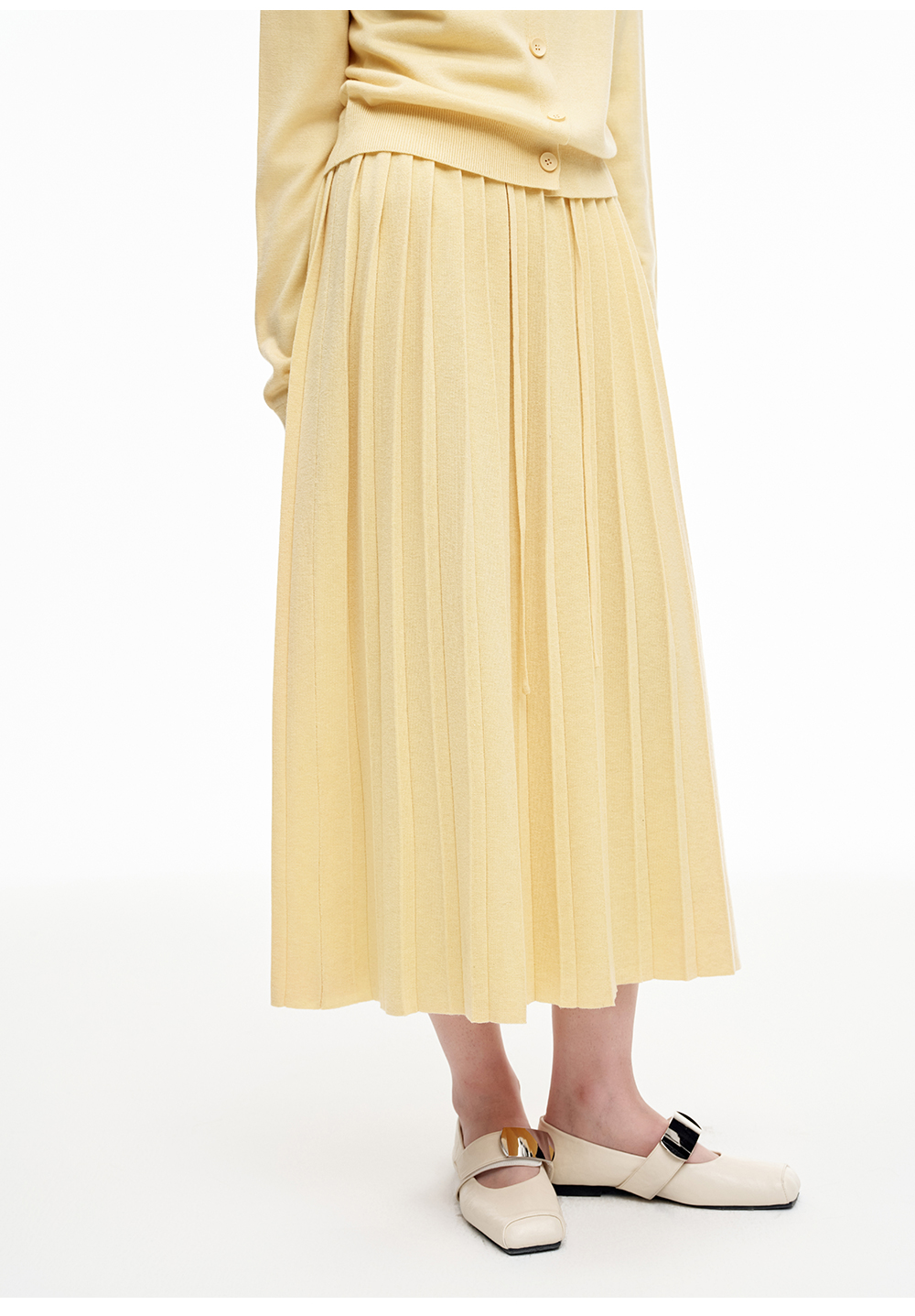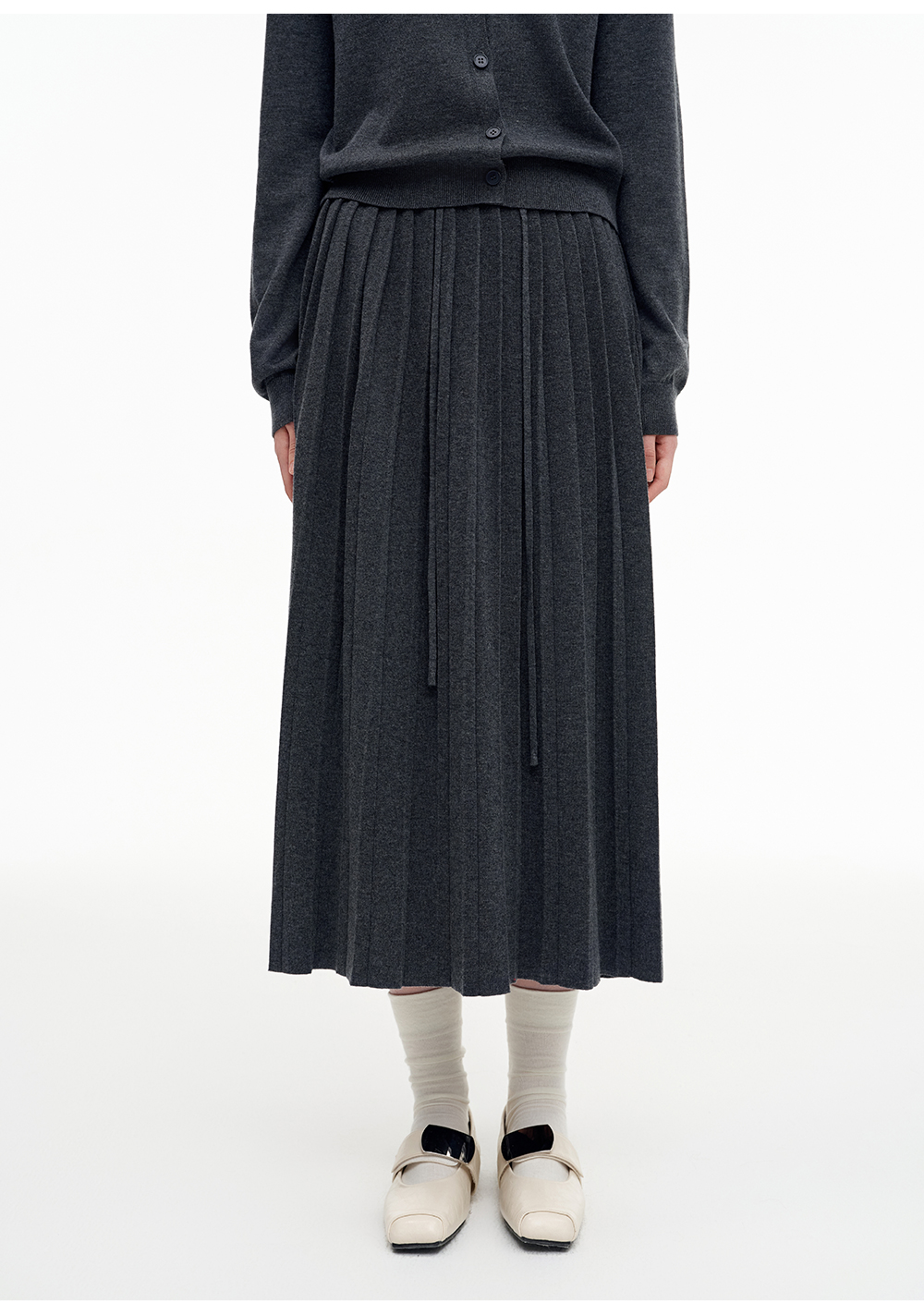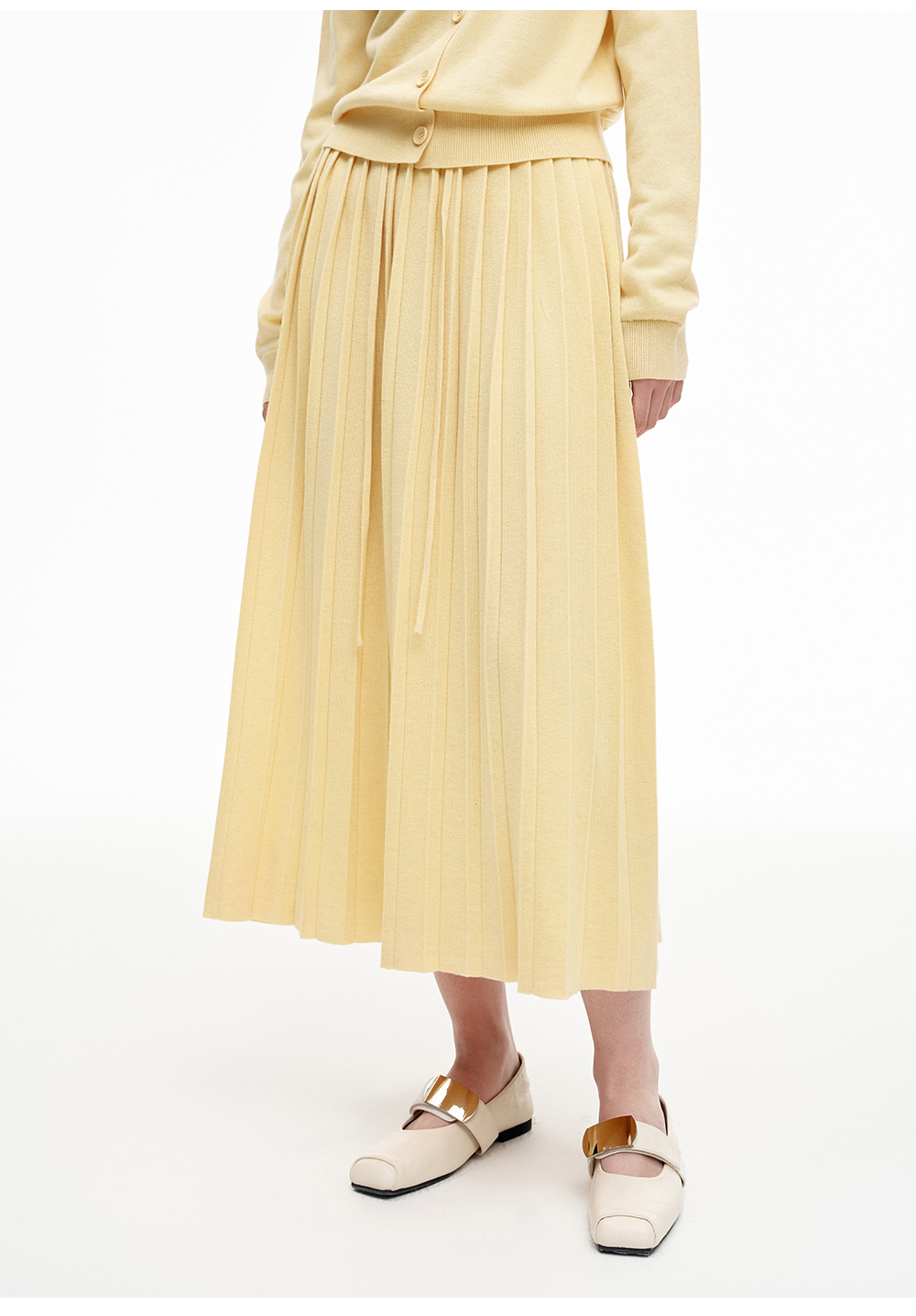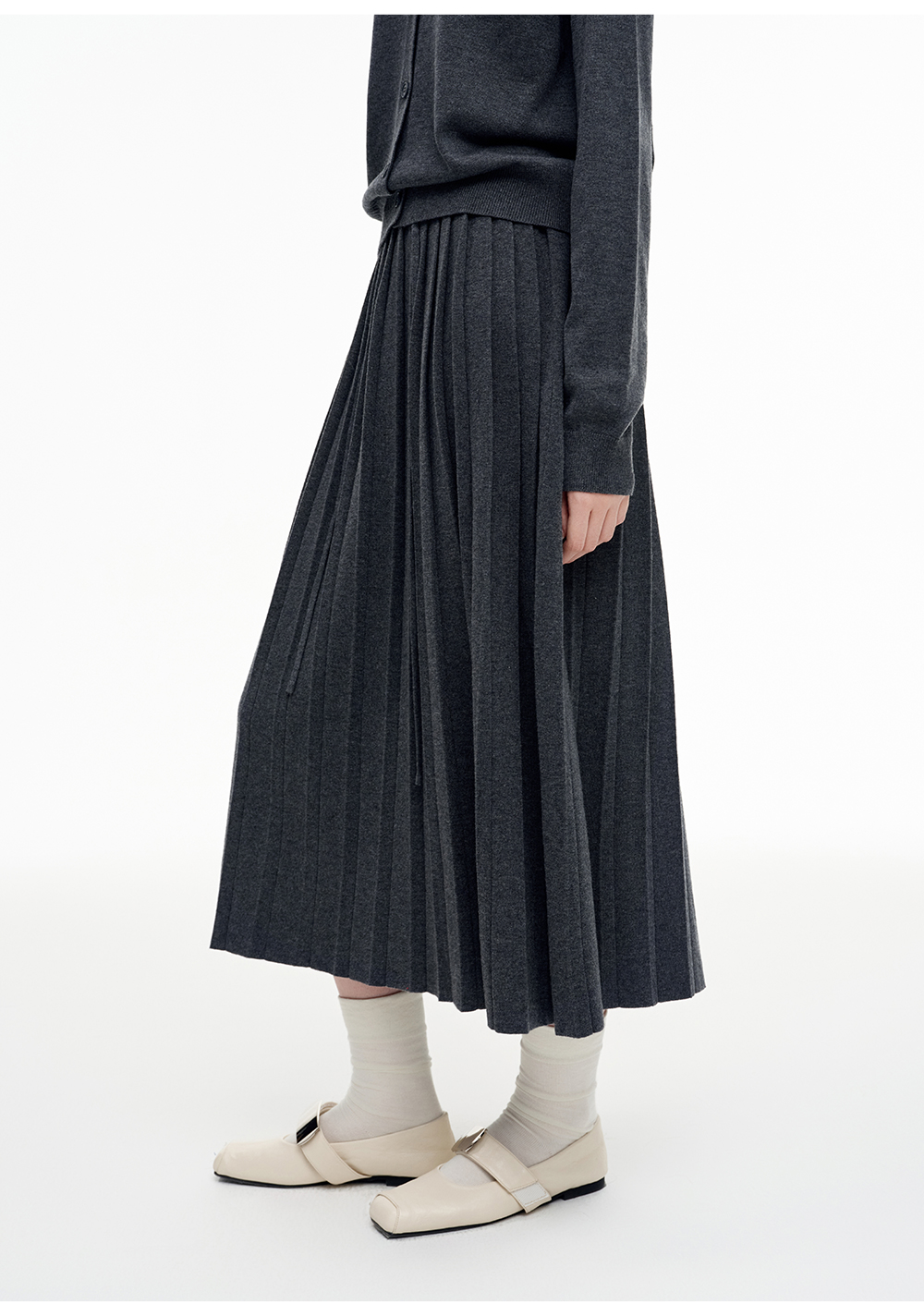 SELFWHO绵羊毛混纺松紧抽绳A字半身裙女2025秋新款垂感压褶百褶裙