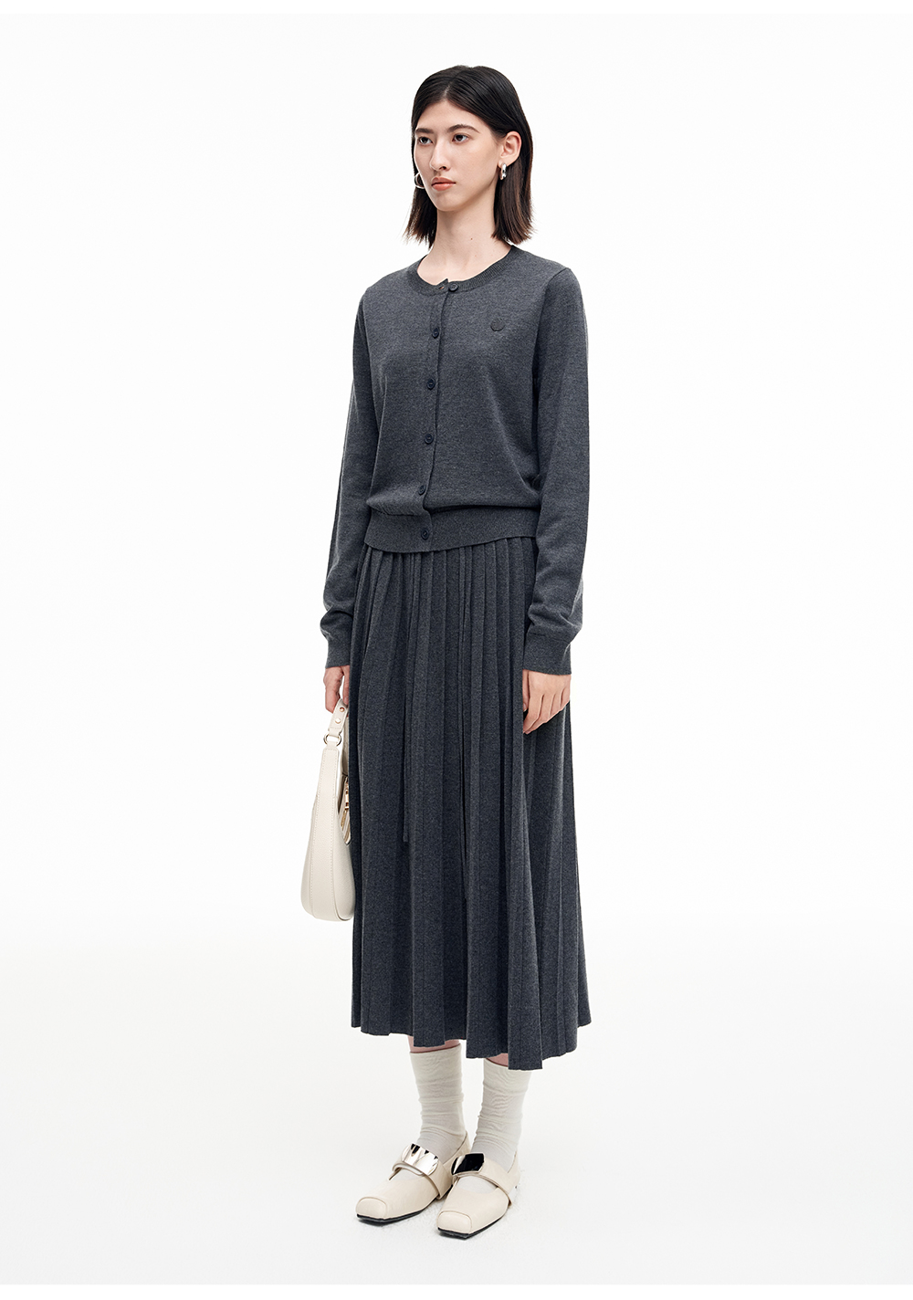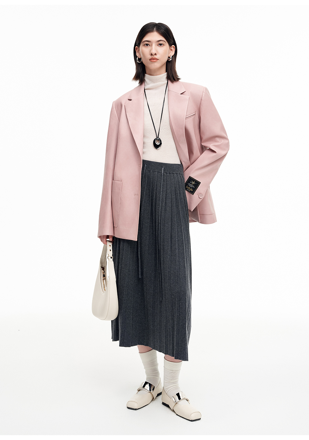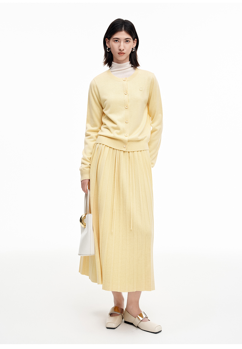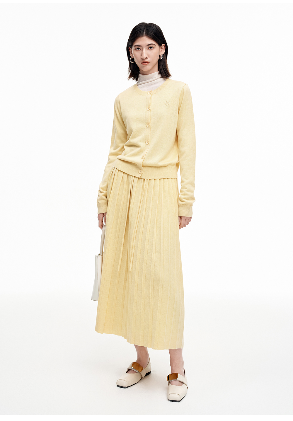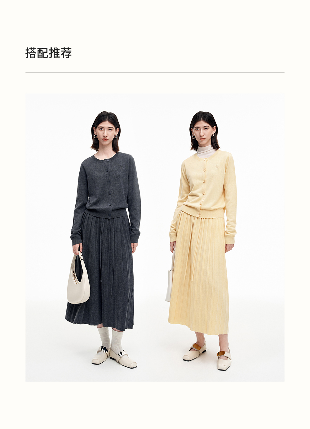 SELFWHO绵羊毛混纺松紧抽绳A字半身裙女2025秋新款垂感压褶百褶裙
