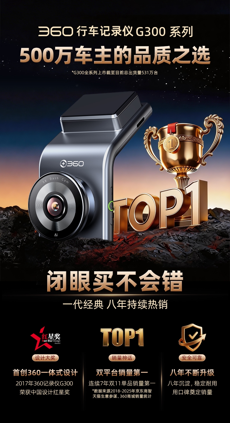 【超值】360行车记录仪高清 G900 4K超高清拍摄 一体式设计 双频高速wifi