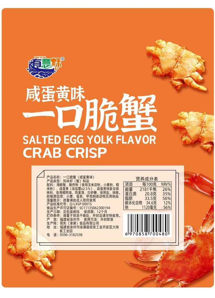 配料表:海螃蟹、酥炸粉(食用玉米淀粉,小麦粉,糯米粉)咸蛋黄、咸蛋黄味符合调味料、食用植物油、鸡蛋清、白砂糖、食用盐、味精