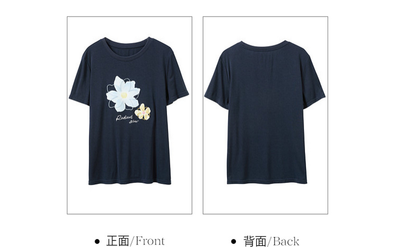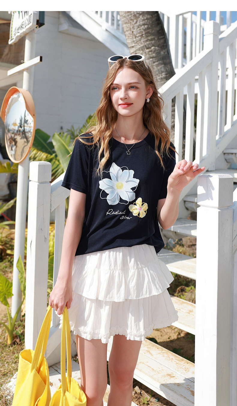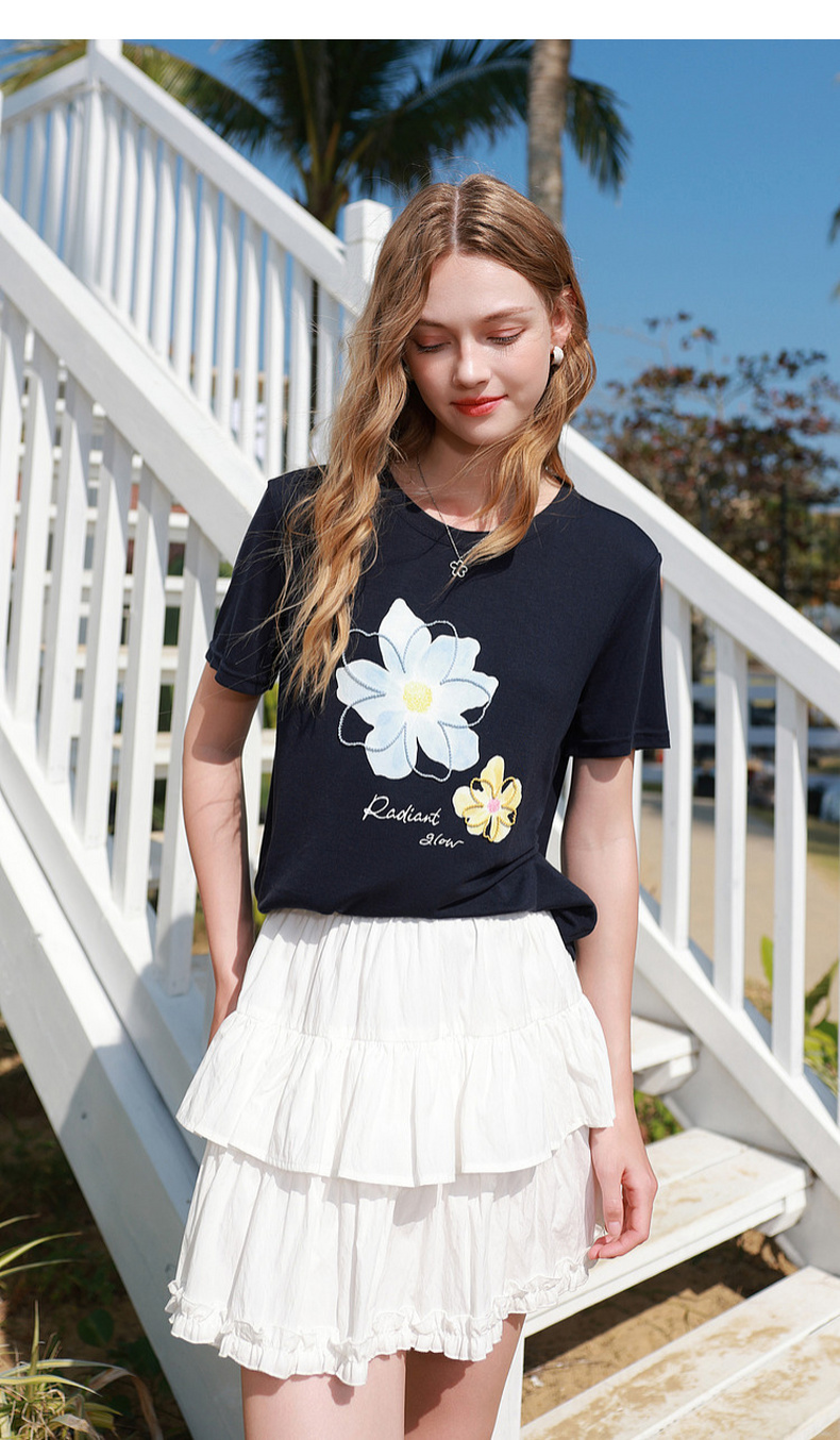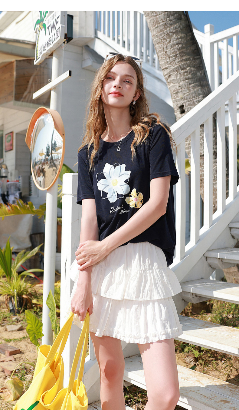 【莱赛尔】三彩2026夏季新款休闲花朵印花T恤圆领短袖套头衫上衣M