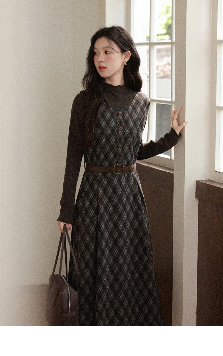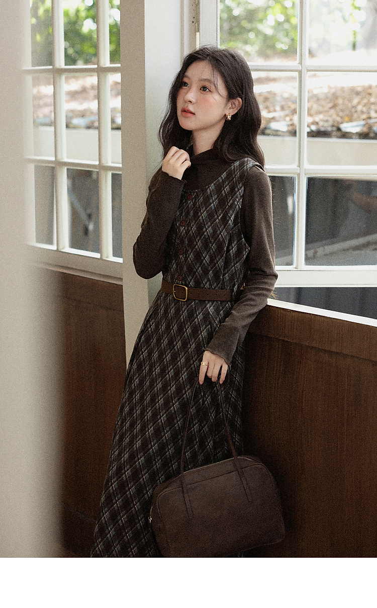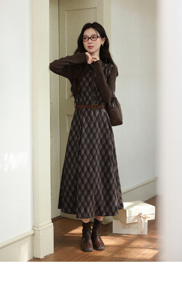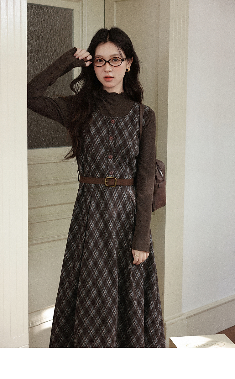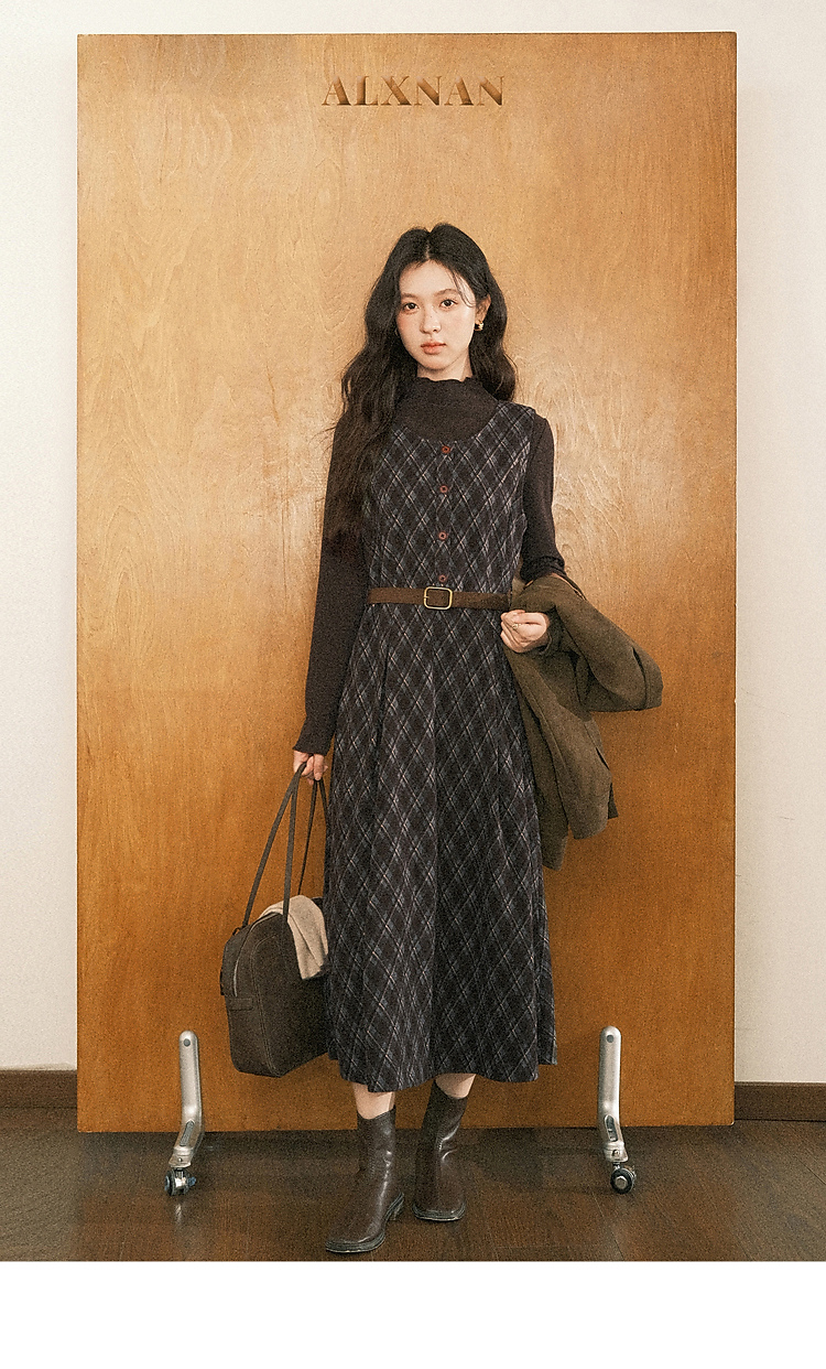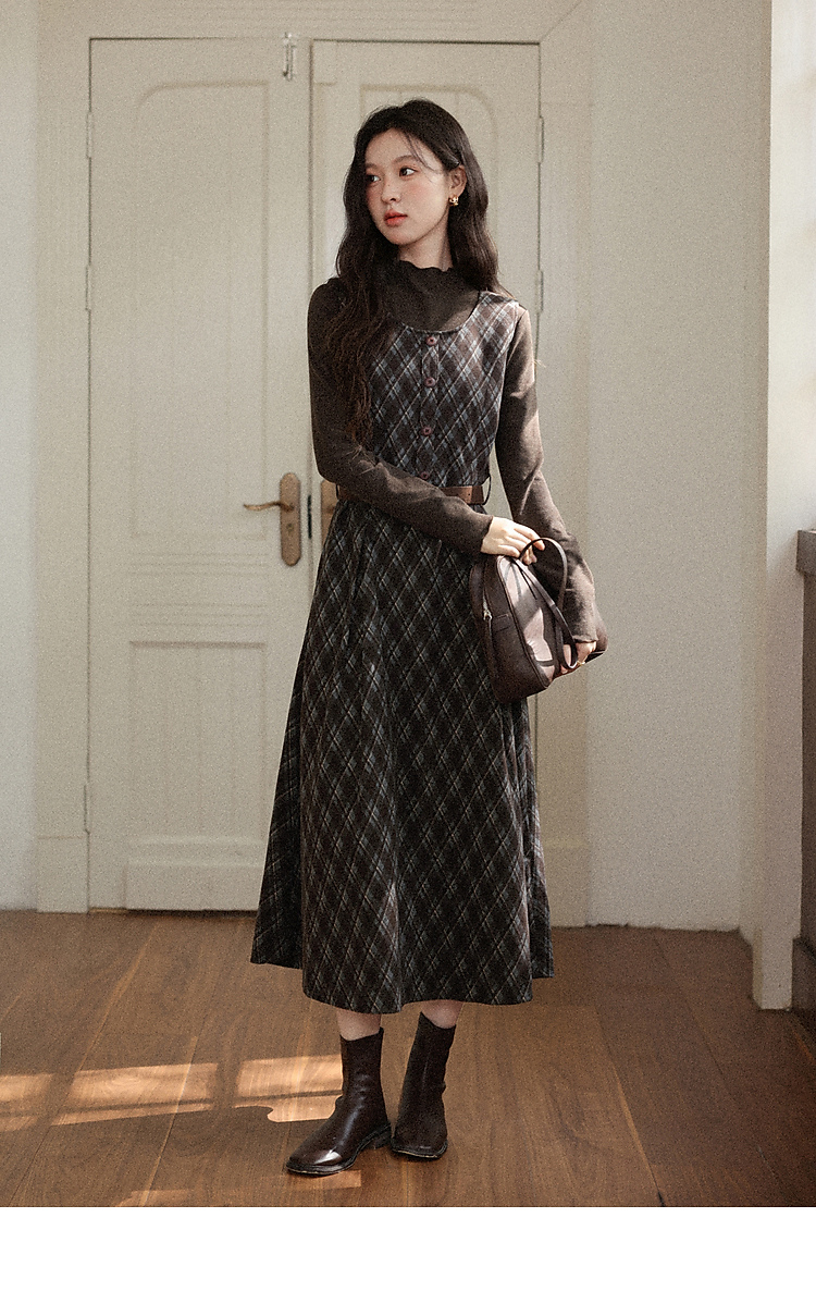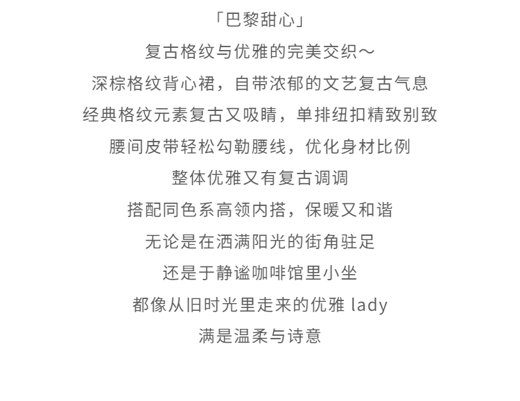 鹿向南「巴黎甜心」法式蓝咖格背心连衣裙女秋季气质显瘦A字长裙
