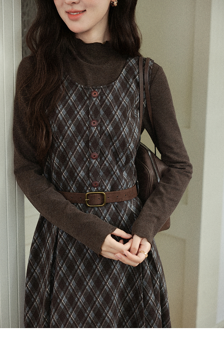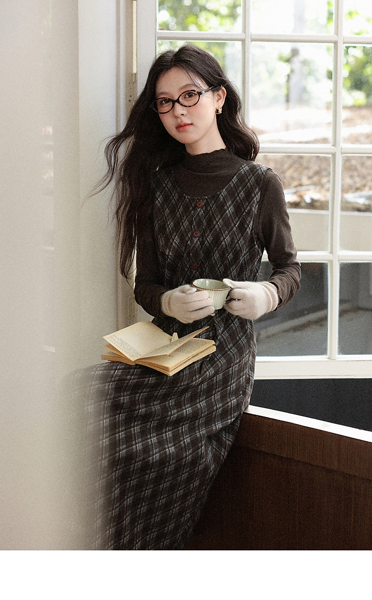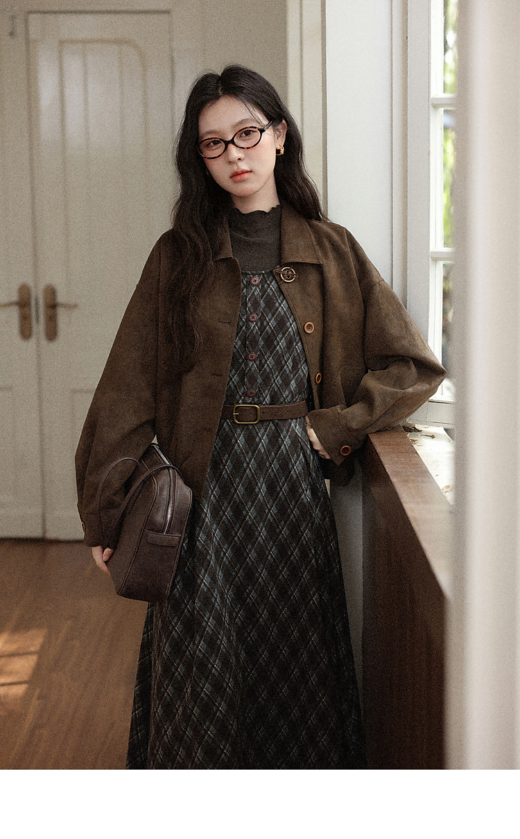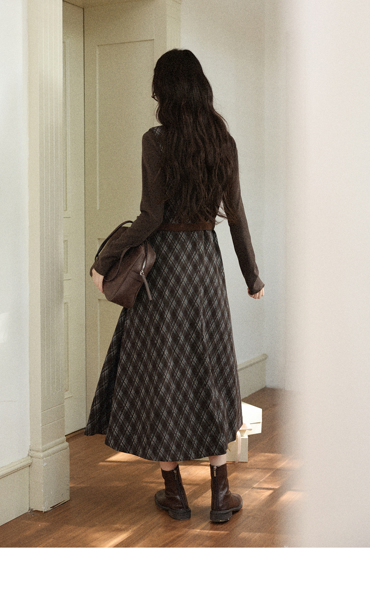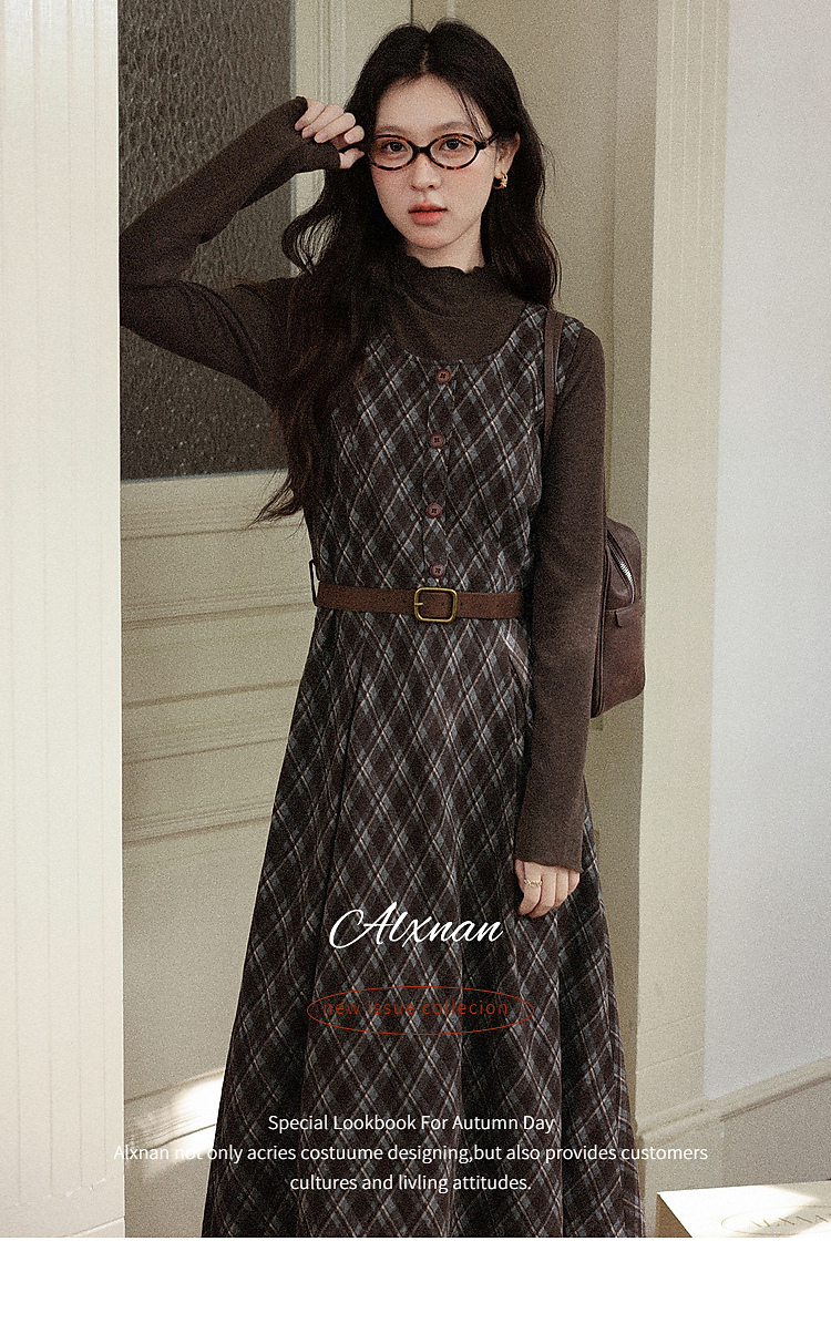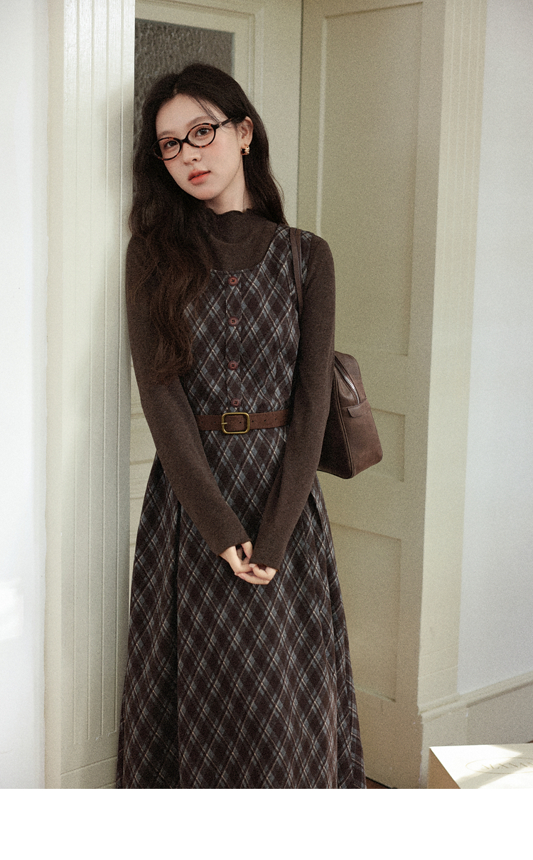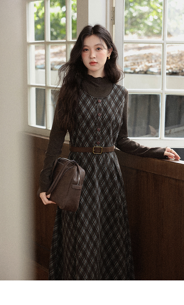 鹿向南「巴黎甜心」法式蓝咖格背心连衣裙女秋季气质显瘦A字长裙
