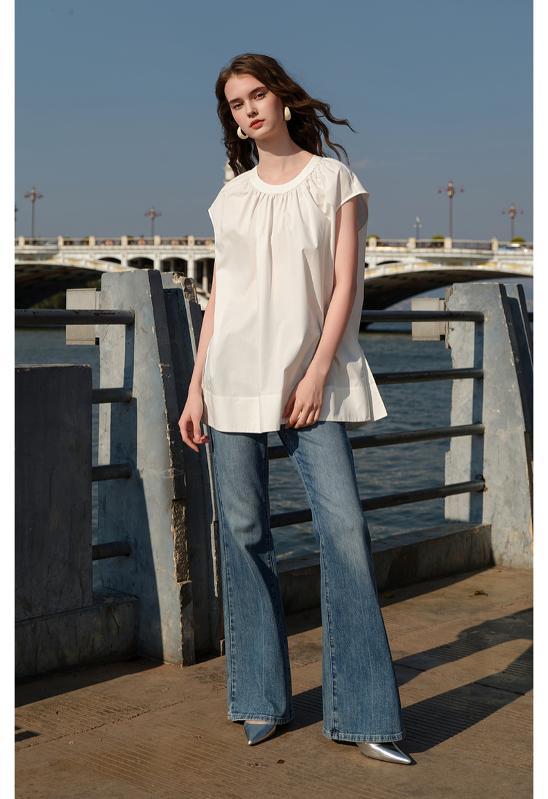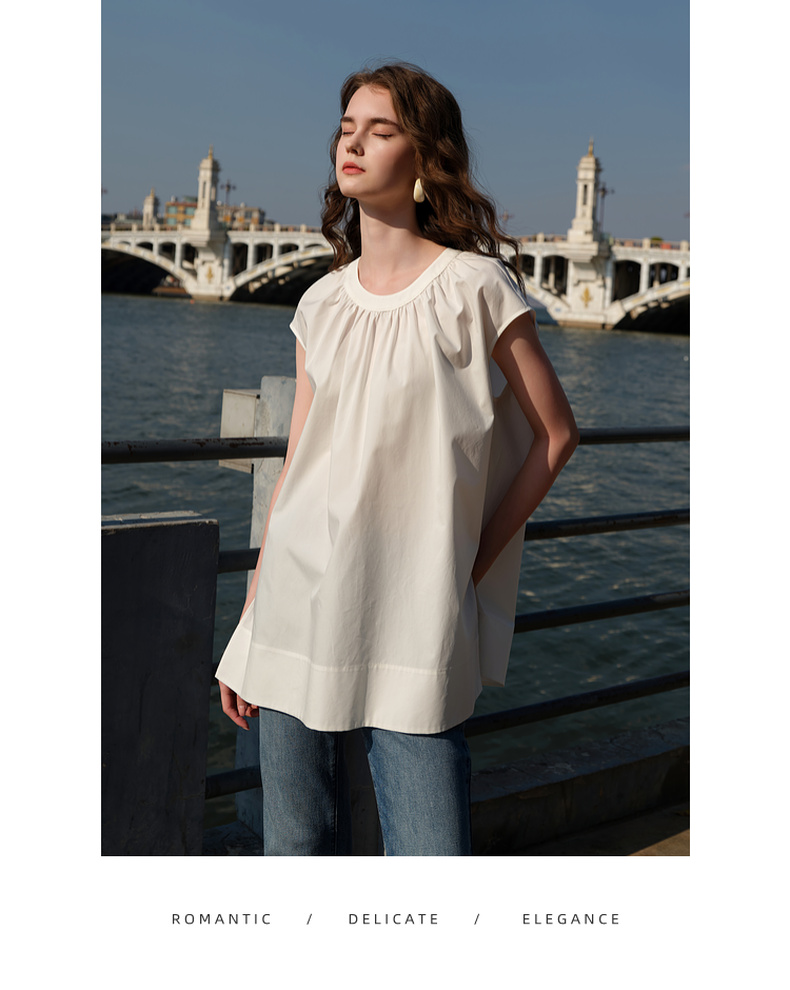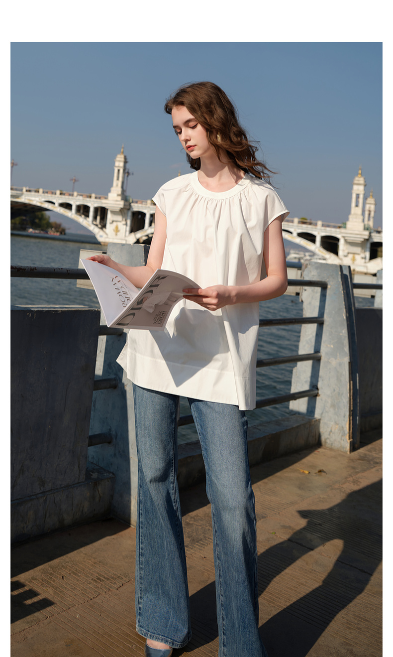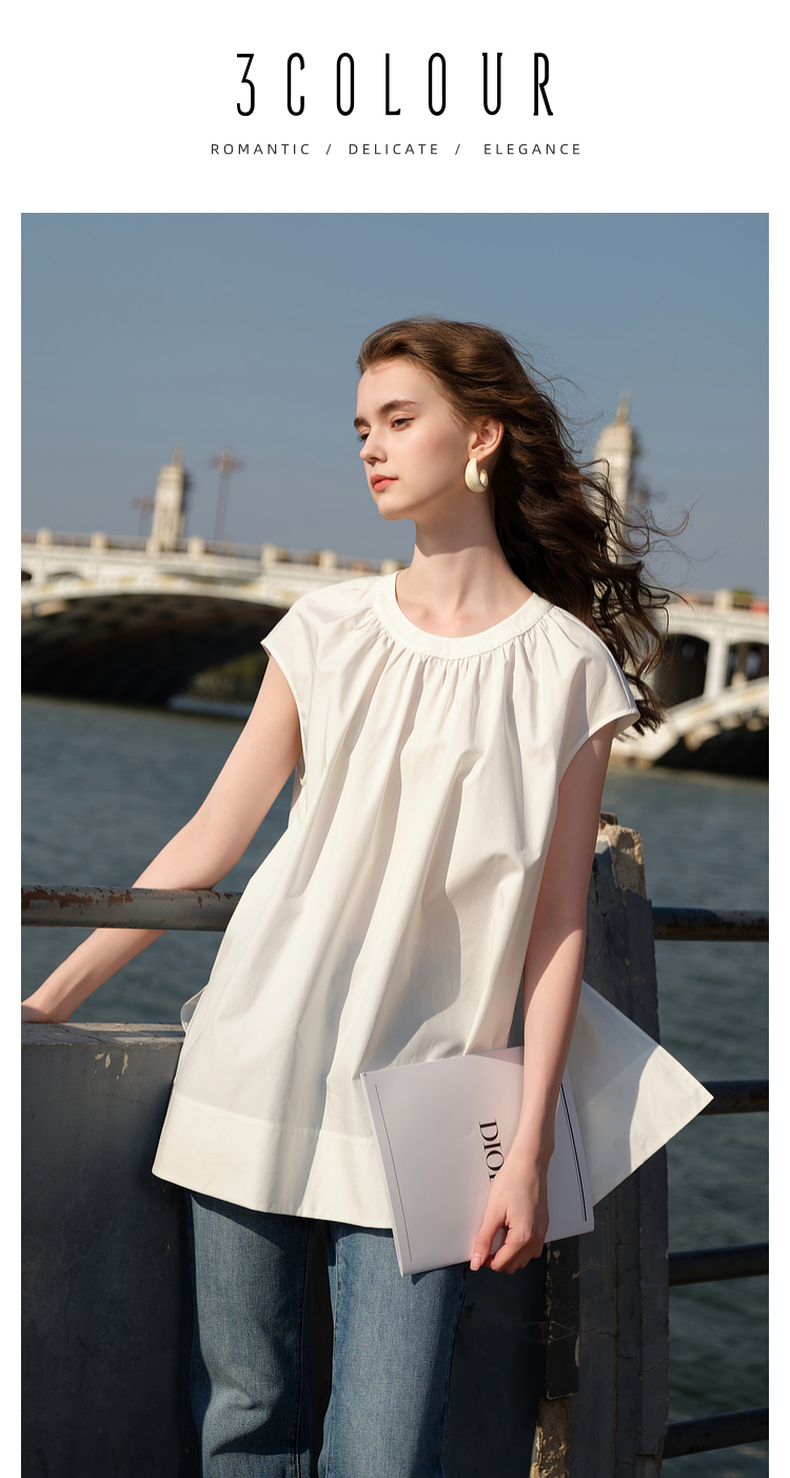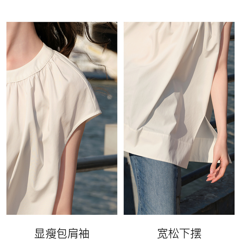 三彩2025夏季新款莱赛尔小衫圆领包肩袖上衣宽松极简风M