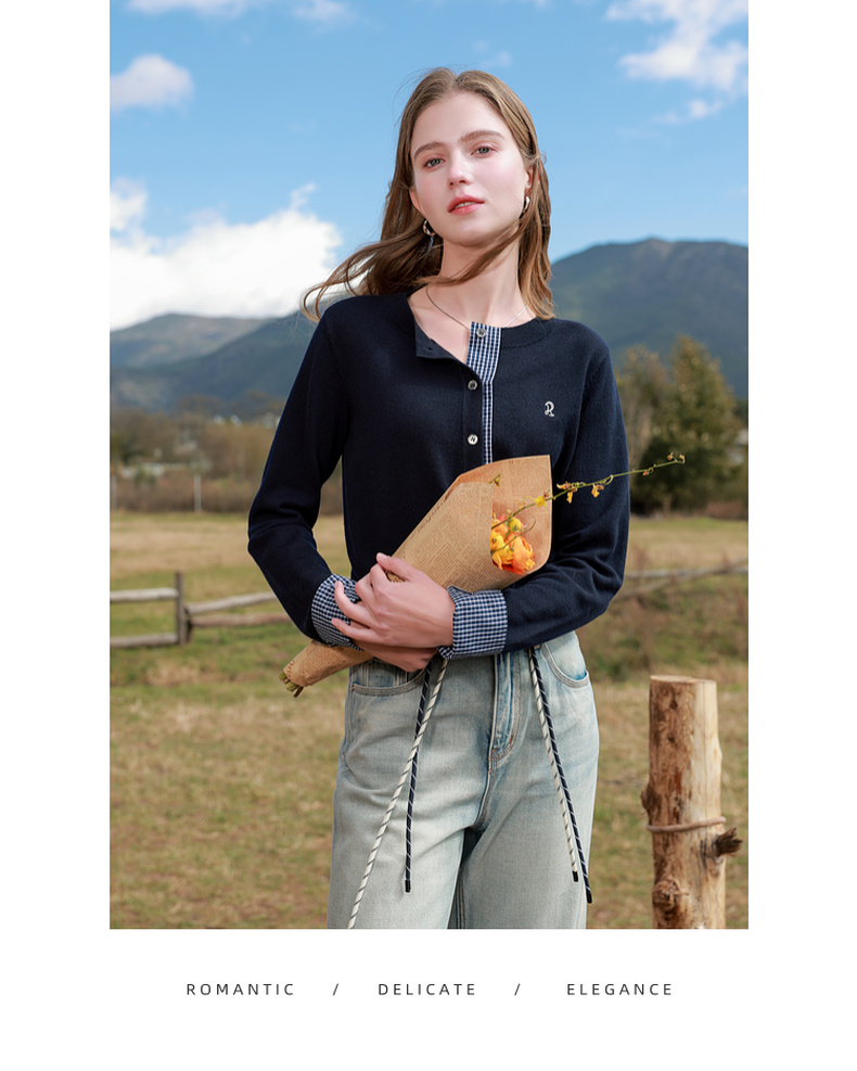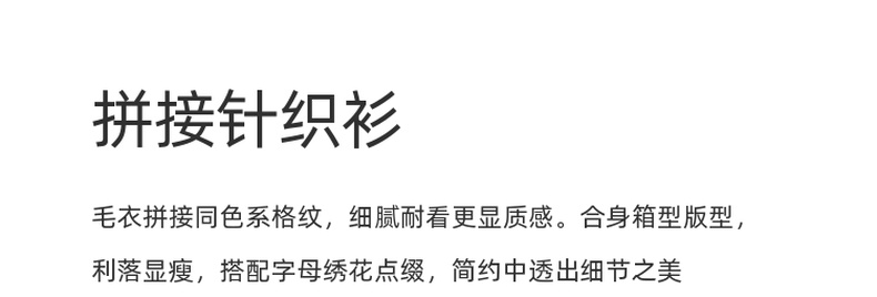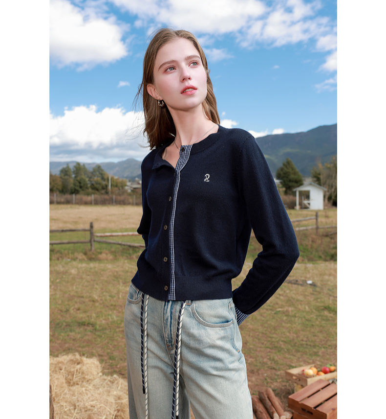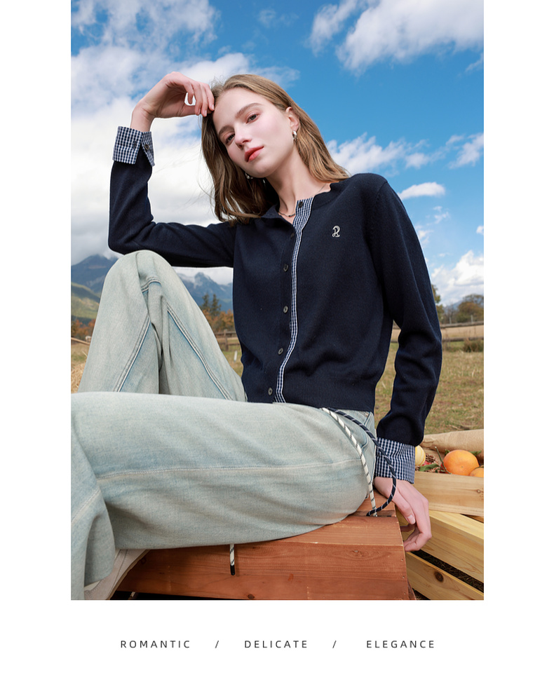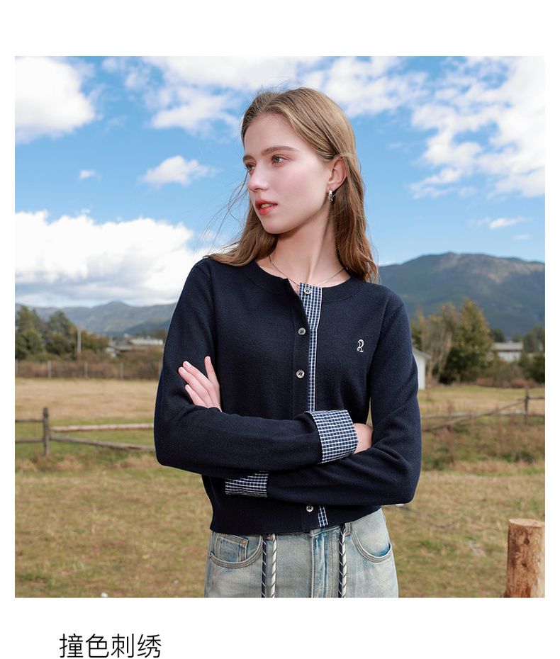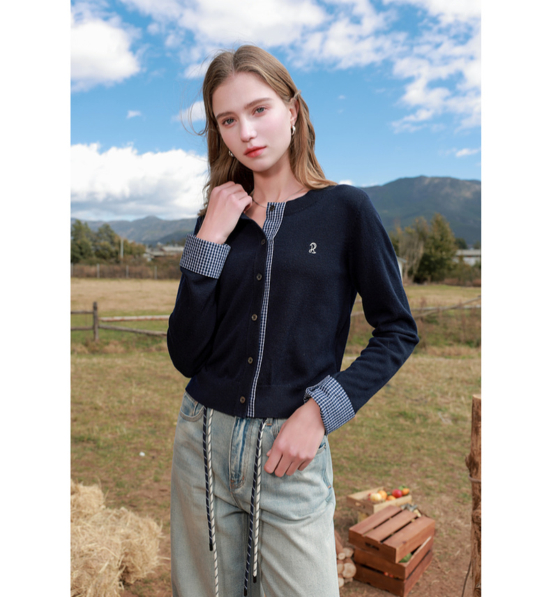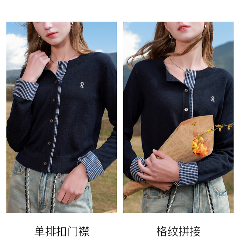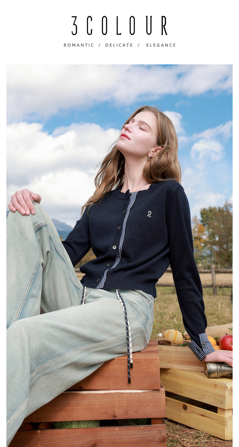 三彩2026春季新款格纹拼接针织衫圆领刺绣毛开衫短款休闲M