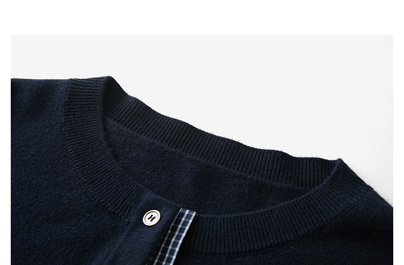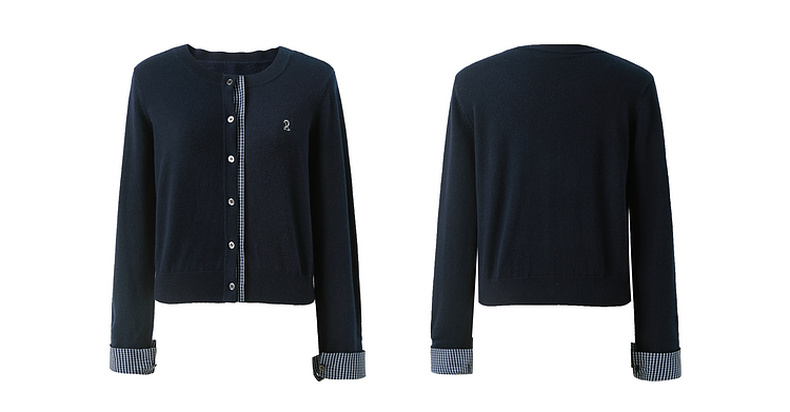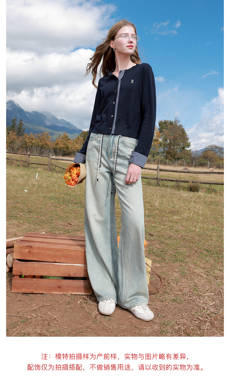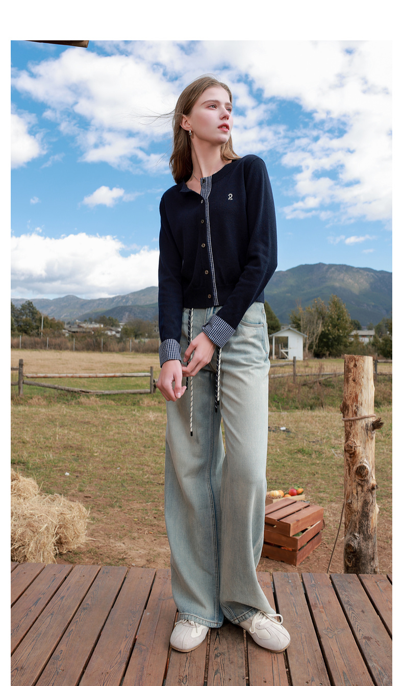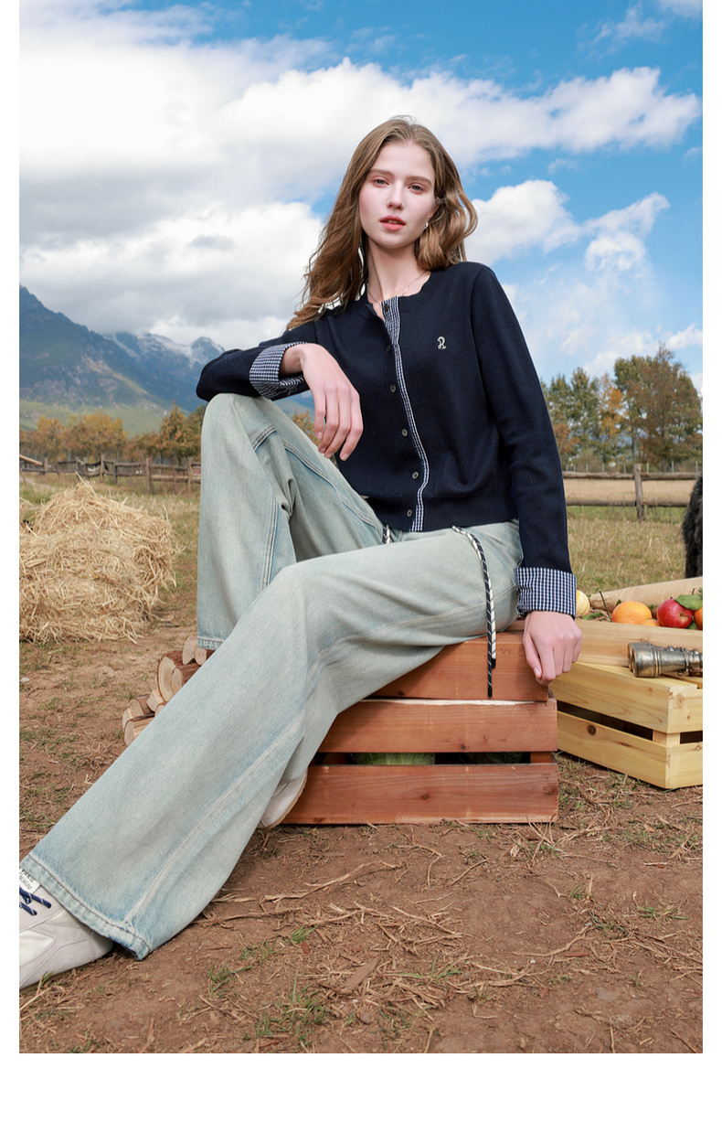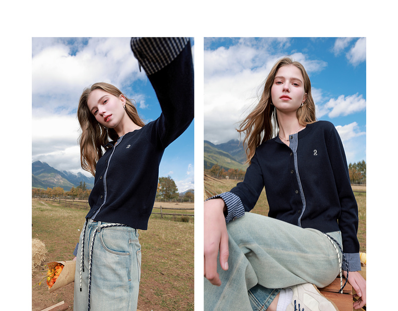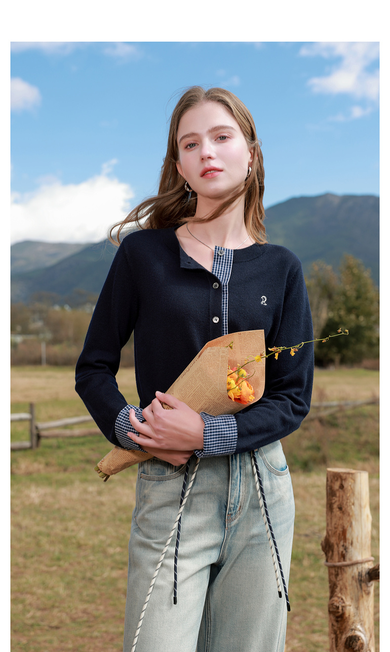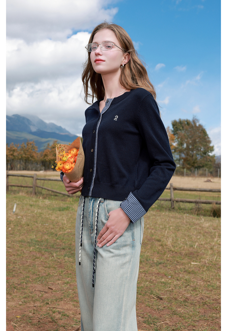 三彩2026春季新款格纹拼接针织衫圆领刺绣毛开衫短款休闲M