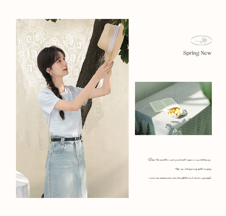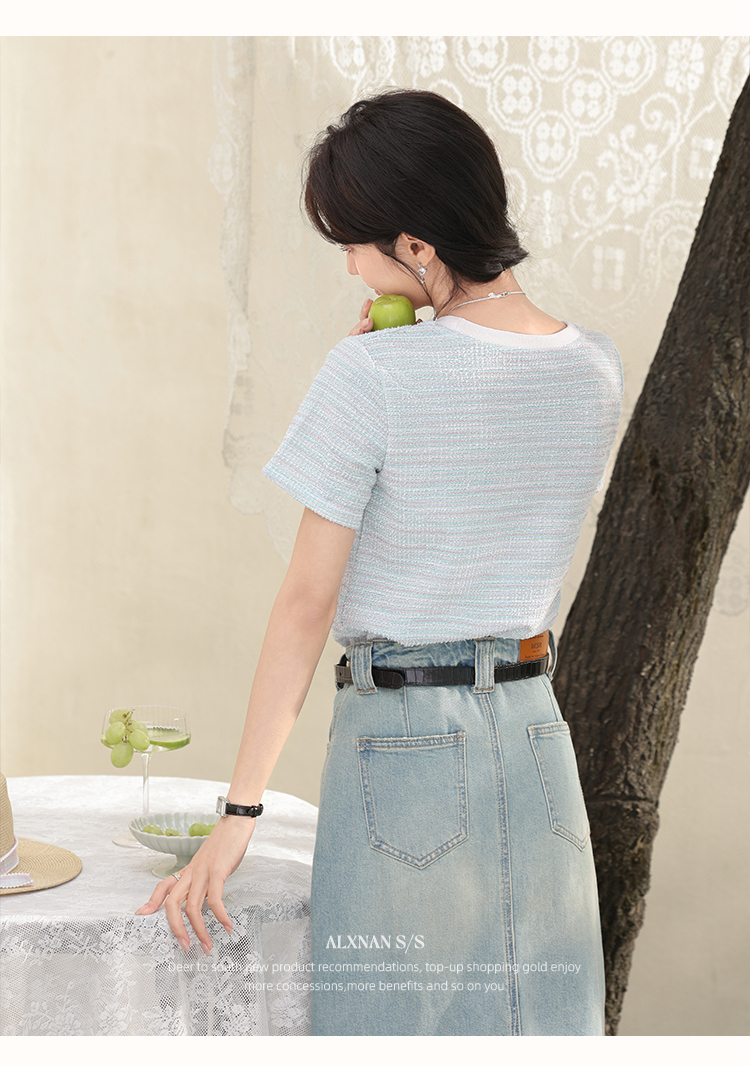 鹿向南「蓝色梦境」撞色圆领短袖T恤女夏季小香风肌理感正肩上衣