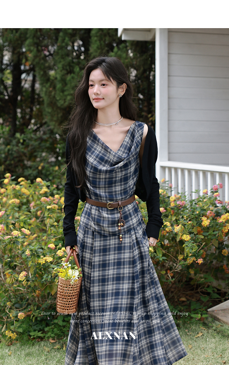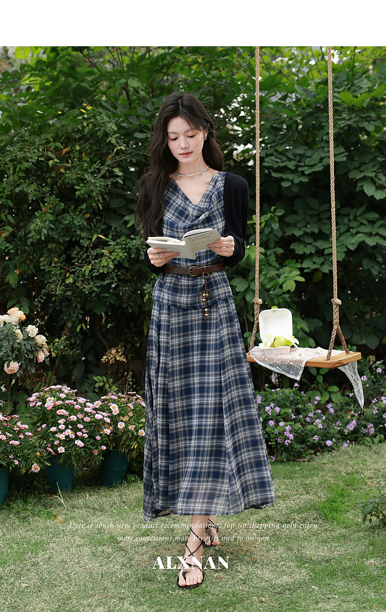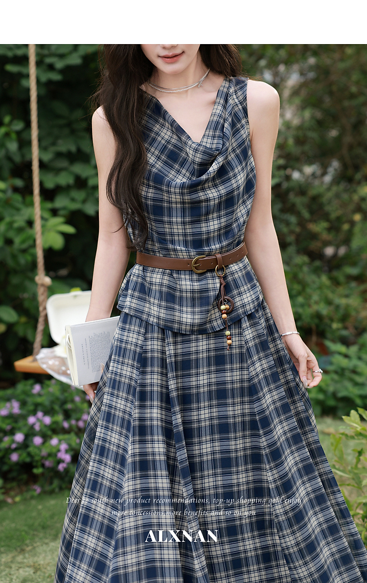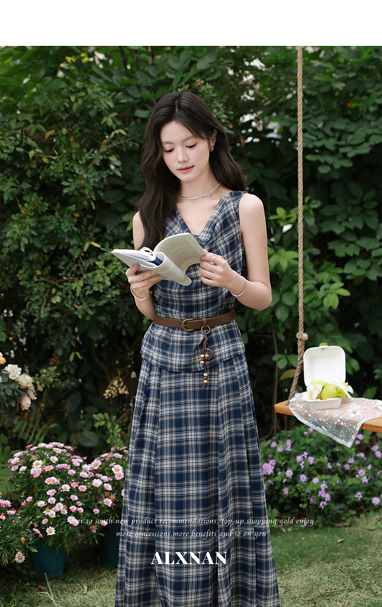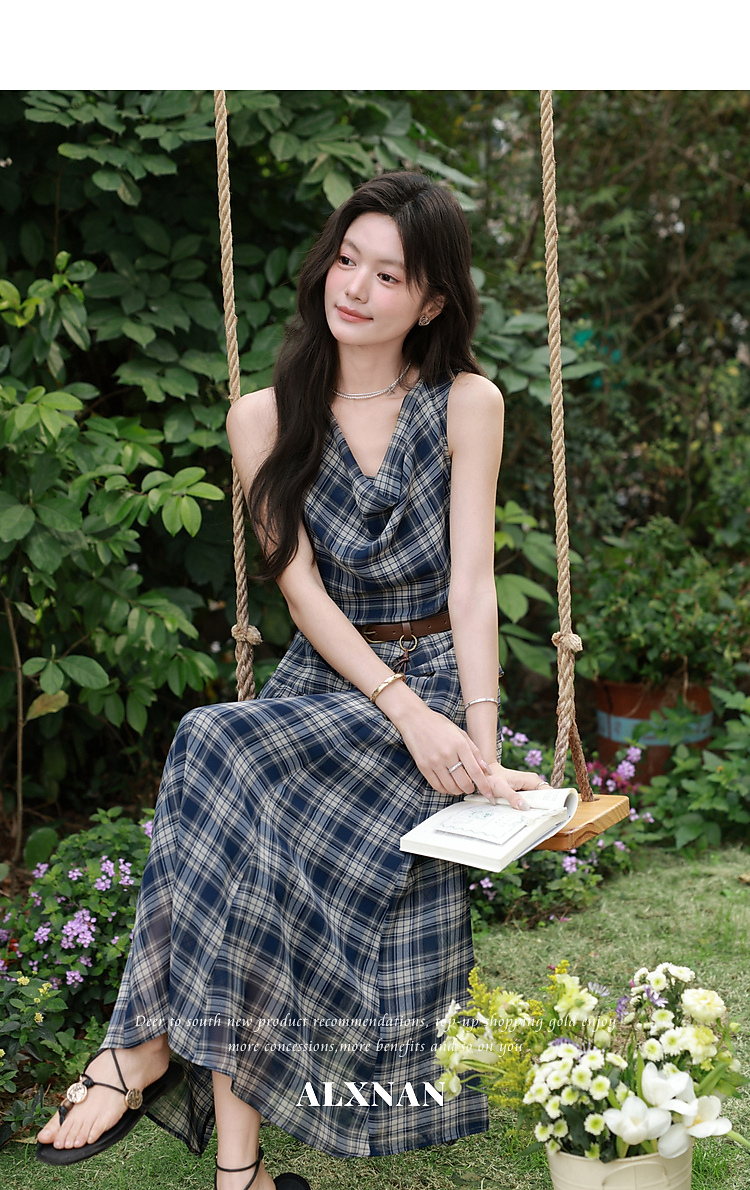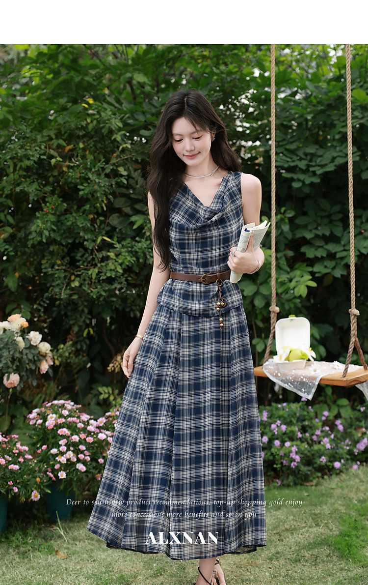 鹿向南「格韵时光」法式复古蓝格连衣裙女夏新款气质荡领无袖裙子