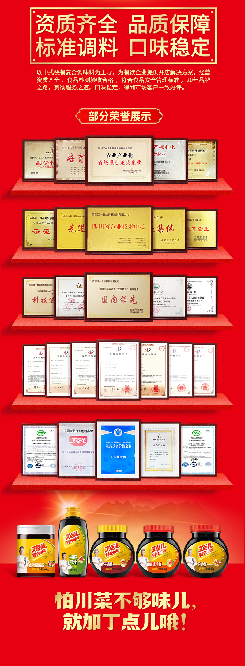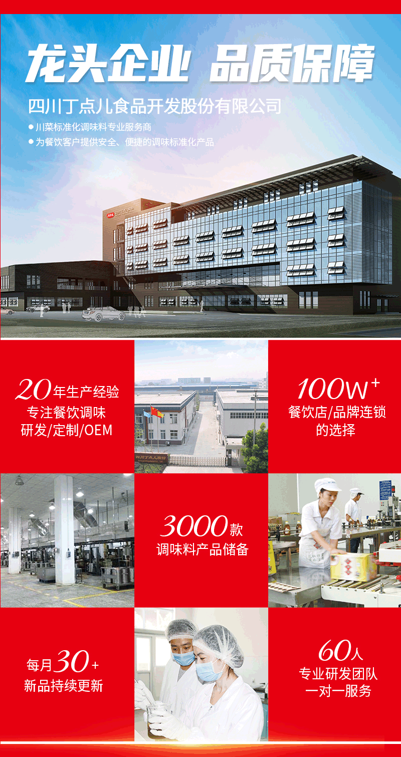四川丁点儿食品开发股份有限公司,是集川菜调味料研发、生产、销售、服务为一体的现代化企业,专注为餐饮客户提供川菜调味解决方案。公司成立至今,服务了超百万家的餐饮门店以及连锁品牌。