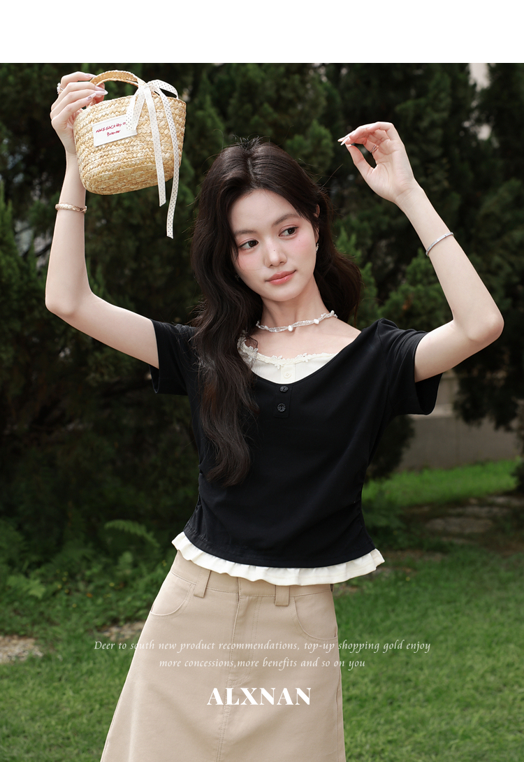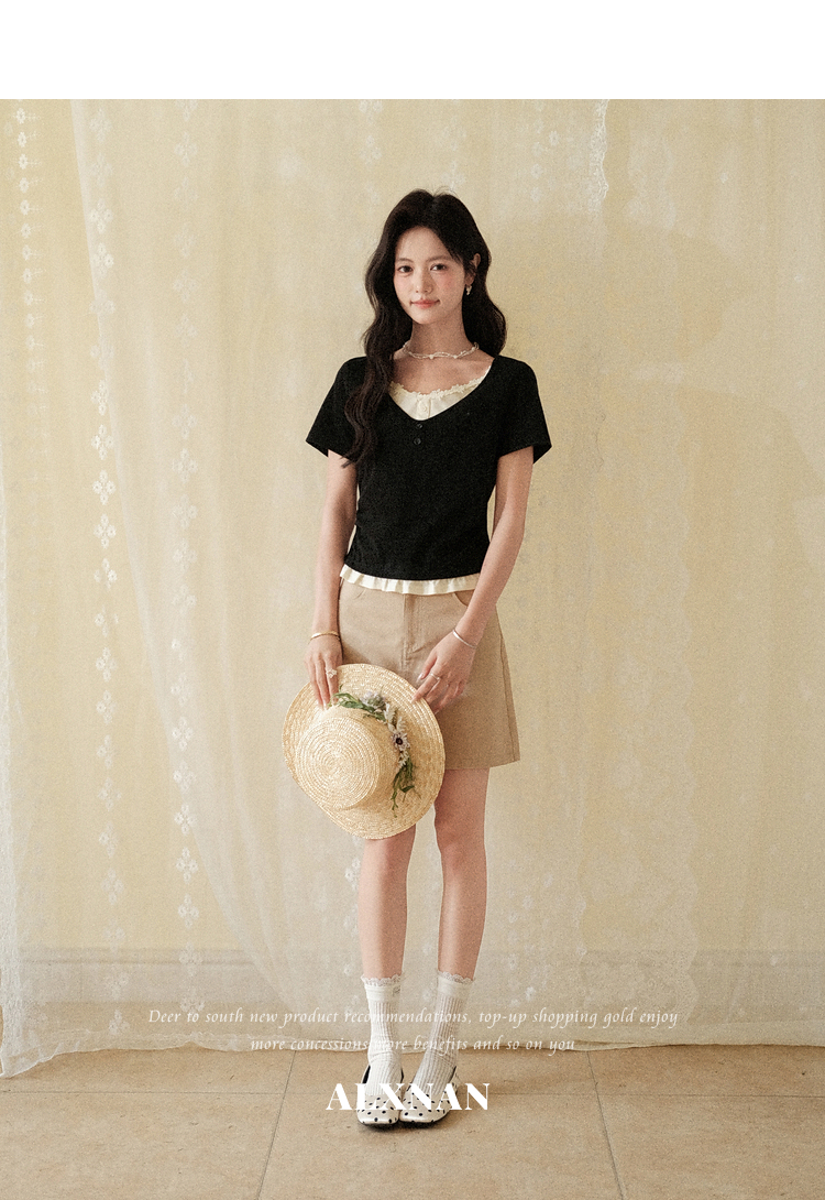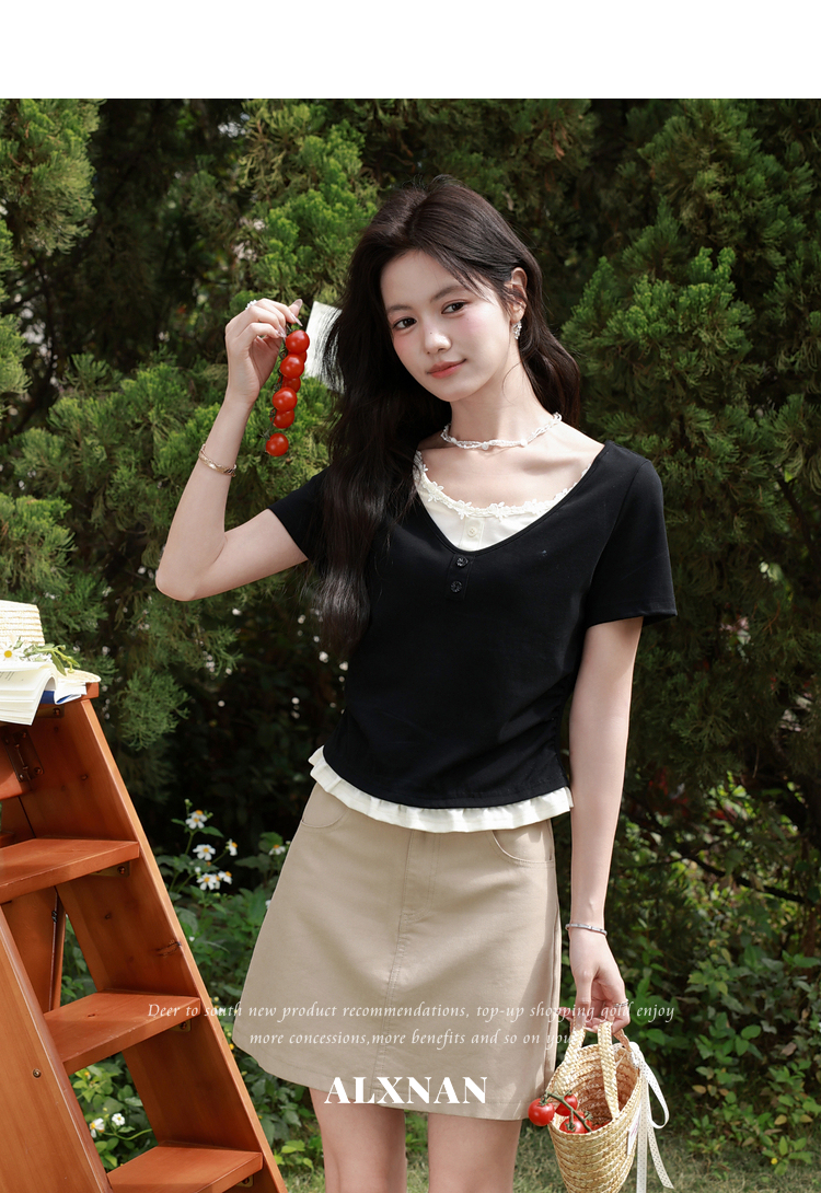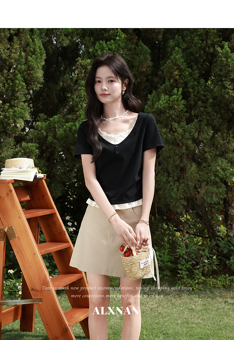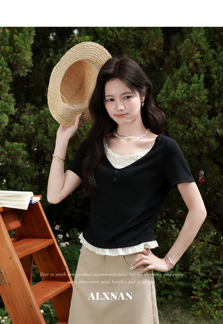鹿向南【0331/20:00新品前1小时7折限量100件】黑色假两件短袖T恤