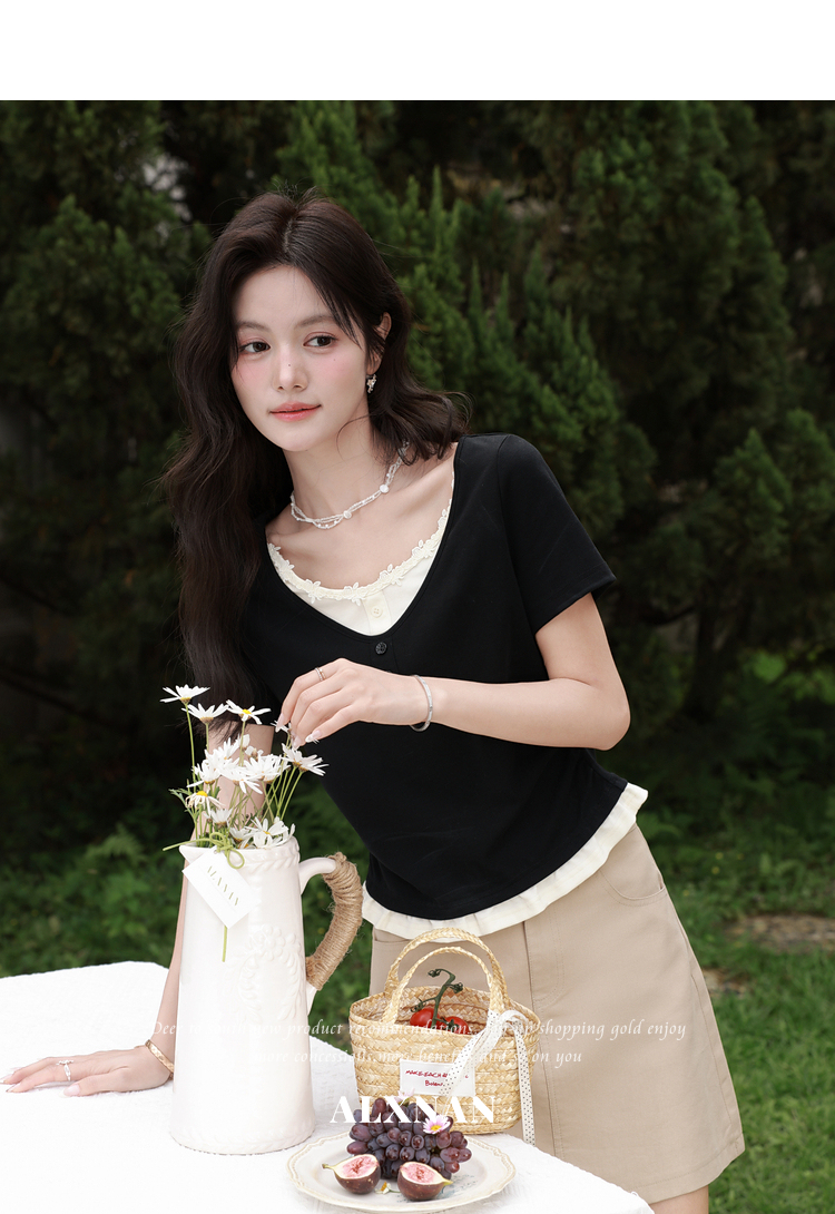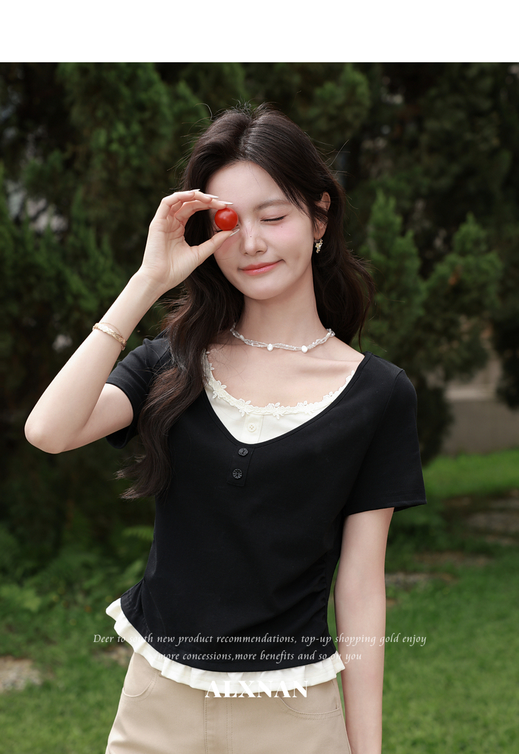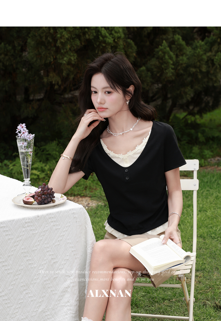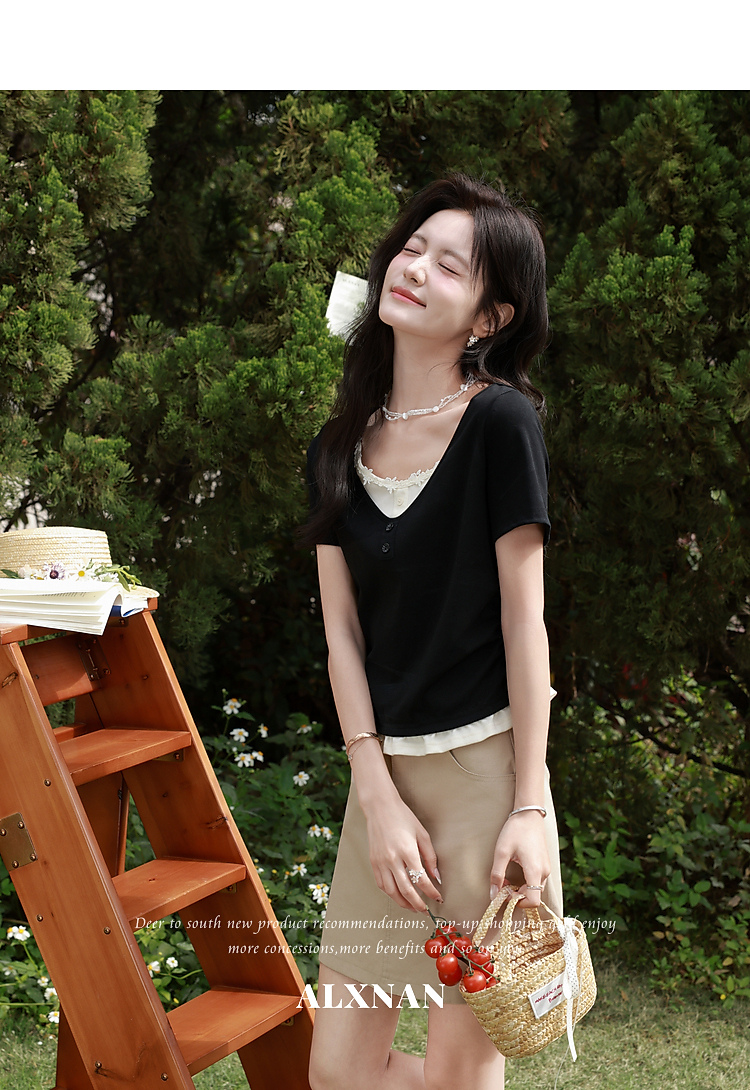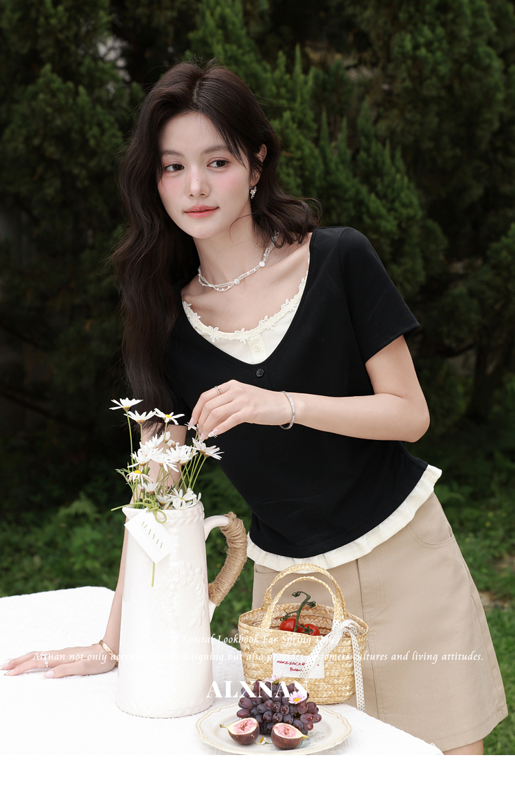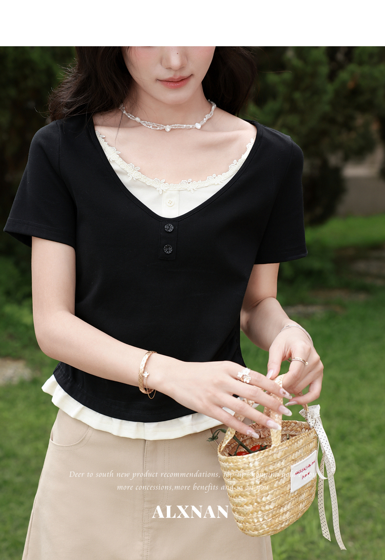 鹿向南【0331/20:00新品前1小时7折限量100件】黑色假两件短袖T恤
