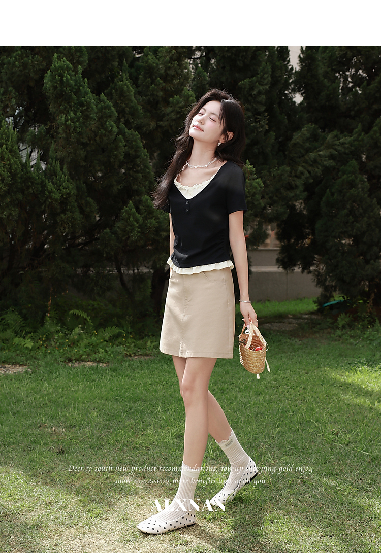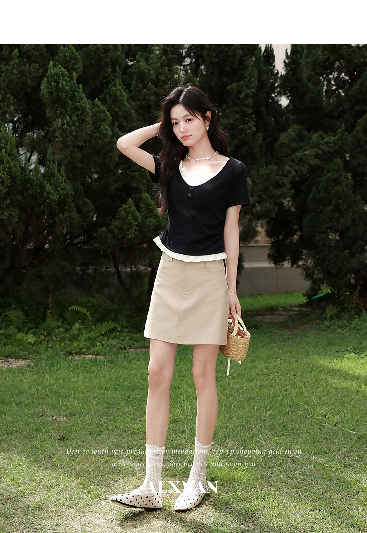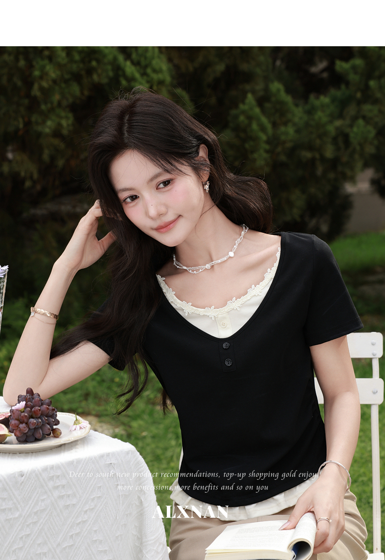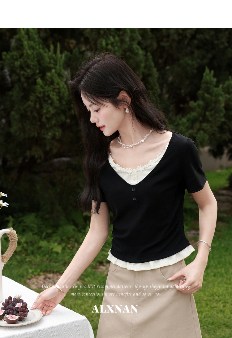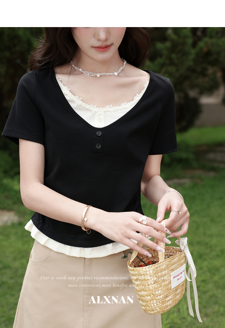 鹿向南【0331/20:00新品前1小时7折限量100件】黑色假两件短袖T恤